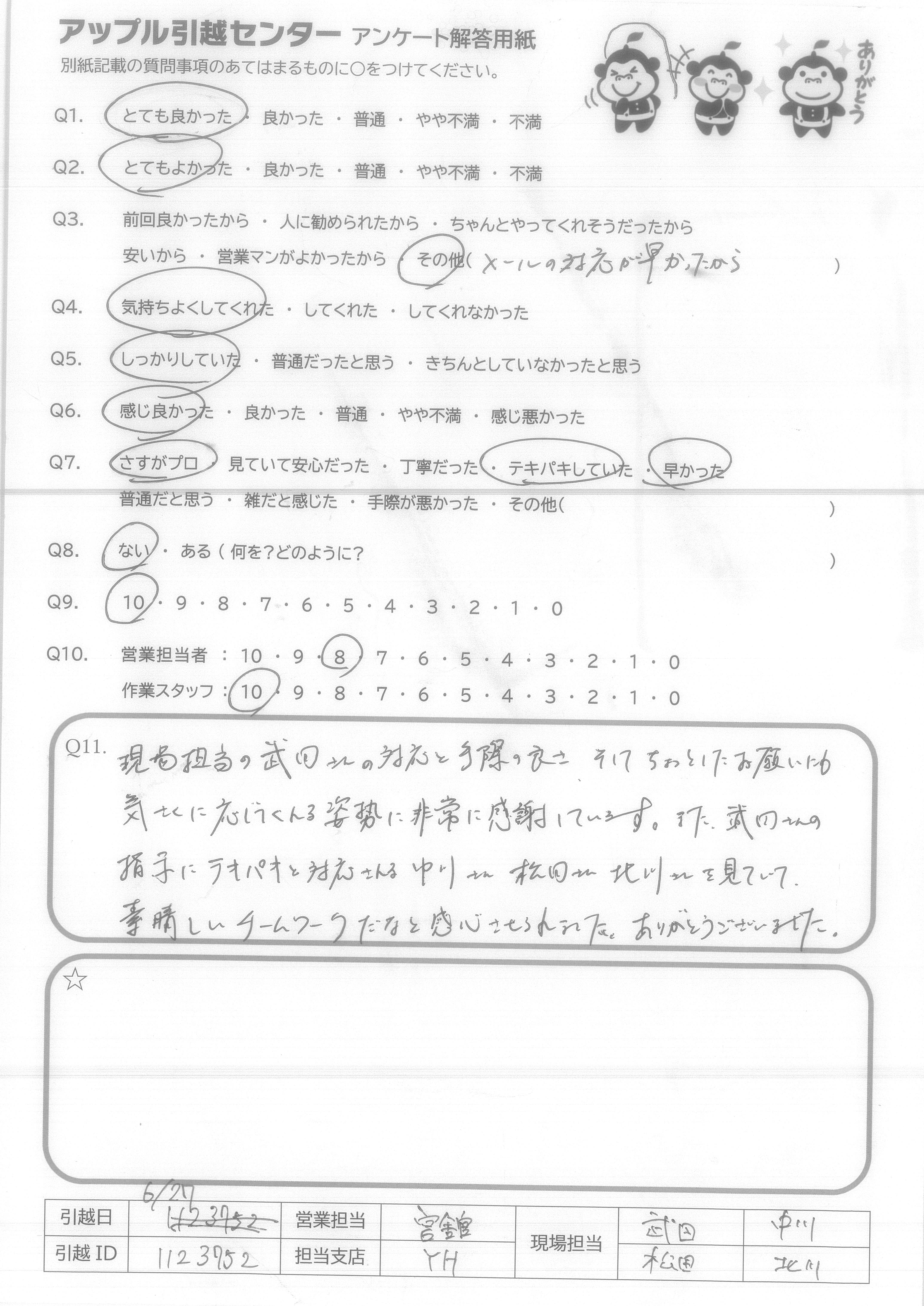 A.現場担当の武田さんの対応と手際の良さ、そしてちょっとしたお願いにも気さくに対応してくれる姿勢に非常に感謝しています。また武田さんも指示にテキパキと対応される中川さん松田さん北側さんを見ていて素晴しいチームワークだなと感心させられた。ありがとうございました。