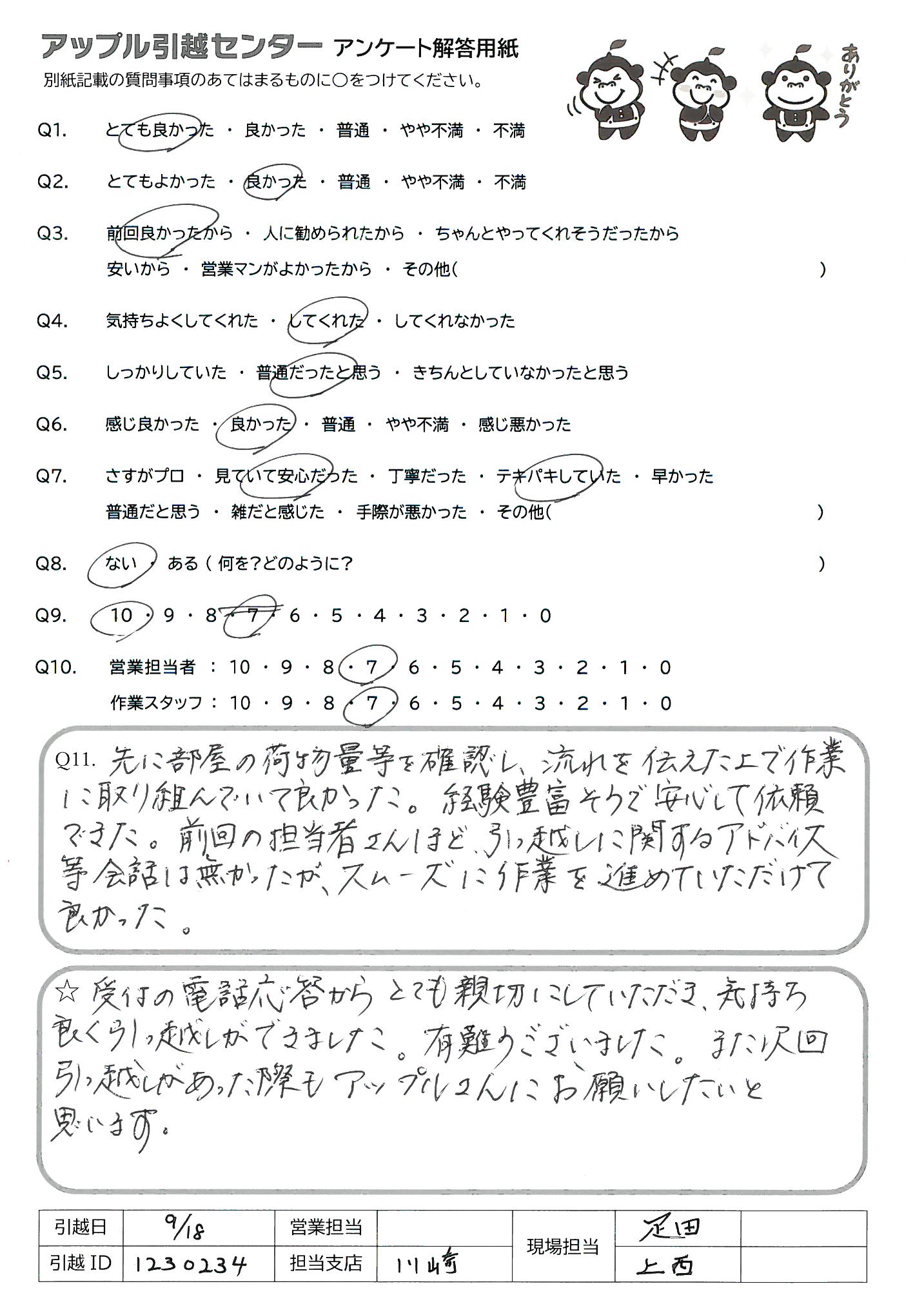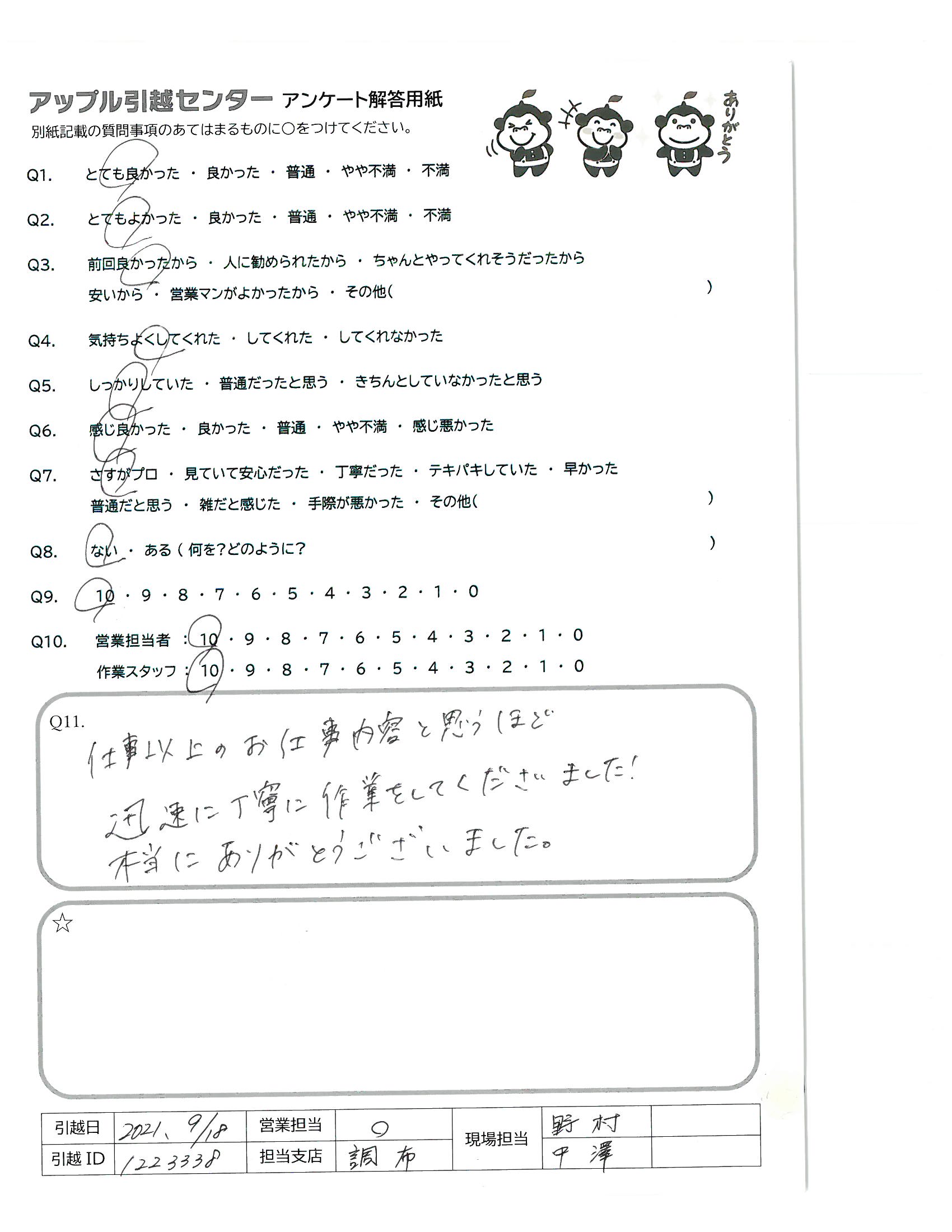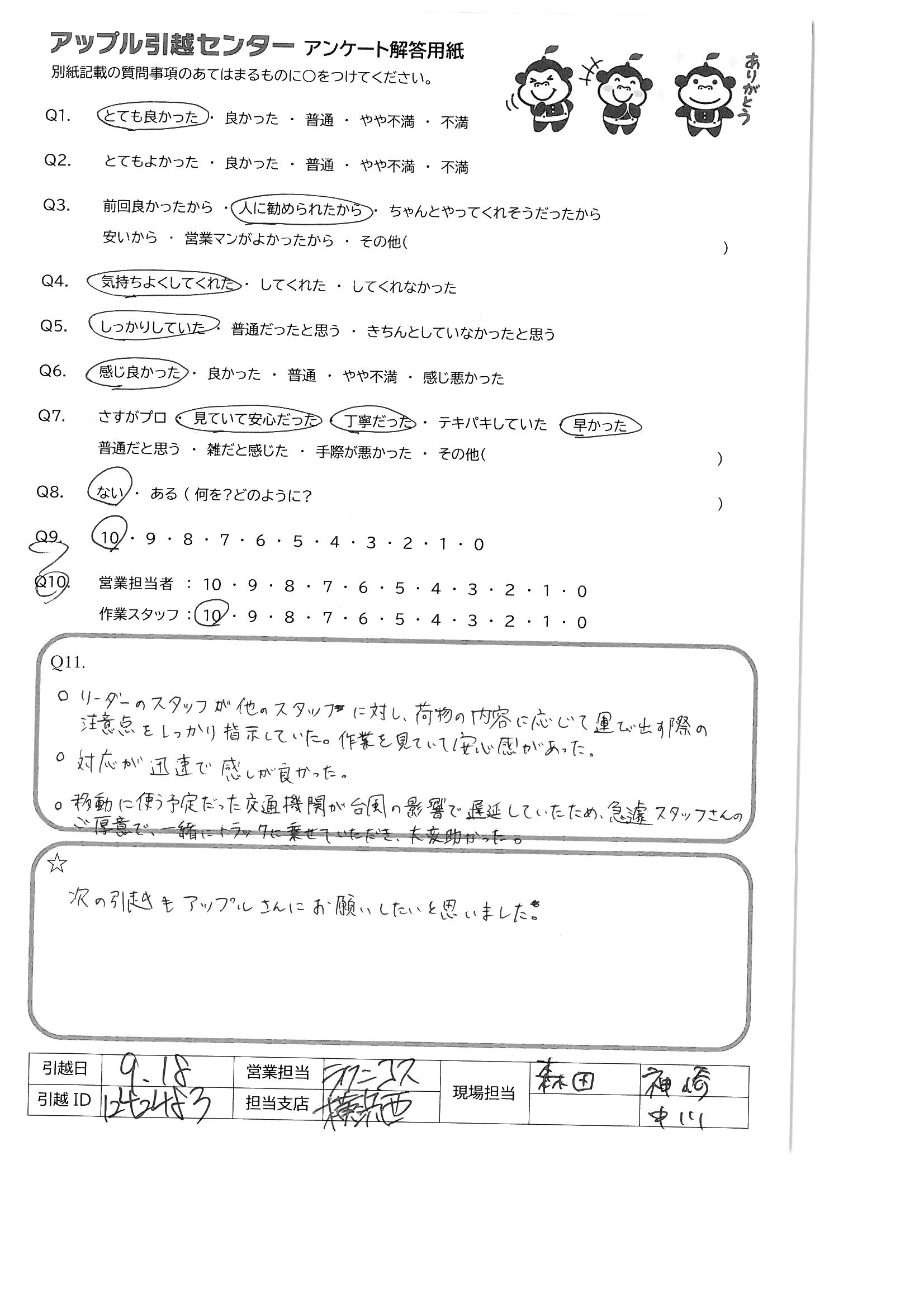 A.受付の電話応答からとても親切にしていただき、気持ち良く引っ越しができました。有難うございました。また次回引っ越しがあった際もアップルさんにお願いしたいと思います。