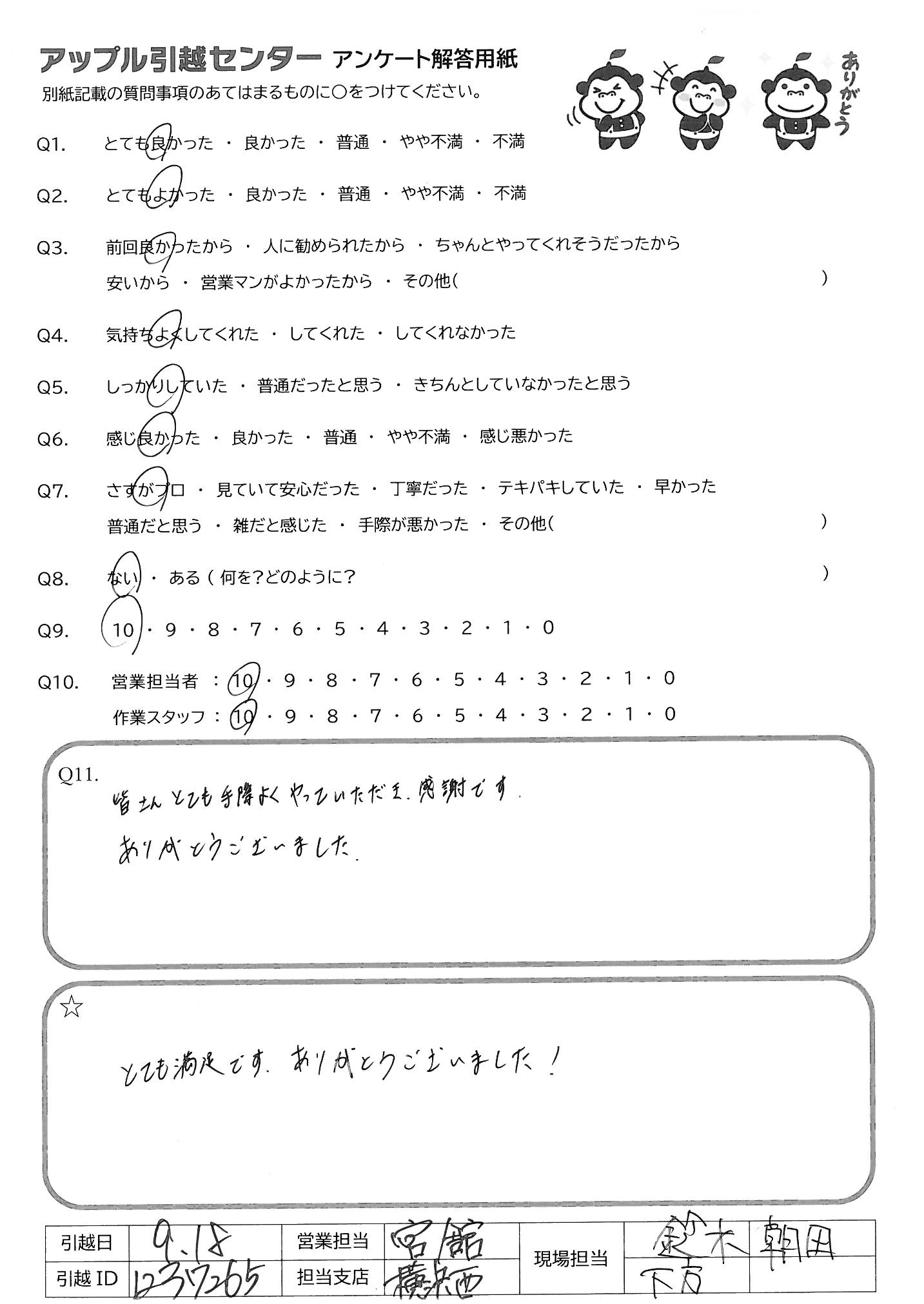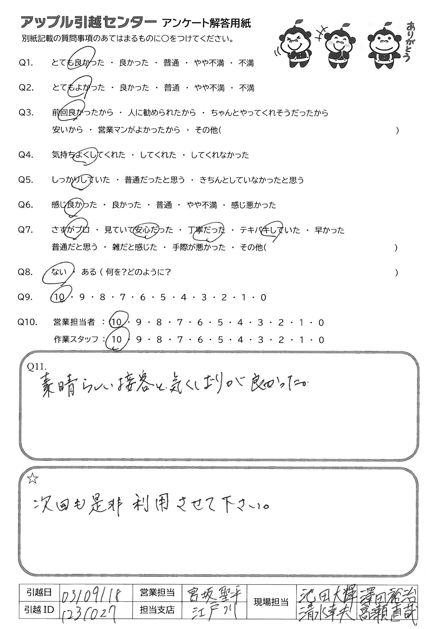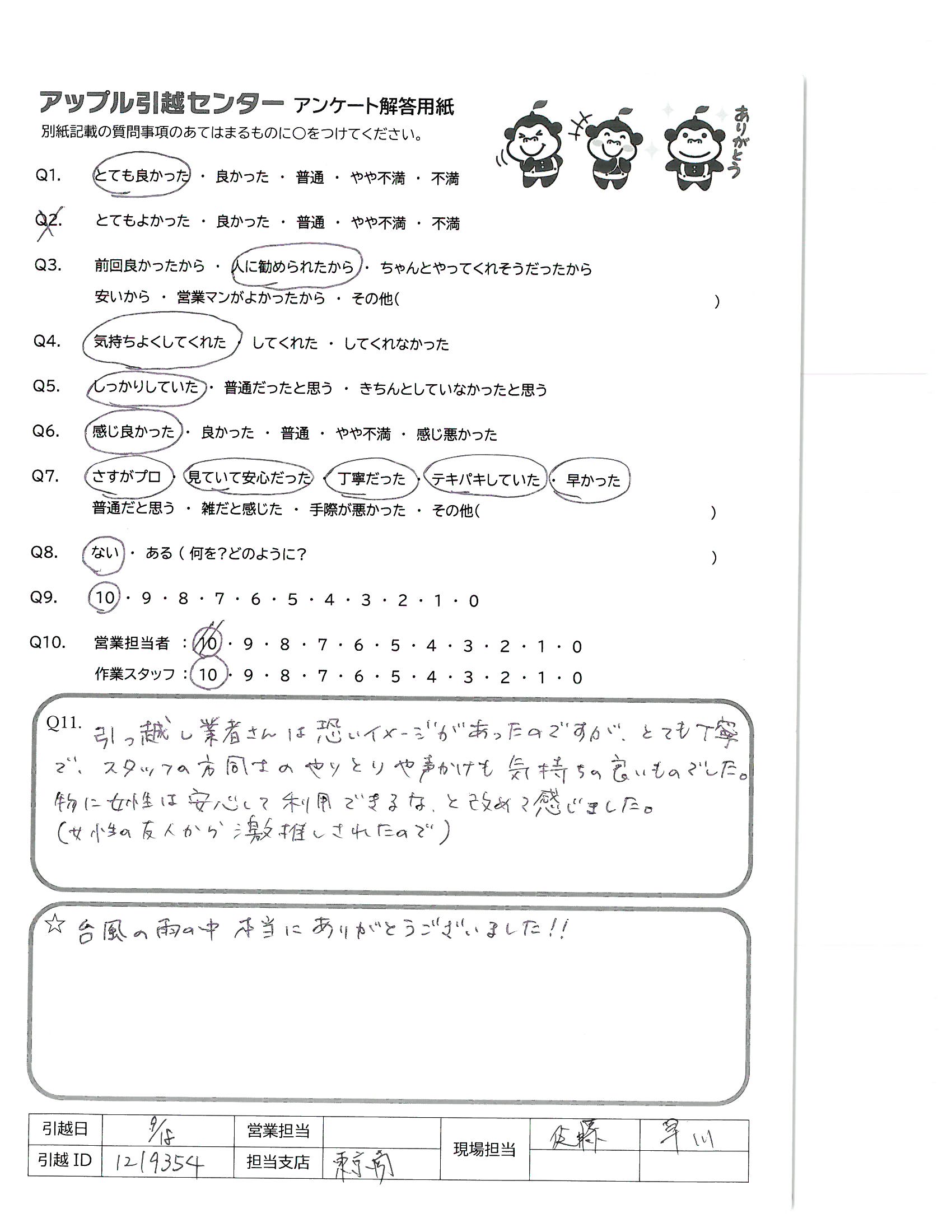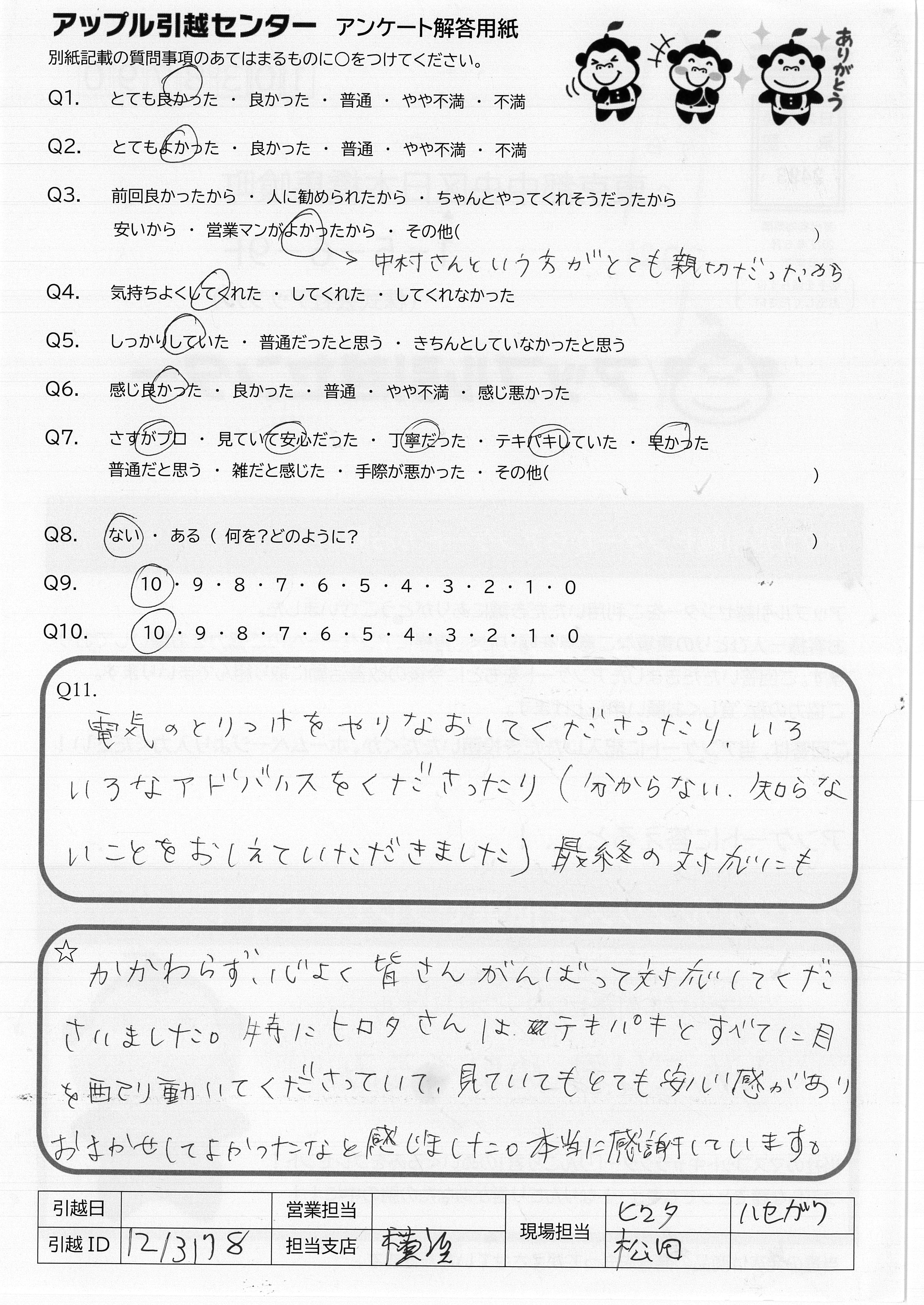 A.受付の電話応答からとても親切にしていただき、気持ち良く引っ越しができました。有難うございました。また次回引っ越しがあった際もアップルさんにお願いしたいと思います。