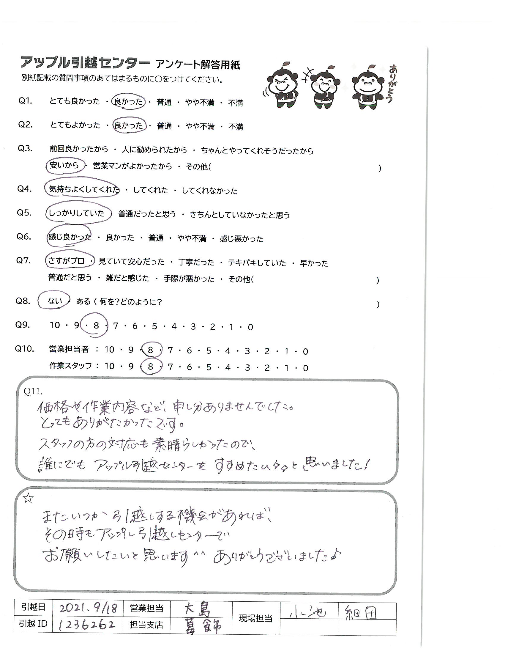 A.次の引越もアップルさんにお願いしたいと思いました!