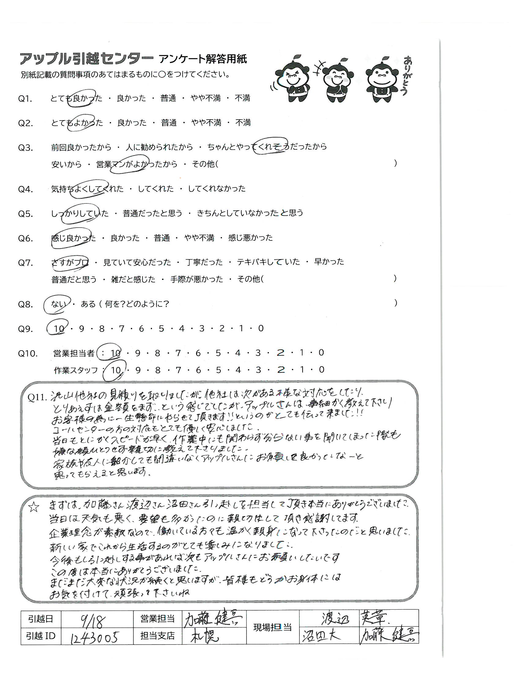 A.まずは、加藤さん渡辺さん沼田さん引越しを担当して頂き本当にありがとうございました。当日は天気も悪く、要望も多かったのに親切にして頂き感謝してます。企業理念が素敵なので、働いている方々も温かく親身になって下さったのだと思いました。新しい家でこれから生活するのがとても楽しみになりました。 今後もし引っ越しする事があれば次もアップルさんにお願いしたいです。 この度は本当にありがとうございました。 まだまだ大変な状況が続くと思いますが、皆様もどうかお身体にはお気を付けて、頑張ってくださいね