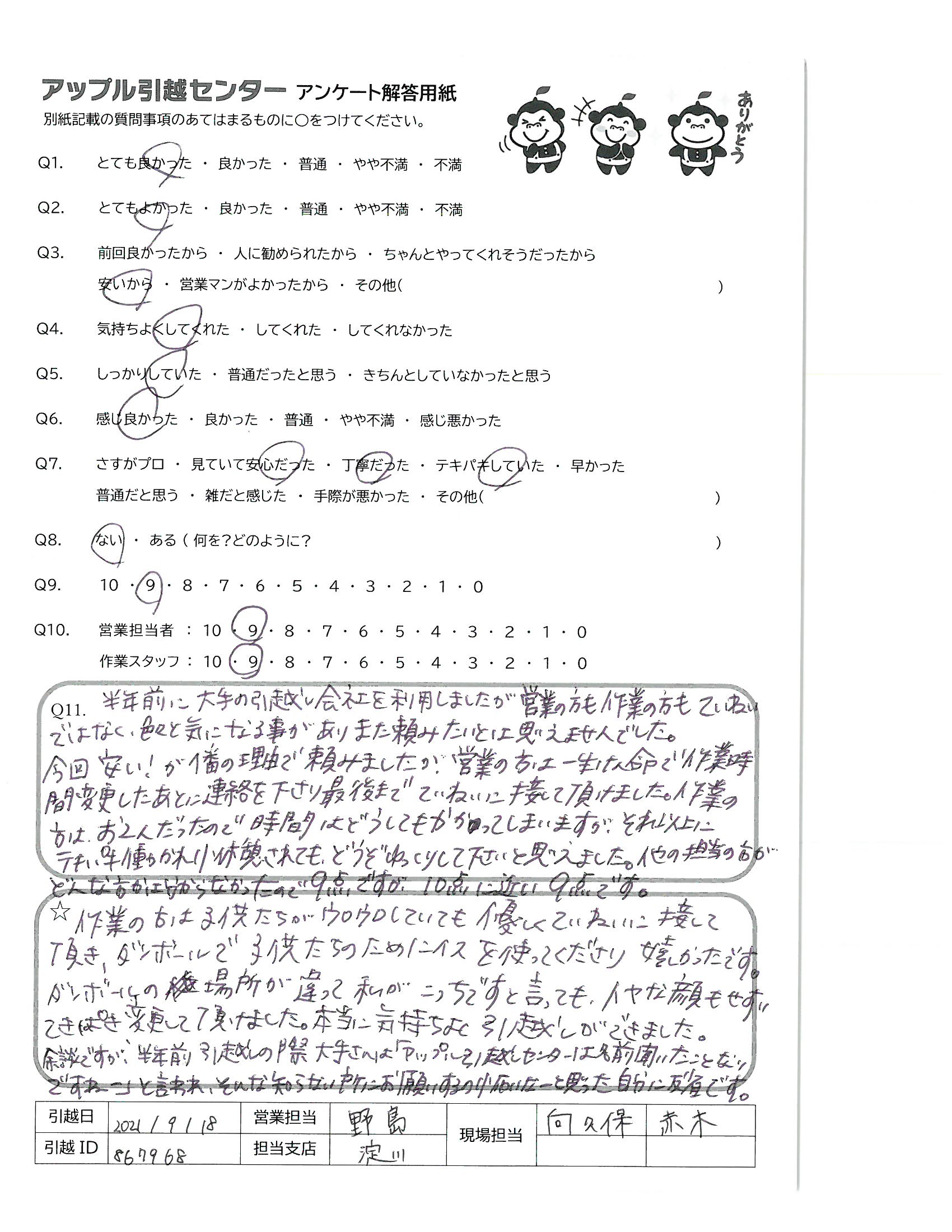 引越し日:2021年09月18日 エリア:神奈川県川崎市宮前区
