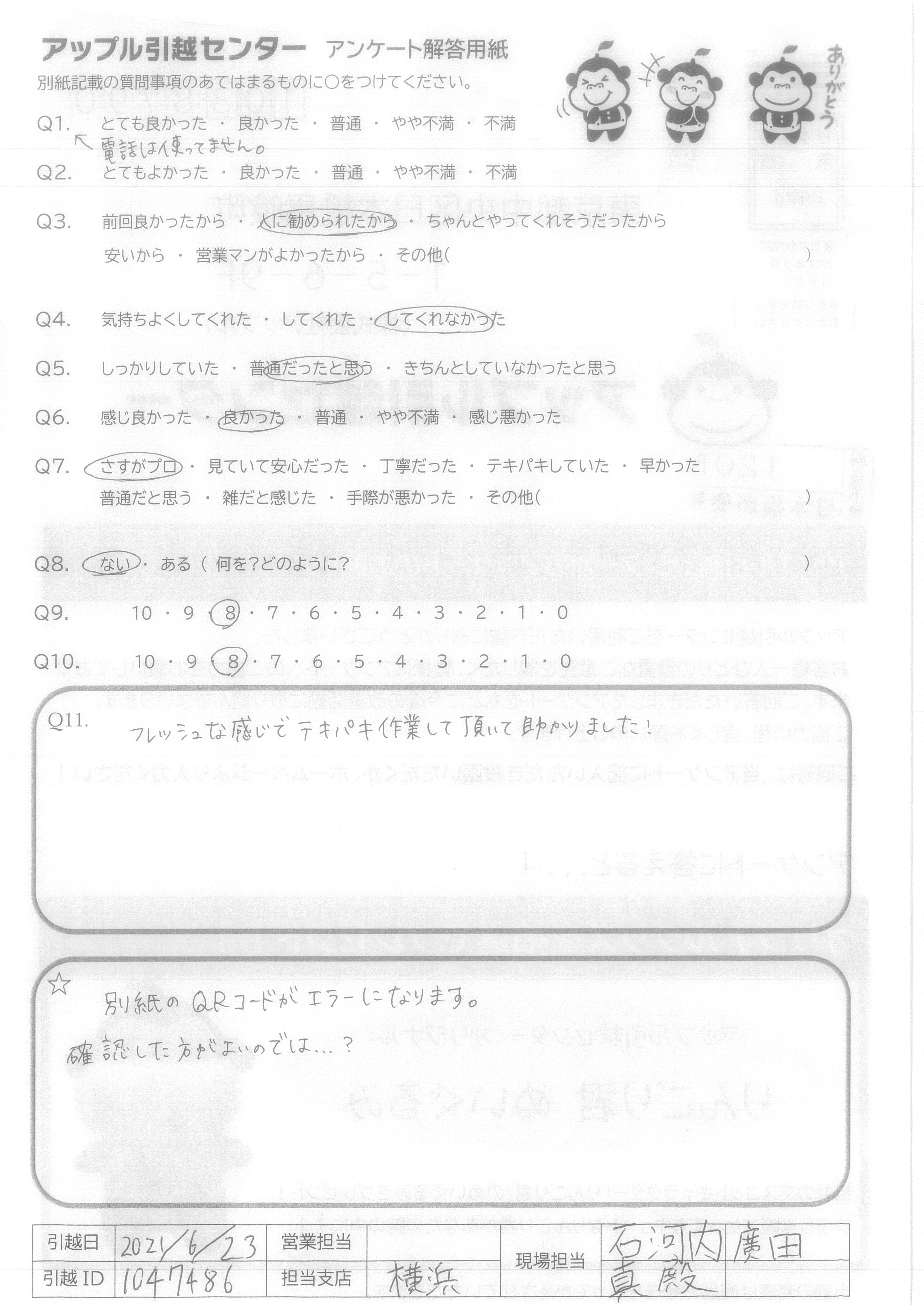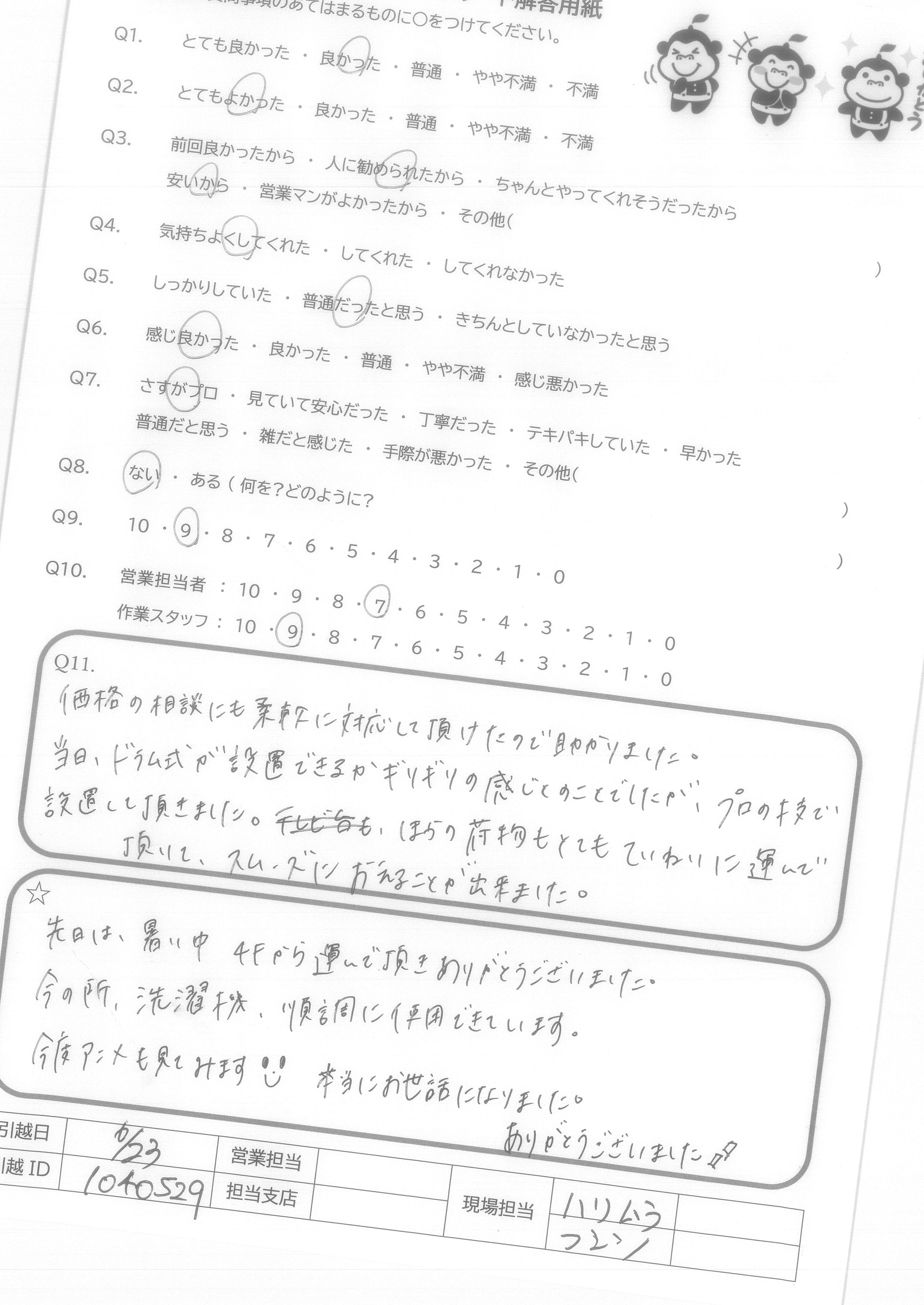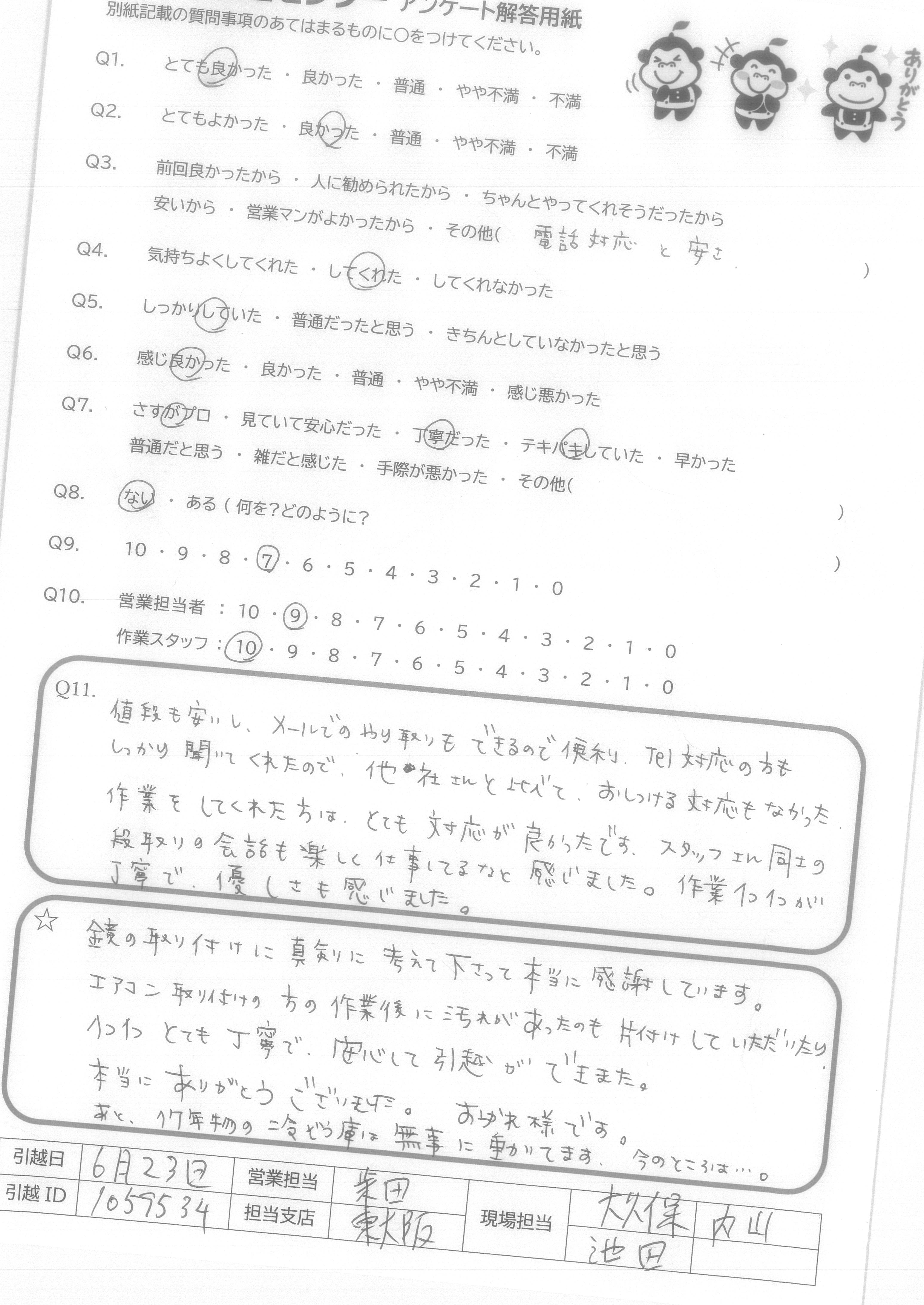 A.とにかく手際が良く、重い荷物もさっさと運んでくれました。感謝です。大変助かりました。ありがとうございました。