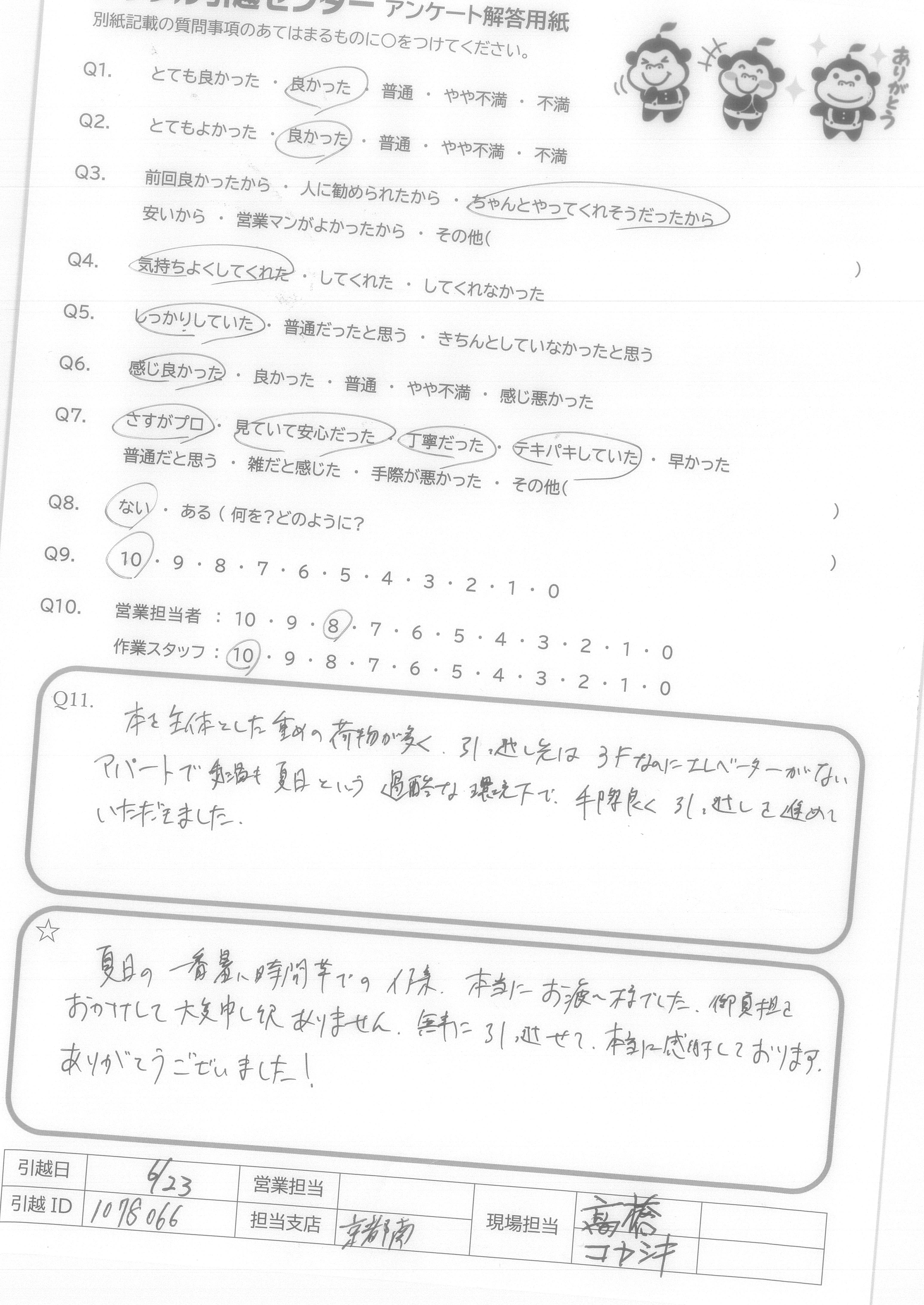 A.本を主体とした重めの荷物が多く、引っ越し先は3Fなのにエレベーターがないアパートで気温も夏日という過酷な環境下の中で手際良く引っ越しを進めていただきました。
