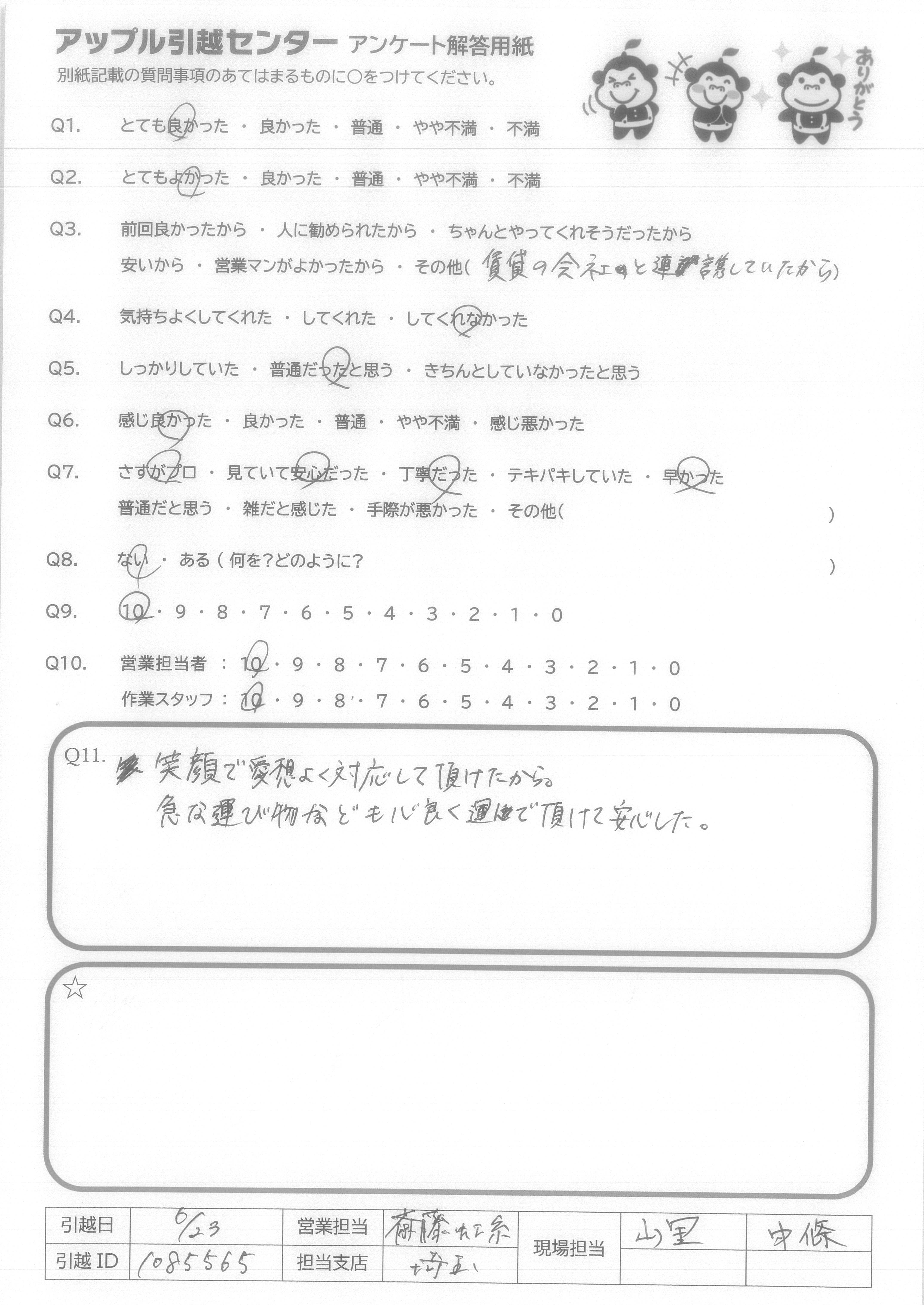 A.笑顔で愛想よく対応して頂けたから。 急な運び物なども心良く運んで頂けて安心した。