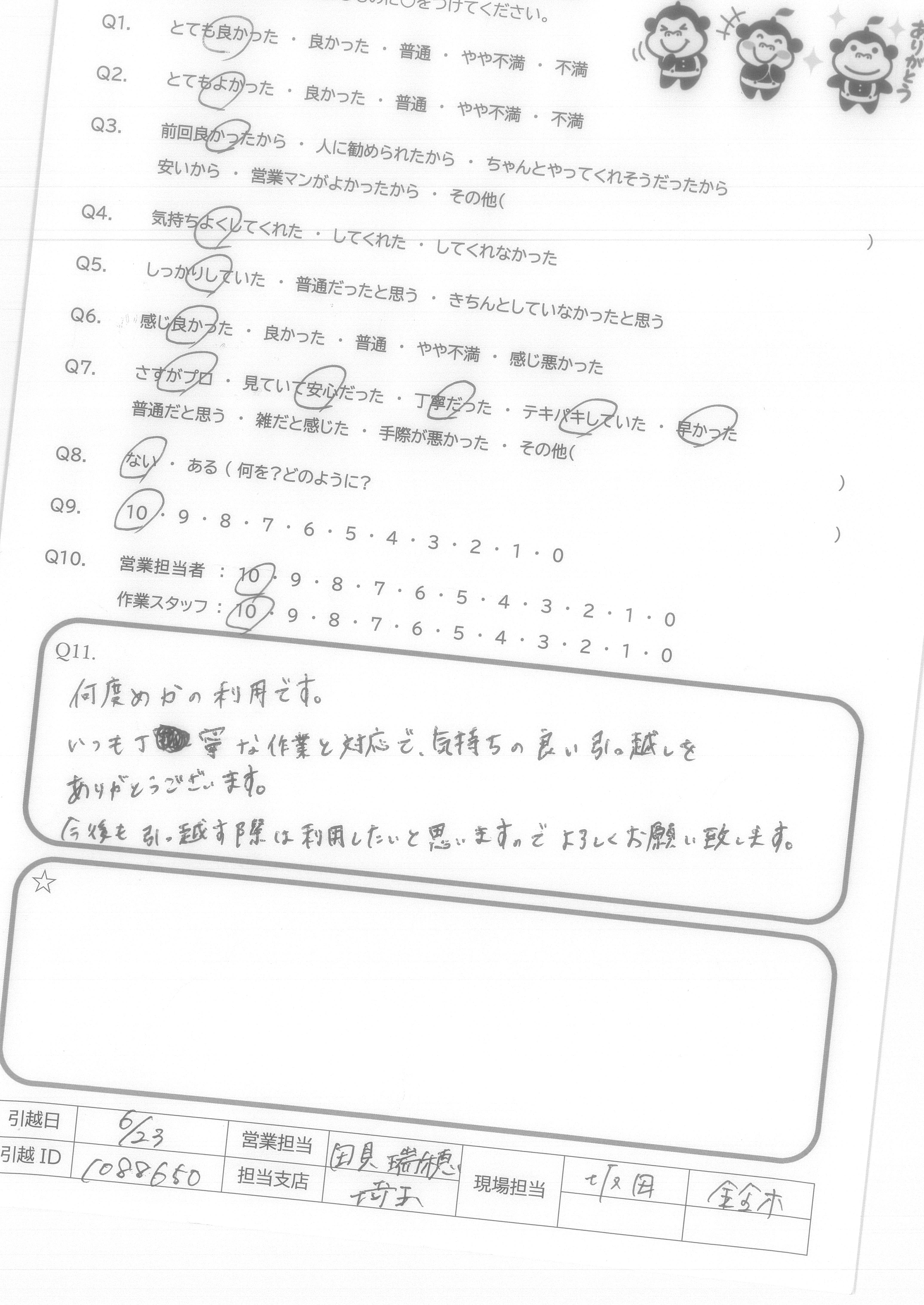 A.何度めかの利用です。 いつも丁寧な作業と対応で、気持ちの良い引っ越しをありがとうございます。 今後も引っ越す際は利用したいと思います。で、よろしくお願い致します。