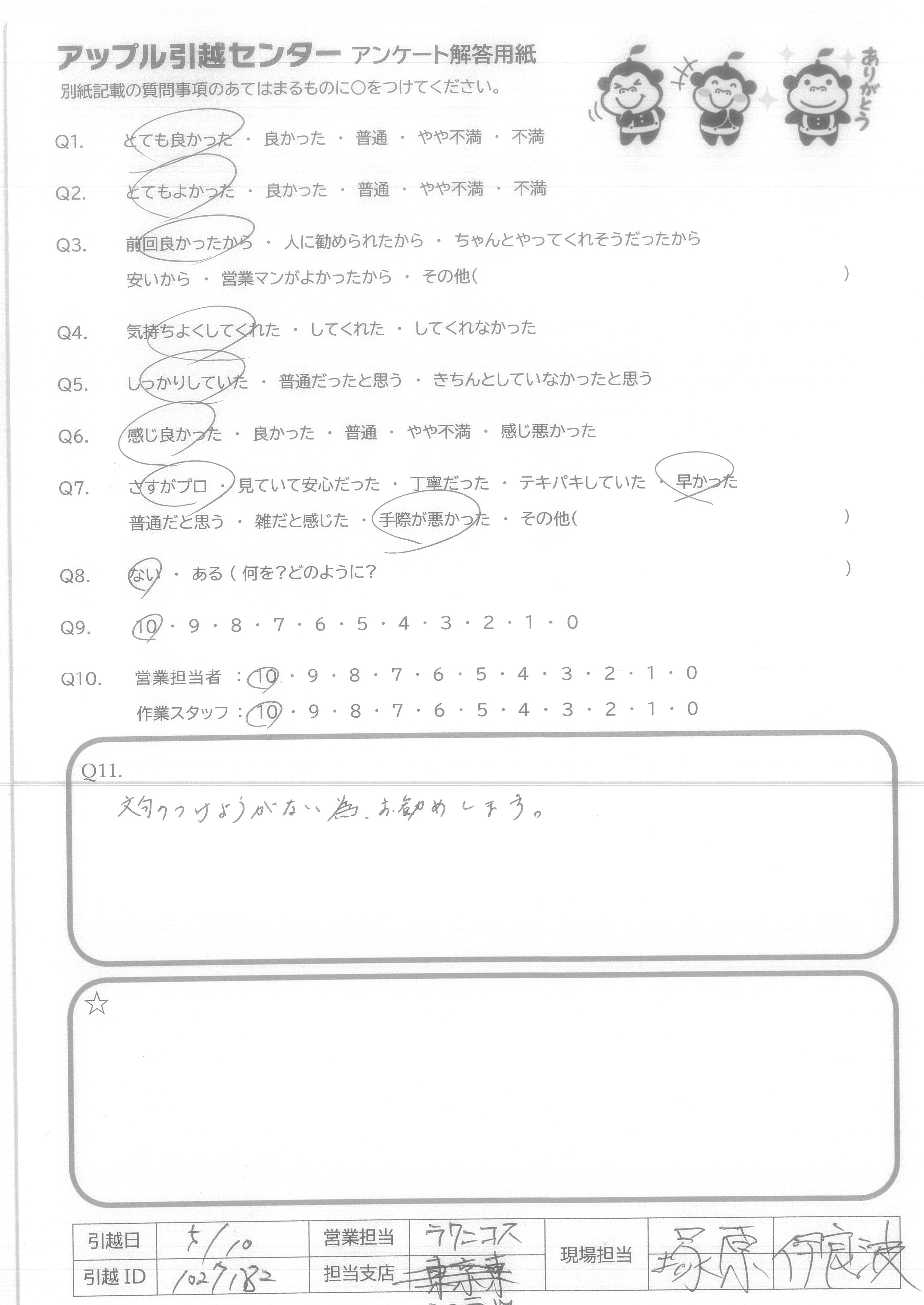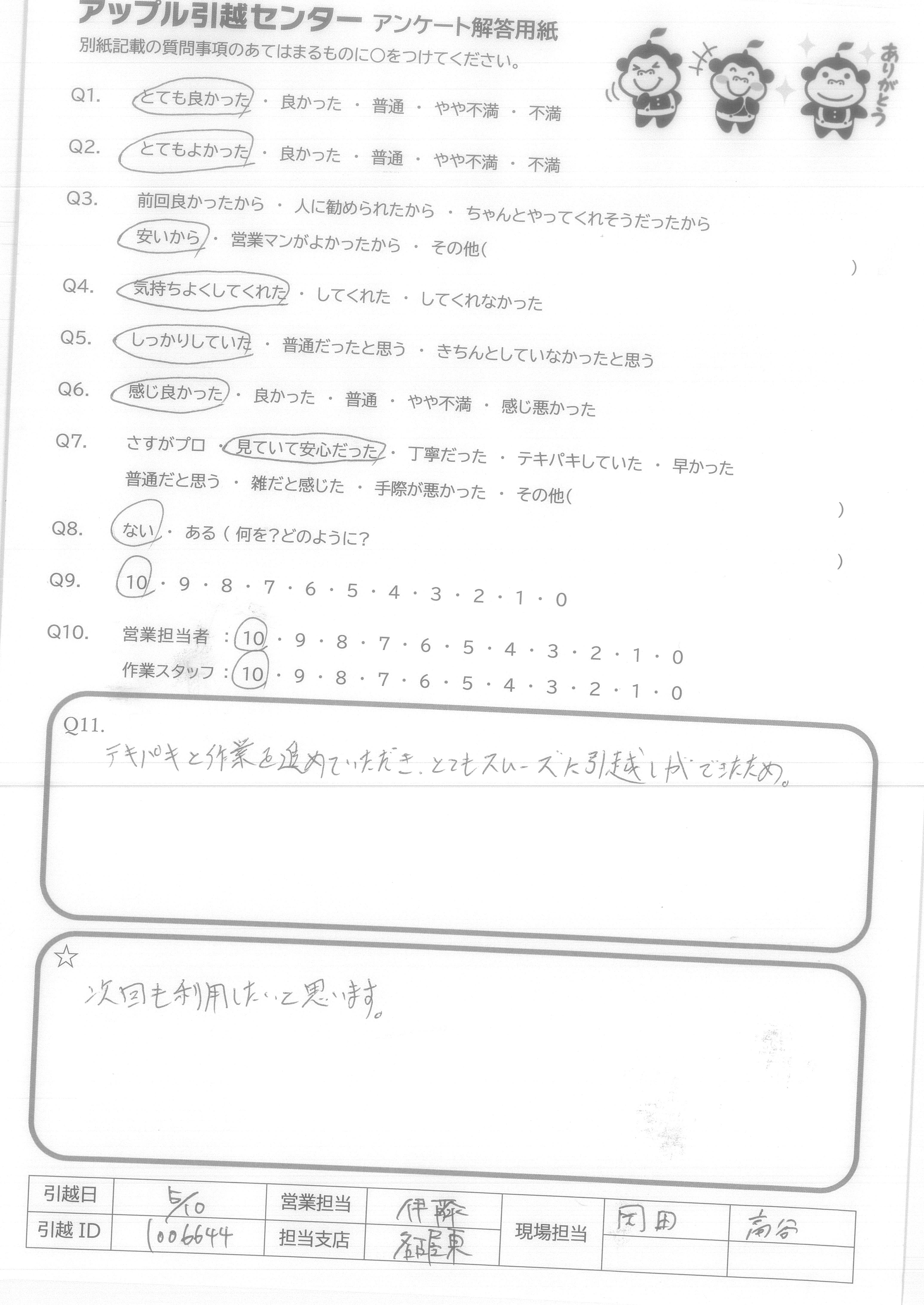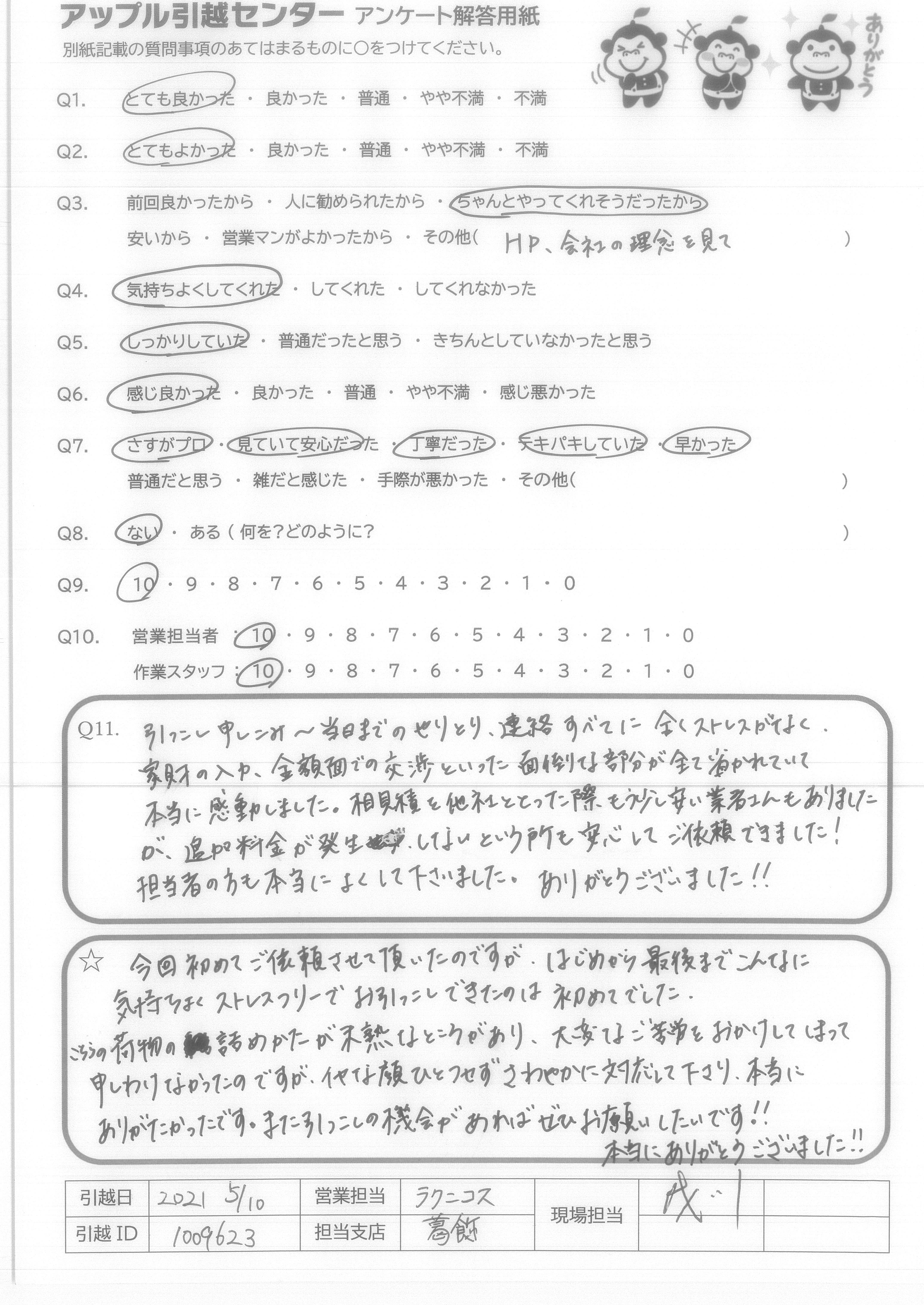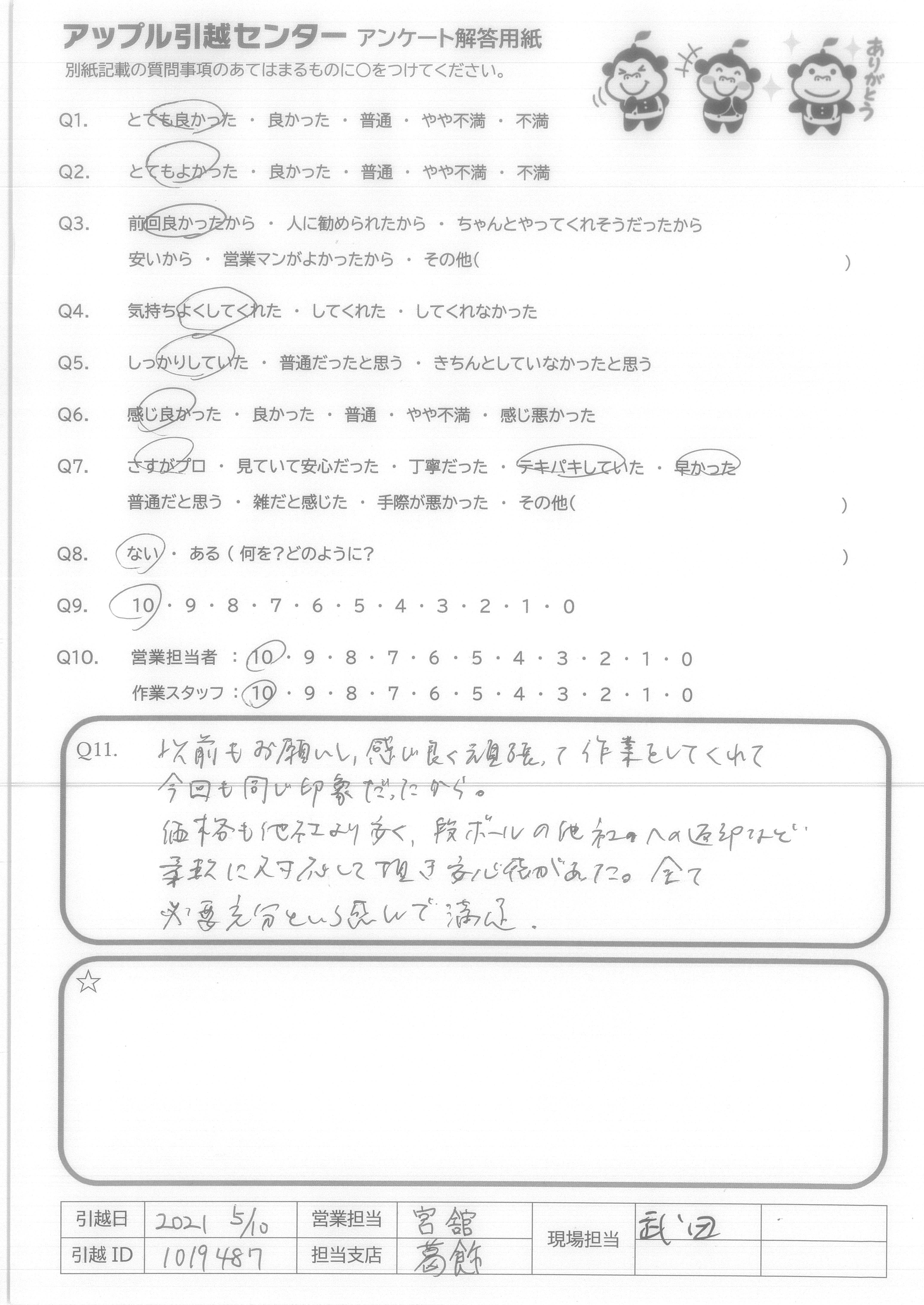 A.担当して頂いた方々のおかげで気持ち良く引っ越しが出来て、とても嬉しいです。 また引っ越す事があれば、是非お願いしたいと思いました。 アップルさんに決めて良かったです。 ありがとうございました。