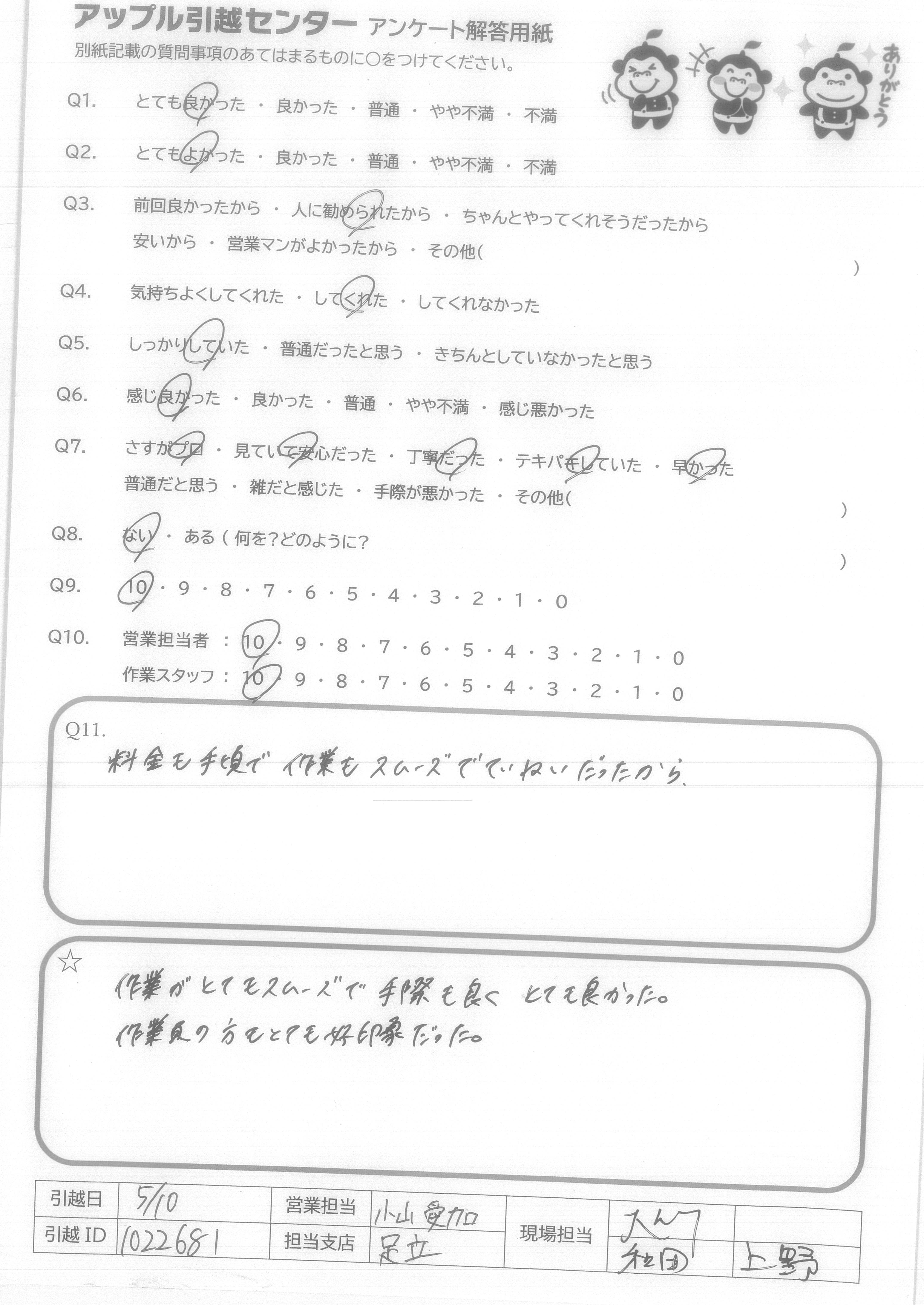A.テキパキと作業を進めていだき、とてもスムーズに引越しができたため。