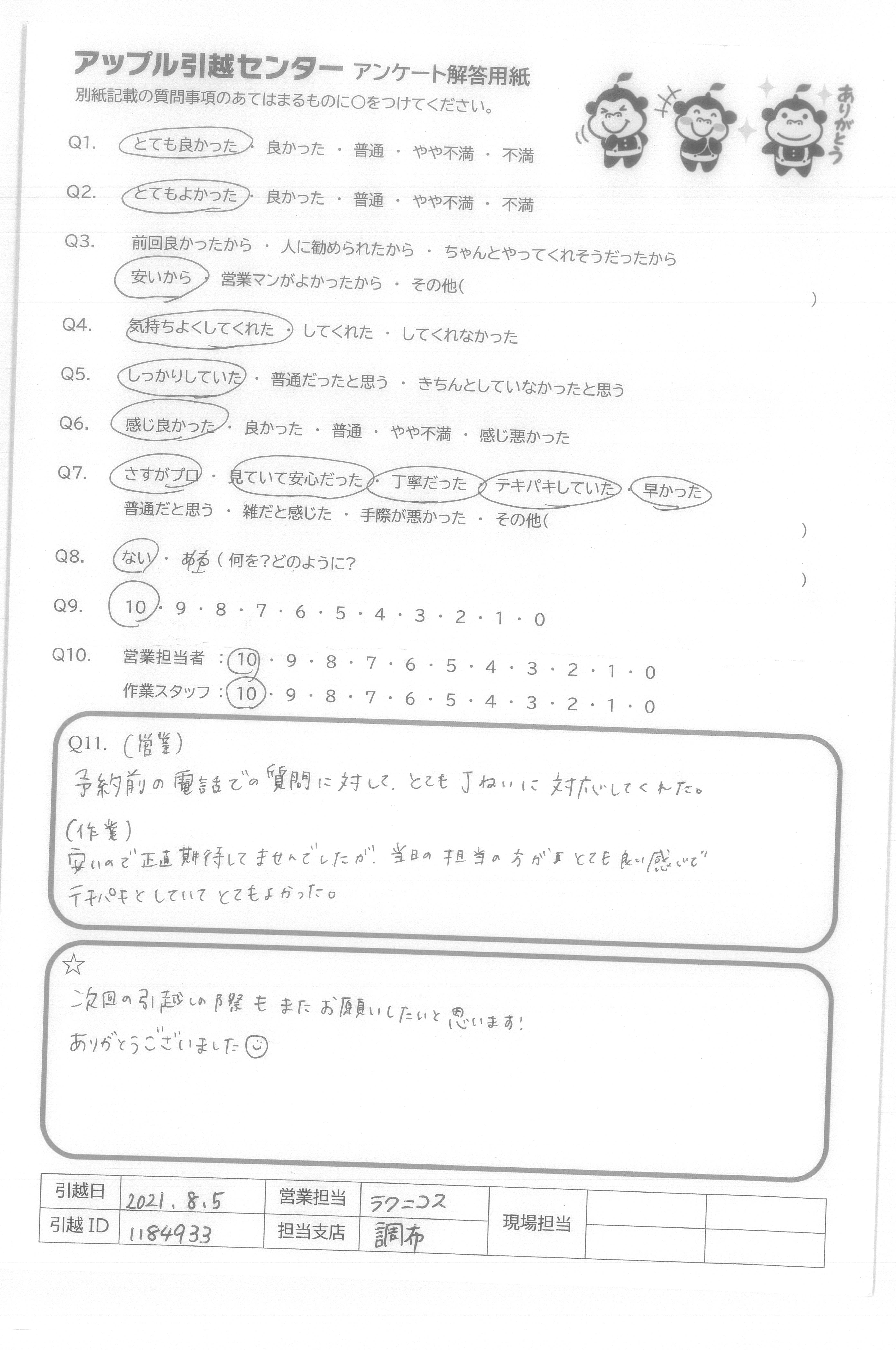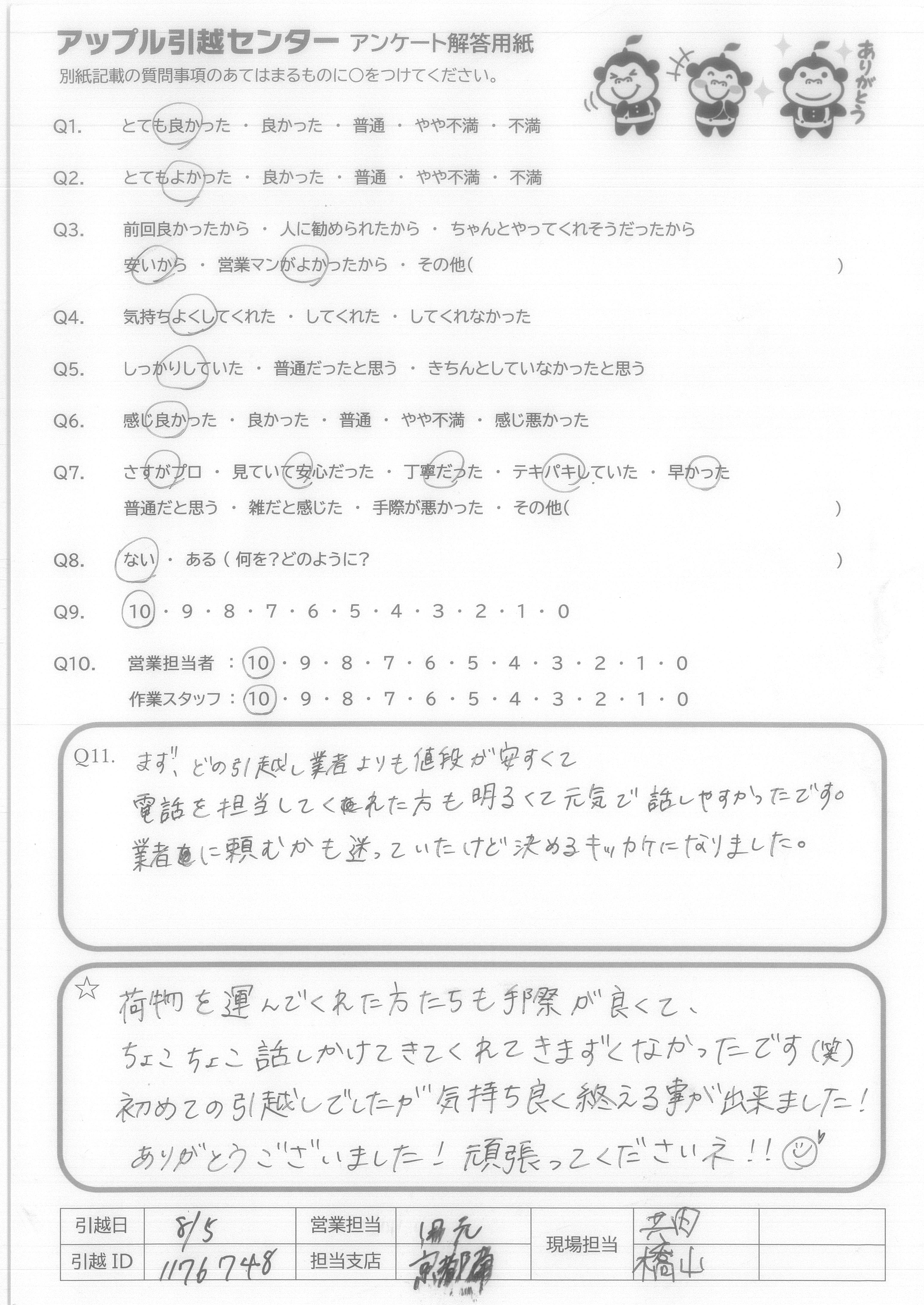 A.6月末に自宅の引っ越しをして頂いて良かったので、事務所の備品の引っ越しを今回お願い致しました。よって、正確に申し上げれば電話でのやり取りはなく、メールでお見積もりを含めて全て完結しております。よってアンケートの1つ目の項目は、メールでのやり取りだと思って頂ければと思います。 現場の方は、人柄がとても良く、作業も早くて助かりました。正直とても満足しています。挨拶も気持ち良かったです。(前回の方は、お名前まで自己紹介して下さいましたが、今回の方は、お名前の自己紹介はなかったです。忘れていたのかな?だから名前がわかりません。でも特にそこまで求めていないので、大丈夫なのですが、笑顔でアップル引っ越しセンターです!と自己紹介?下さったので、全然問題ありません。笑) また、営業の方とのやり取りでダンボールを持ってきて頂く日がこちらが依頼した日と異なる日に事務所に配送された件(メールで全て記録が残っておりますので、こちらの指定した日が間違っていない事は証明できます。)の謝罪まで現場の方がして下さいました。引っ越し当日に、私の方から、そういうやり取りがあった事自体、一切現場の方には申し上げておりませんが、 現場の方の方から自発的に本社から連絡がきてましてと、謝罪して下さいました。それは、とても好感が持てましたし、また、その現場の方が、僕達も営業の人が仕事を取ってきてくれるから働けるので、僕らがフォローするのも大事だと思っていますとおっしゃっていたのは、本当に素晴らしい姿勢だなと思いました。(まさに人間力!) ただ、残念な事に営業の方(個人攻撃みたいになるので、あえて名前は出しません。)からは、一切謝罪はありませんでした。事務方のスタッフの方(お名前はありませんでしたが)が、営業の者が休みを取っておりますので、代わりにご連絡させて頂きますと、謝罪のご連絡がありました。この日に持ってきてほしいとご連絡したメールに返信して頂く形で送ってきて下さったので、営業サイドのミスである事は、重々把握されての対応だったかと思いますが、そのフォローも素晴らしかったです。どうせなら名前を書いておいて下さればよかったのにと思いましたが。 営業の方に関しましては、お見積から発注までのやり取りは、本当に好感が持てましたし、自宅の引っ越しの時にも、他社の営業マンより、好感度は凄く高かったんです。(他社は、見積もりで訪問、自宅で高い見積もりから始まって段々と値段を下げていき、挙句の果てに上司にその場で電話をして、お願いして下げてもらったというような印象を与える一昔前の訪問販売みたいな営業をしますが、御社の営業の方は、そういった無駄な事は一切なく、最初のお電話でヒアリング後にすぐに価格を出して下さり、今回もメールでのやり取りでしたが、スピーディーで気前も良く、発注までは、本当に好感度抜群でした。 それだけに、段ボールのミスがあった事に対して、メールでもいいので、一言ご本人から、すみませんでした!とあるだけで、全然違うのにな・・・と残念には思いました。 段ボールの配送において、事務所のローカに置いておけば別にいいじゃないかと思われるかもしれませんが、オフィスビルの共用部分は、管理会社からは物を置くのをやめてくれと怒られますので、事務所に誰もいない日は、本当に避けてもらいたいんですね。 配送の方から電話がかかってきて、「廊下に置いておきましたけどいいですか?」と言われた時には、日が違いますと伝えたものの、持って帰ってくれと言うのは、さすがに配送の方がかわいそうですから、渋々受け入れ、夕方になんとか事務所の方に行き、片付けました。そういった事を理解してほしいとは思います。人間ですから、一言あれば、気持ちもおさまります。ミスは誰にでもあります。人間ですから、ただ、謝罪の一言がないという、ほんの小さな事がそれまでの好感度を台無しにしてしまう。 それは本当にもったいない。逆に謝罪で好感度を更に上げる事だってできますから。ミスをすぐに認めて電話がかかってきたとなれば、こちらも怒りませんし、それほど大きな問題ではないので、それで終わりです。でも一言もないと、築いた信用が崩れます。印象はすごく悪くなります。それは、営業マンとして理解しておかなければならない事だと思います。仕事人として、それだけは申し上げたいですね。 それ以外は、本当に満足しています。この度も、本当にありがとうございました。