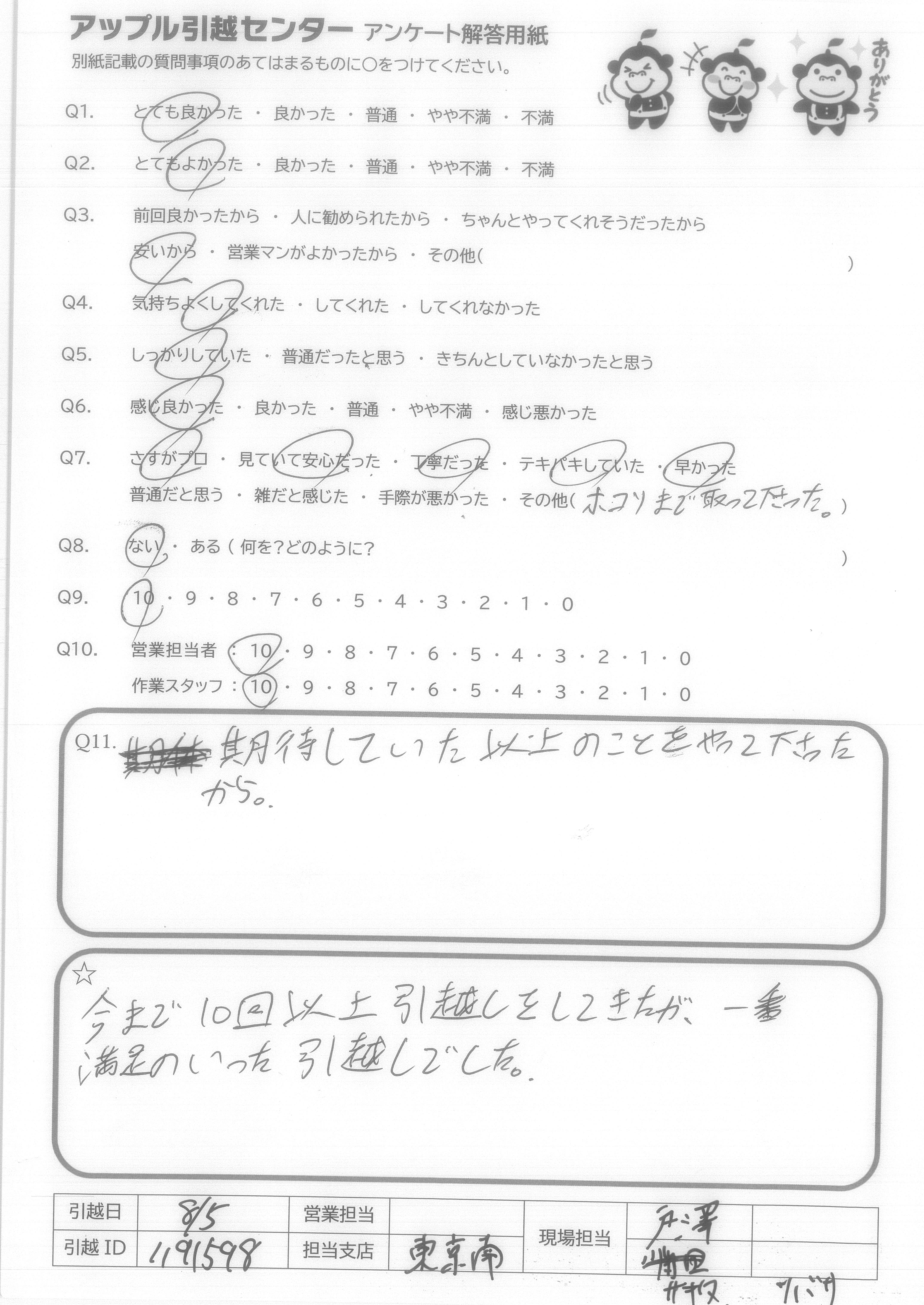 A.今まで10回以上引越しをしてきたが、一番満足のいった引越しでした。