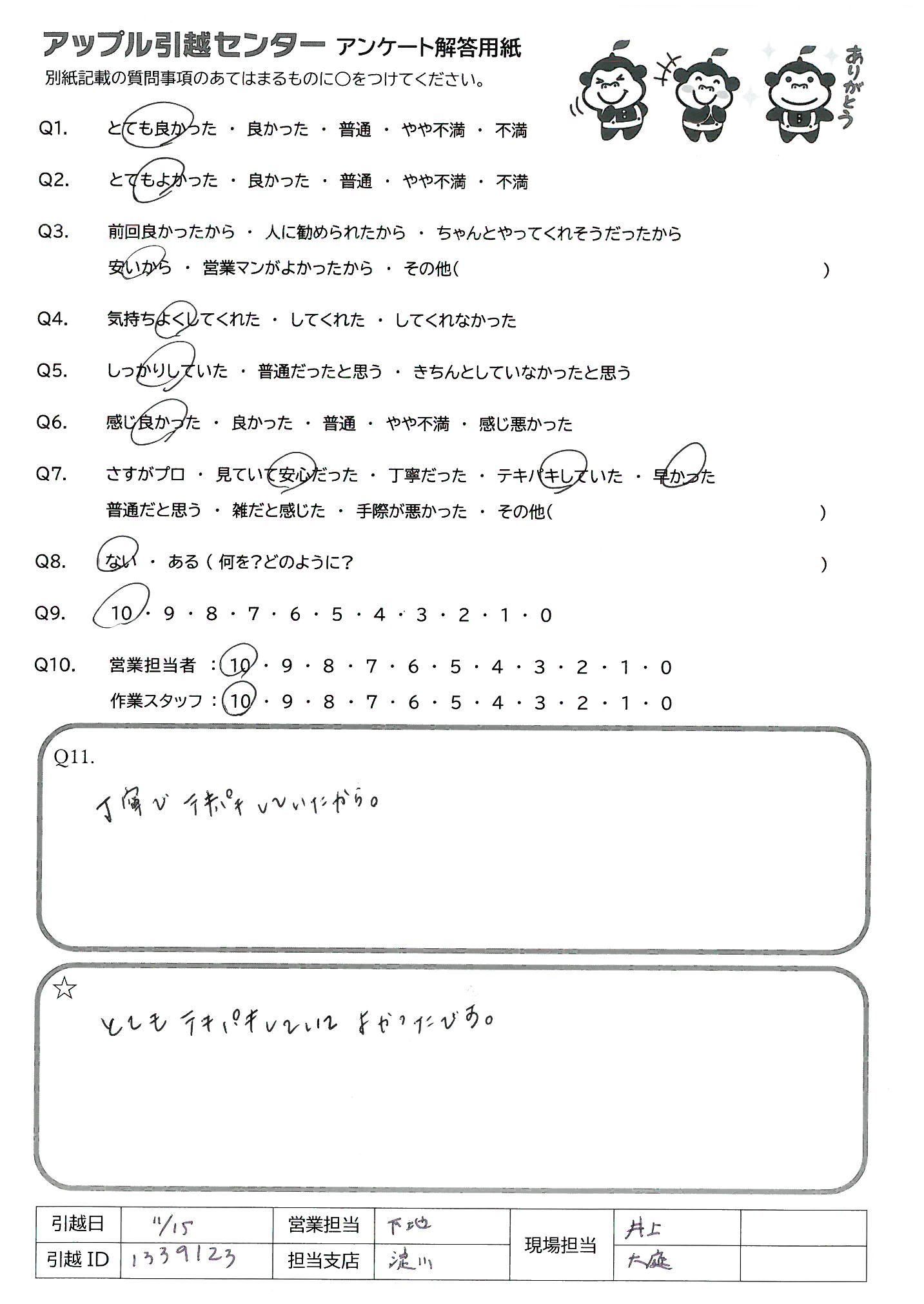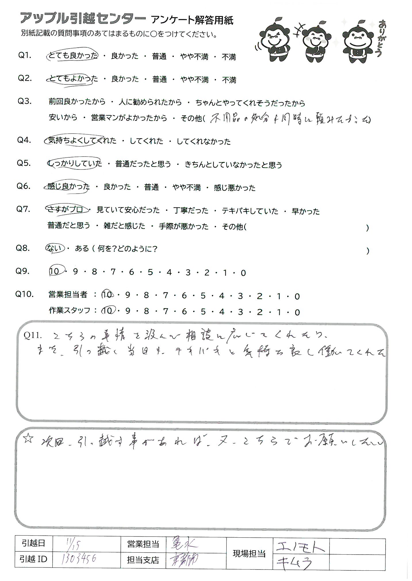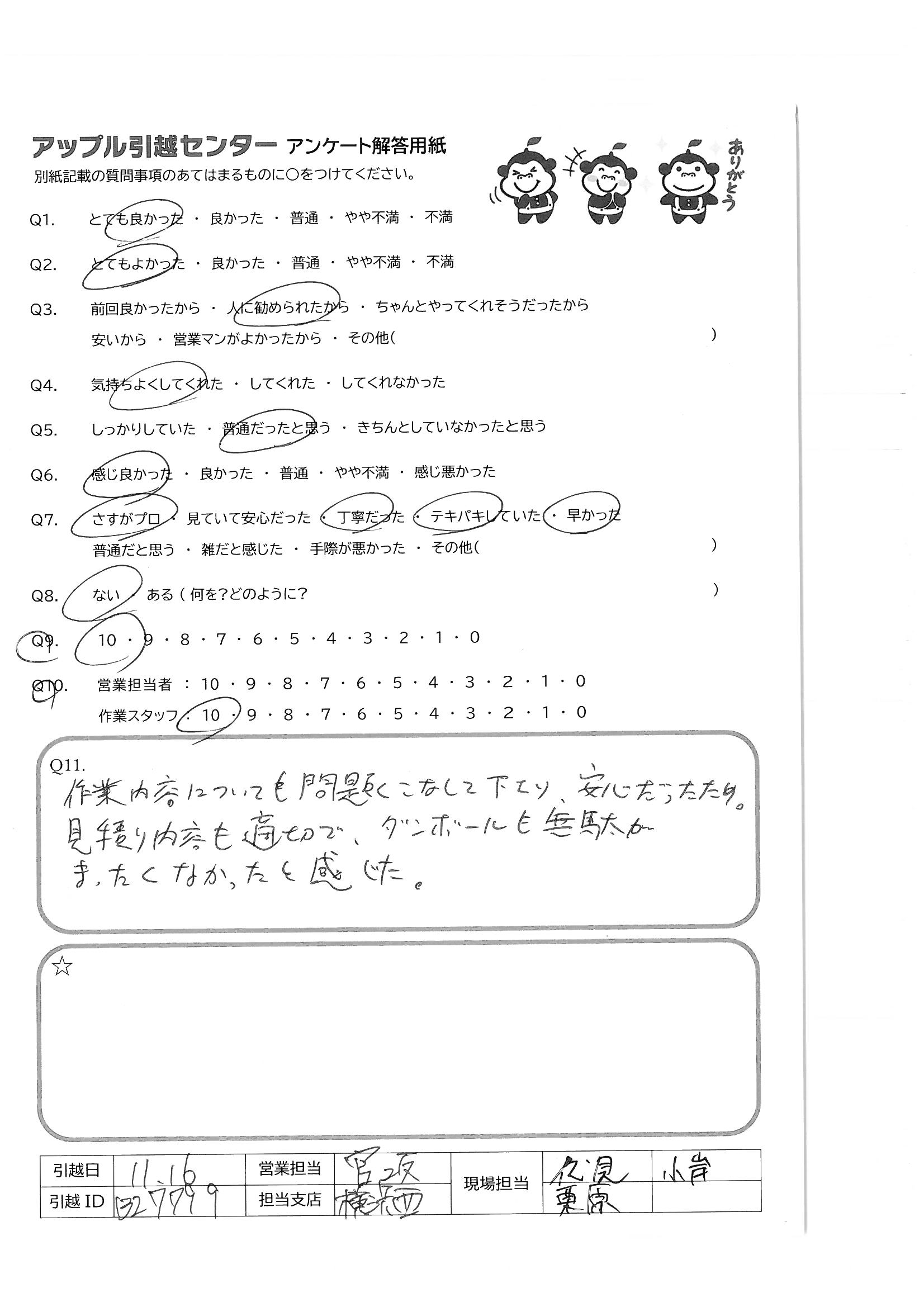 A.今回、初めて利用させていただきましたが、 とても丁寧かつ素早い対応で、感謝しています。値段も他社と比較してお安く、値段・対応共に一切の不満がない引っ越しでした。 作業中の応対や、引っ越し準備が間に合ってない部分のフォローなどもしていただき、当日、不安なく引っ越しを完了することができました。 また、引っ越しをすることがあれば、改めて依頼させていただければと思います。 本当にありがとうございました。 現場担当:野田さん、丘さん、本間さん、永澤さん