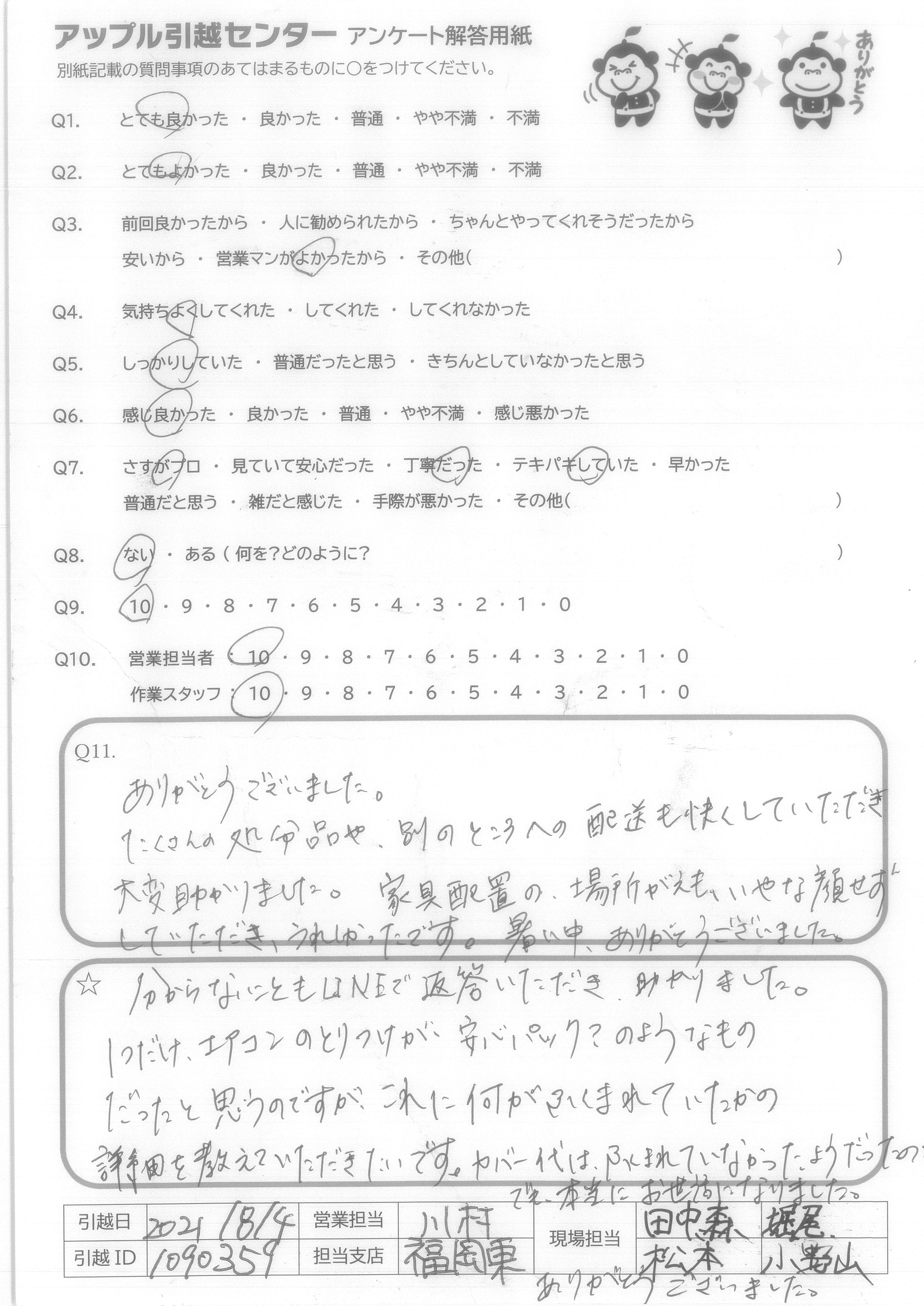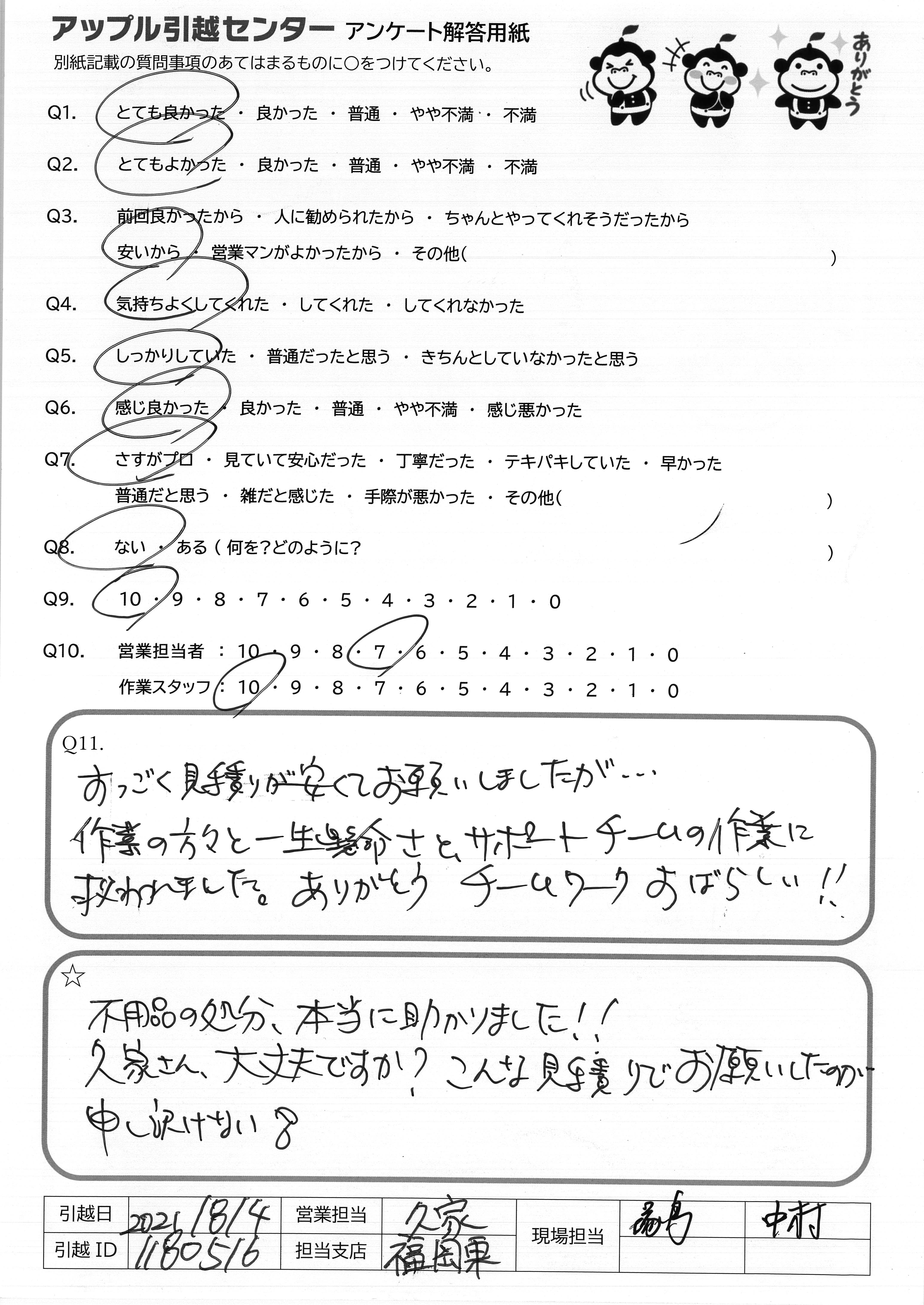 A.ありがとうございました。 たくさんの処分品や、別のところへの配送も快くしていただき大変助かりました。家具配置の場所がえも、いやな顔せずしていただき、うれしかったです。暑い中、ありがとうございました。