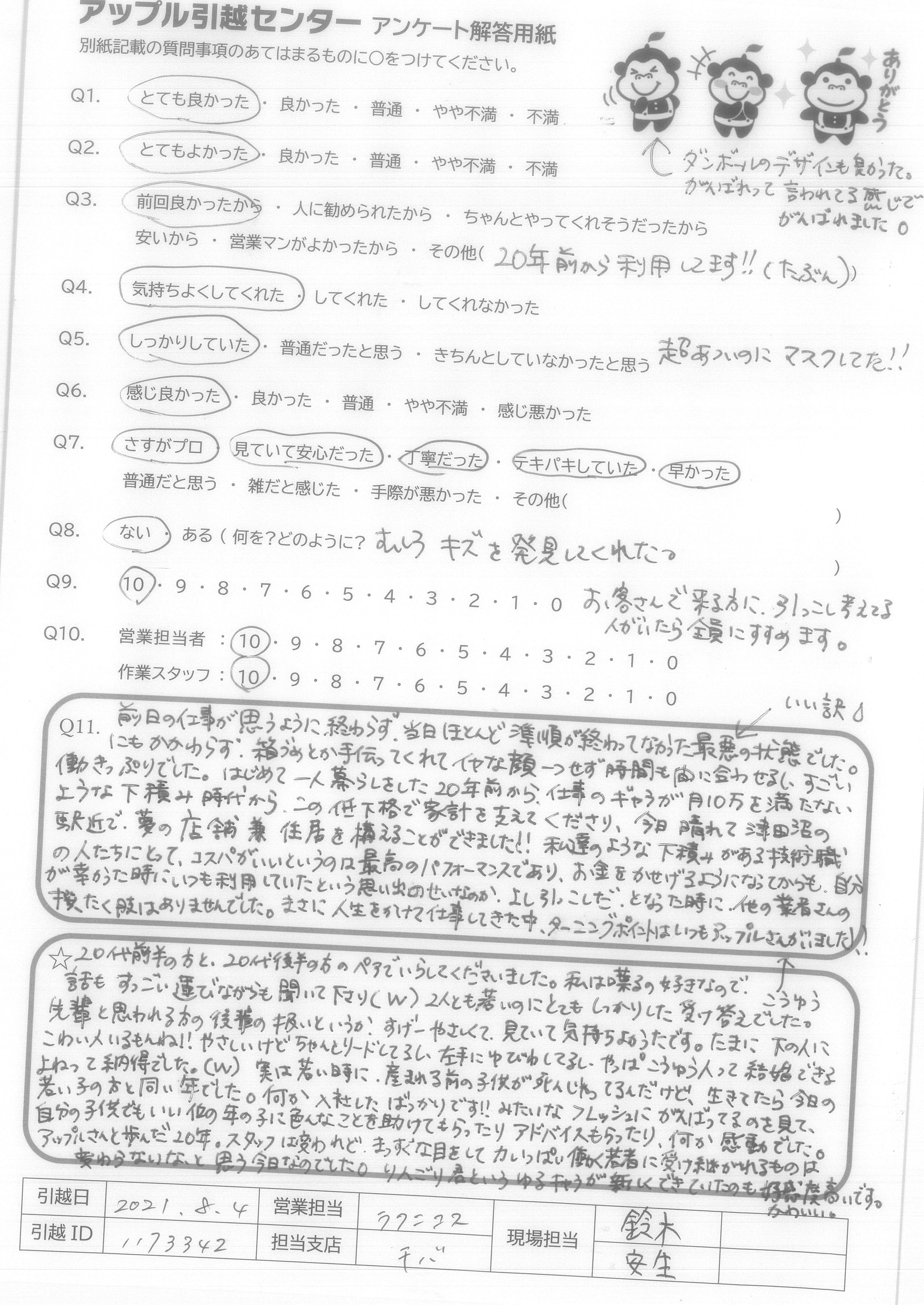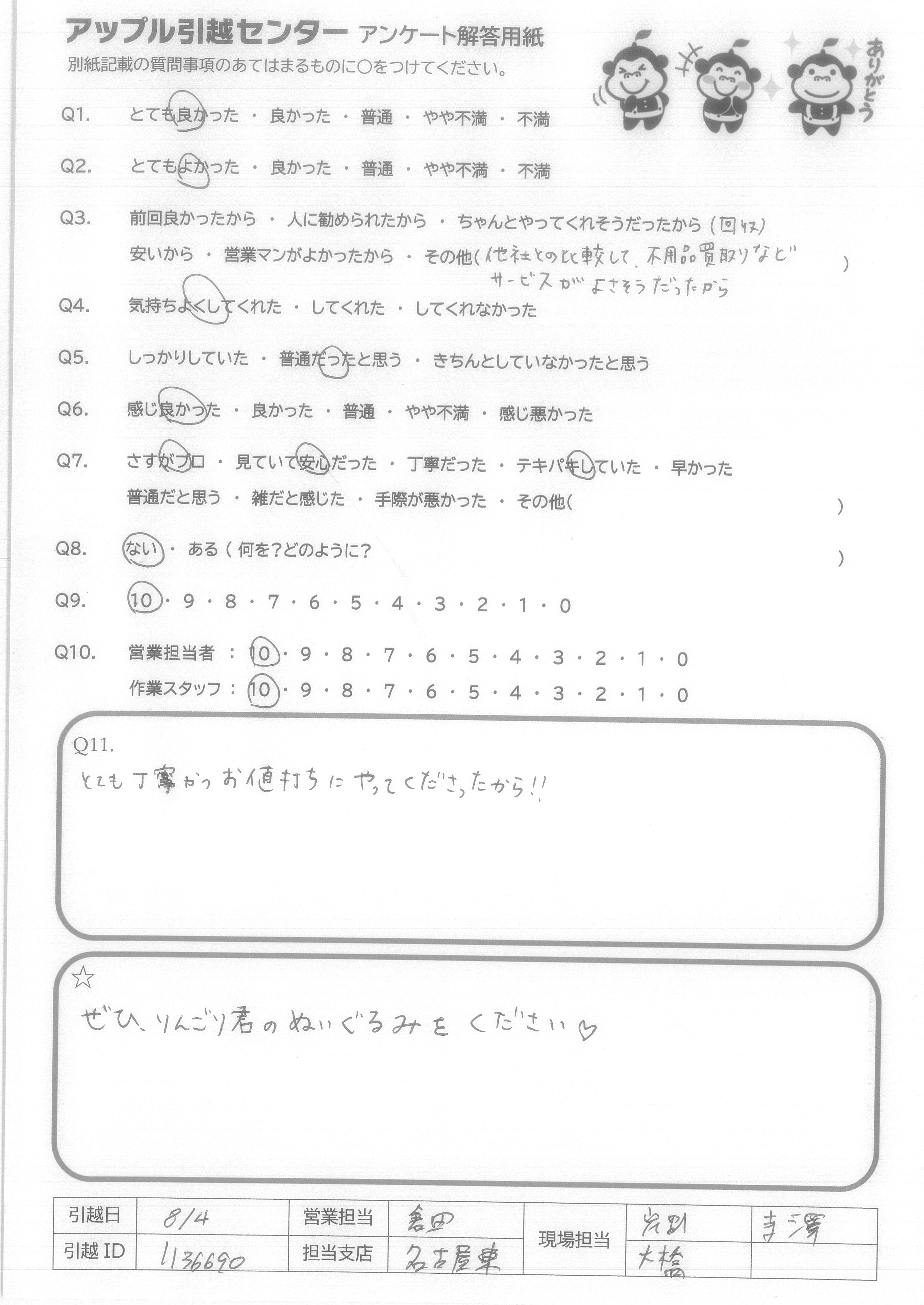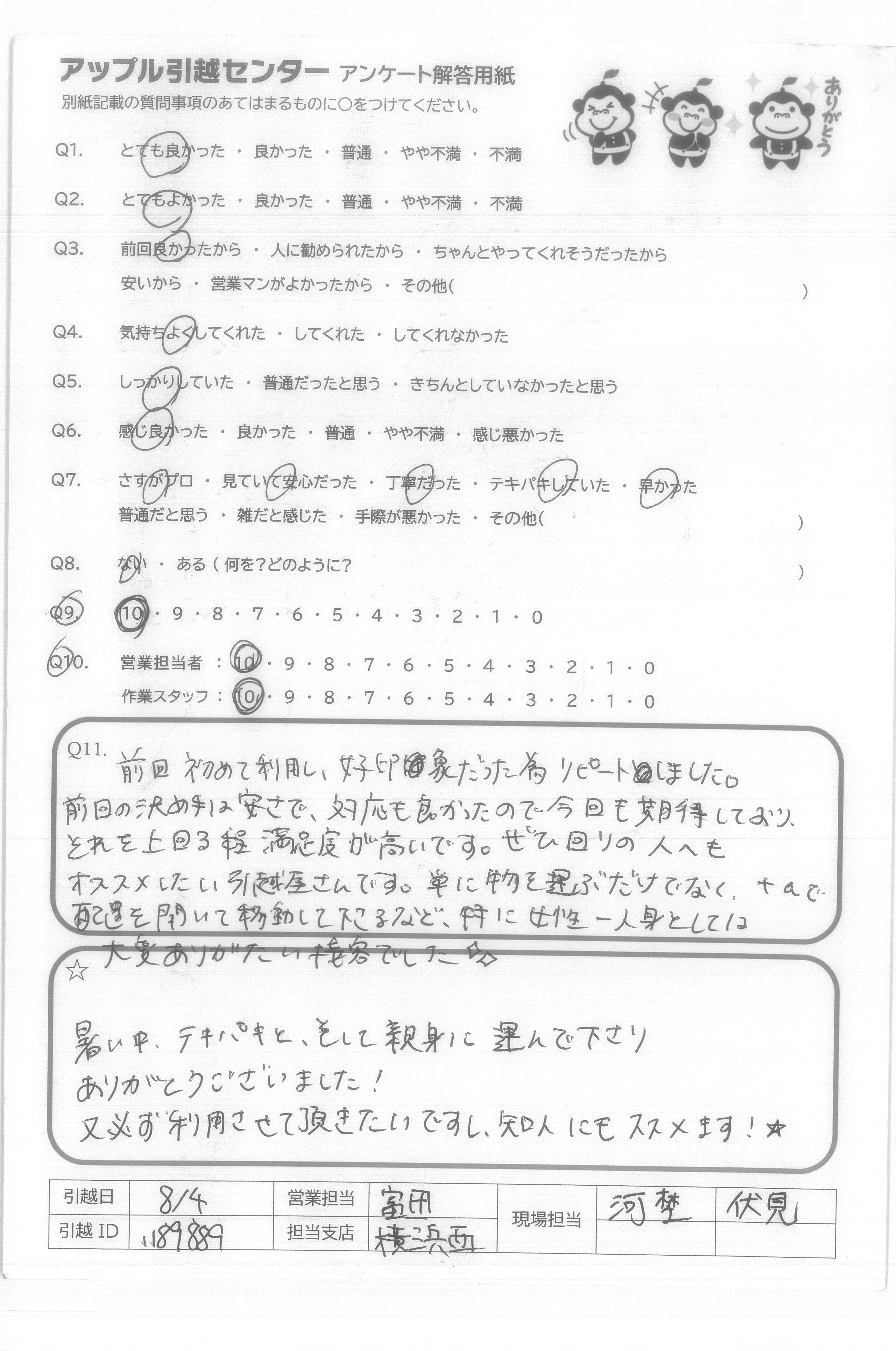 A.大変よくやっていただきました。 時間もぴったりで、作業も早く丁寧でした。 皆さん感じもよかったです。 ただ、一点、リーダーの方の身だしなみが気になりました。夏場で汗は仕方ないですが、タオルを首に巻いたり汗はタオルで拭くなどしてほしかったです。新居や荷物にも汗が垂れていて不快でした。その点だけ大変残念です。暑いので汗をかくことはどうしようもありませんが、対処できることだと思います。それ以外は料金、回収などすばらしかったです。