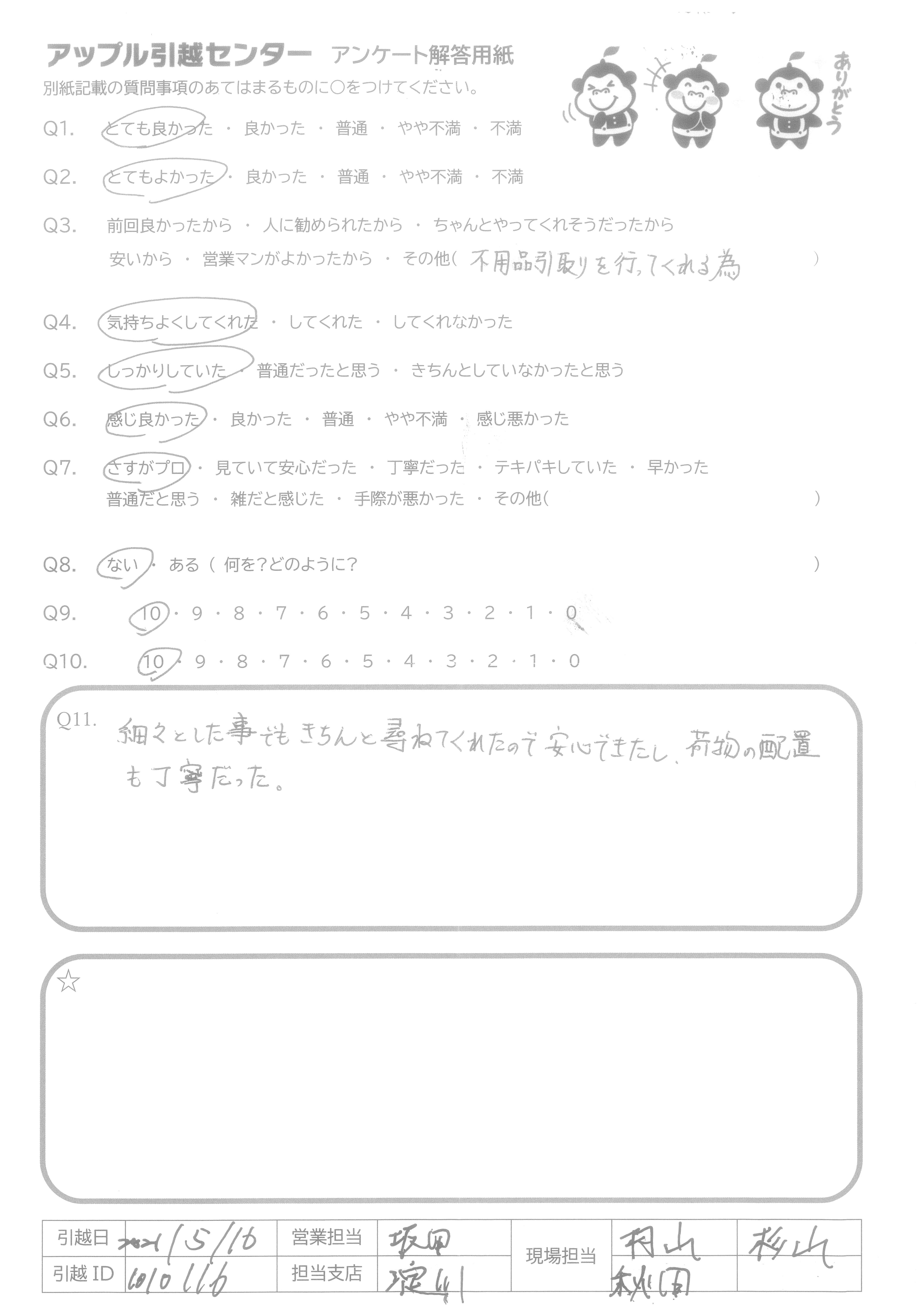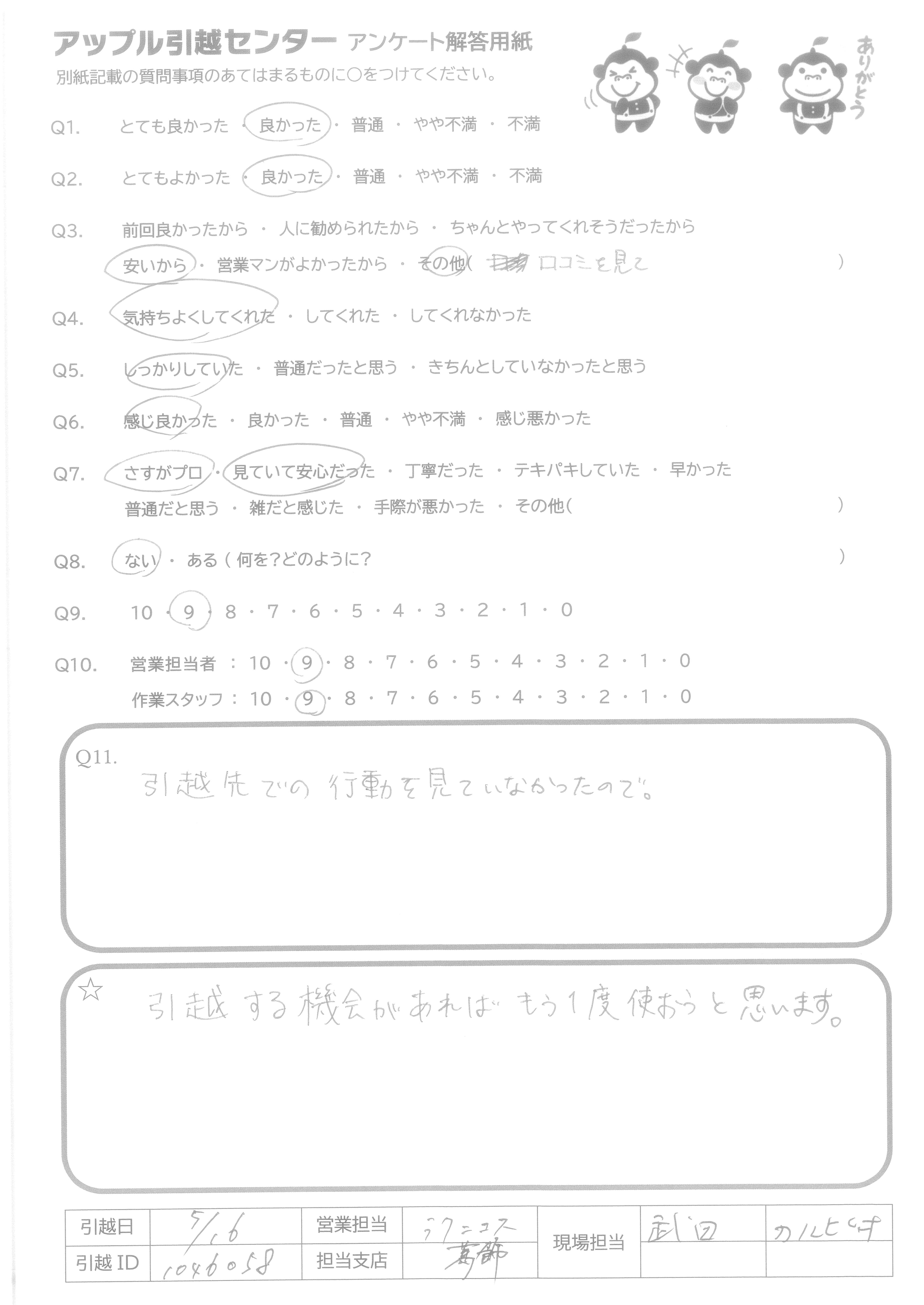 A.前回とても良かったのでまた利用しましたがやはり満足でした。また引越しの機会があればよろしくお願いします。