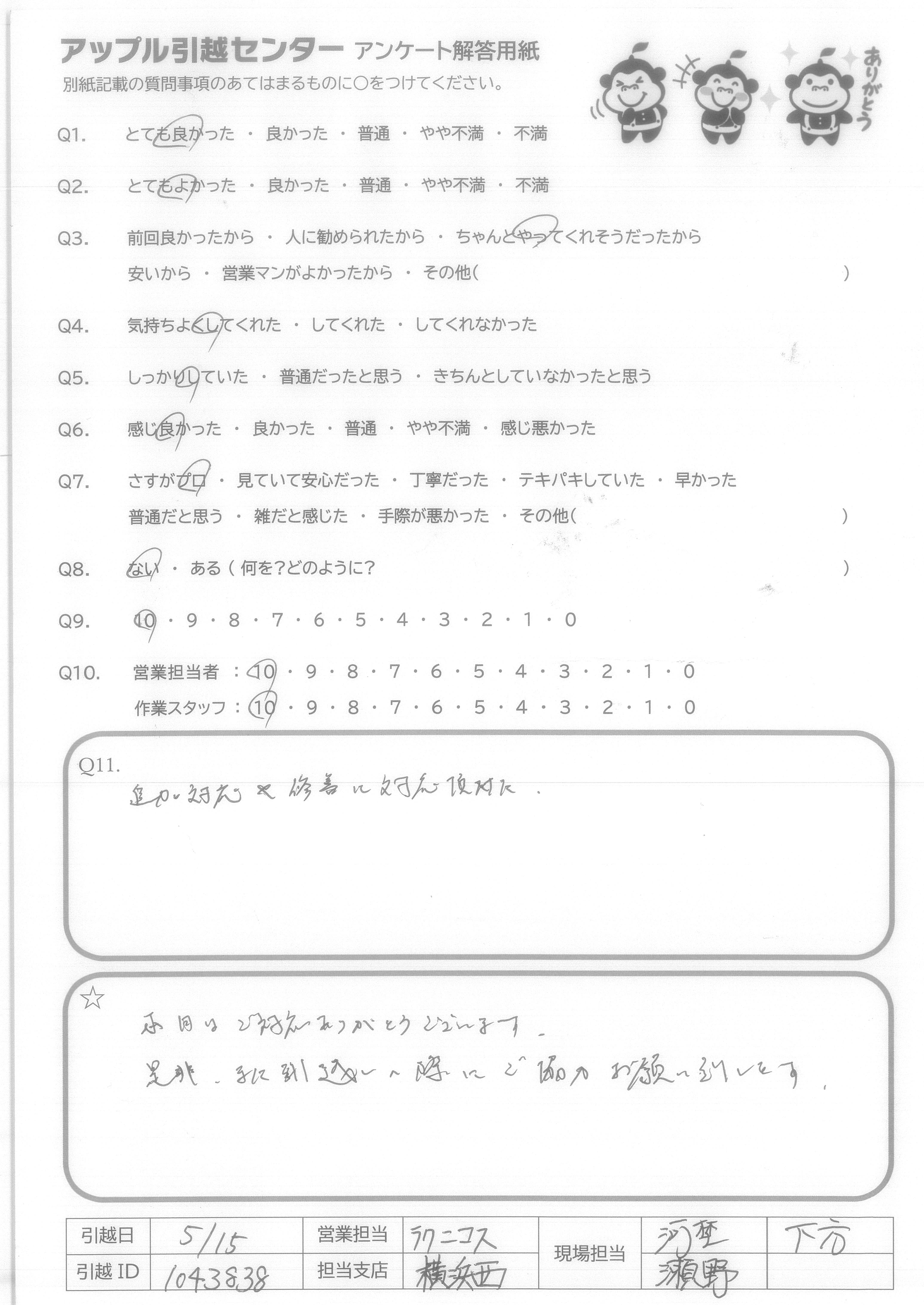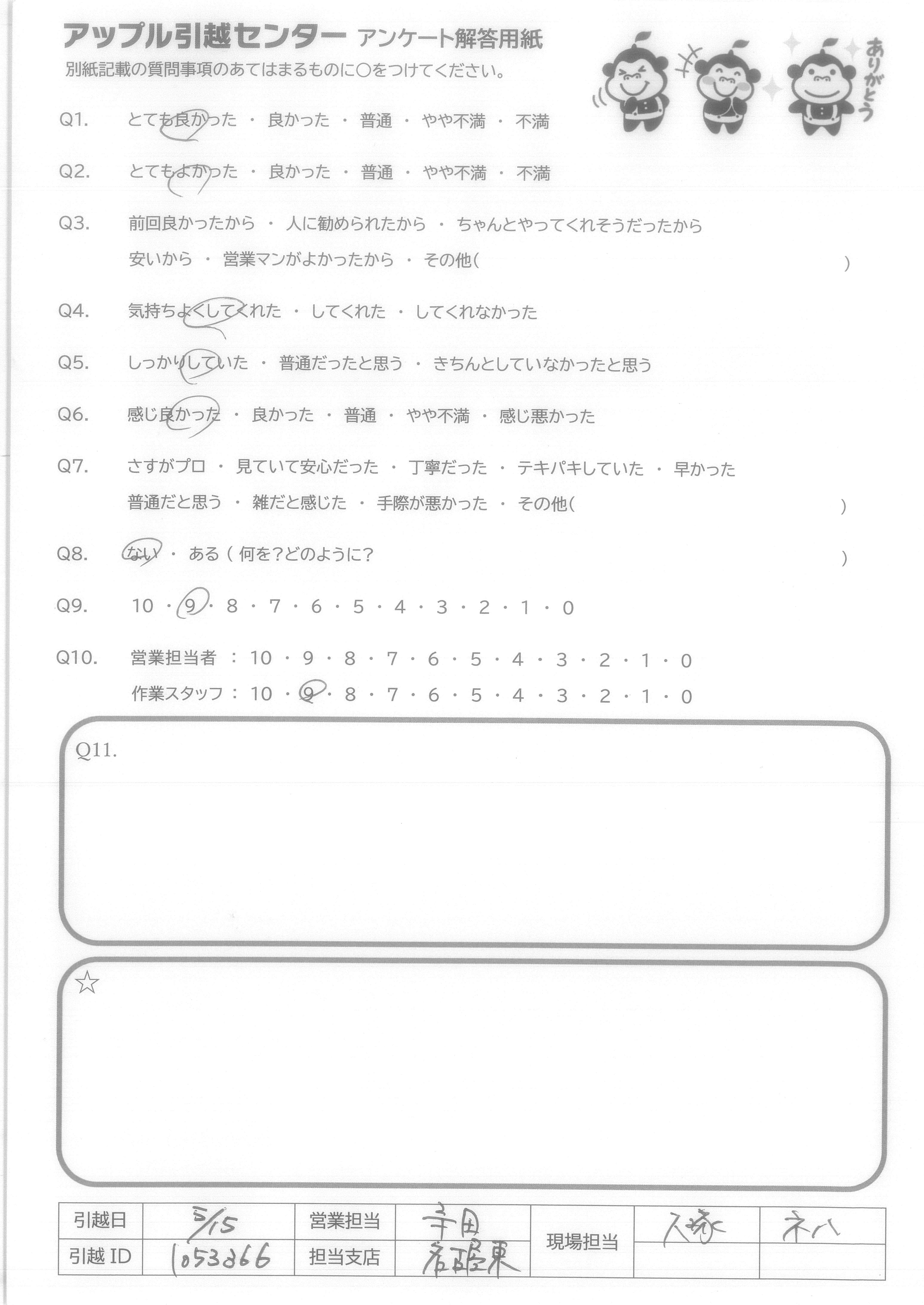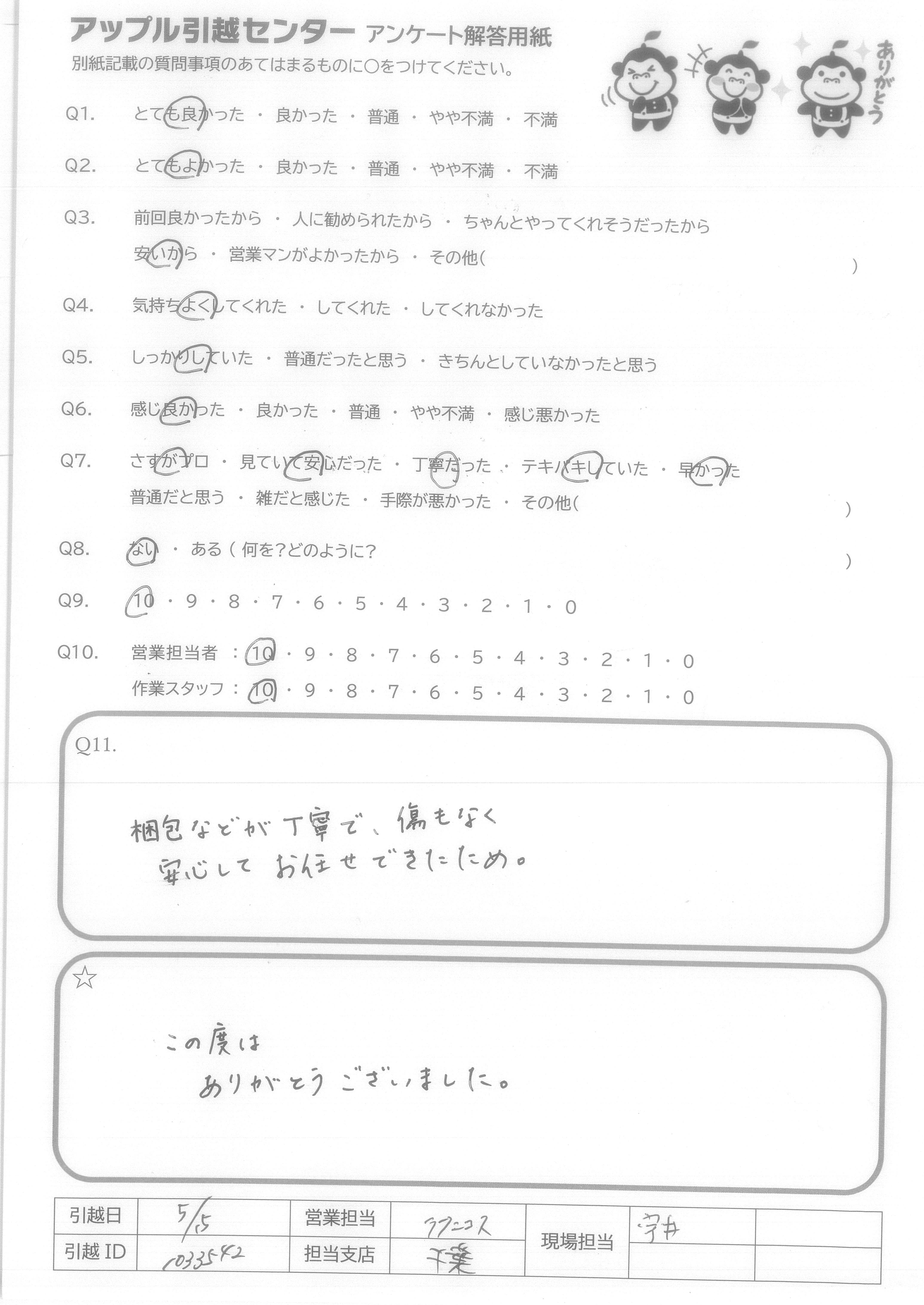 A.引っ越し当日は特に白井さんにお世話になりました。子連れ引っ越しということもあり、朝からあたふたしていましたが、白井さんの的確な指示のお陰でとても協力しやすかったです。手際良く、スムーズに完了していただけたことに心から感謝しております。新居においても照明の取り付けなど進んで声をかけて下さって、嬉しかったですし、本当に助かりました!!ありがとうございました。
