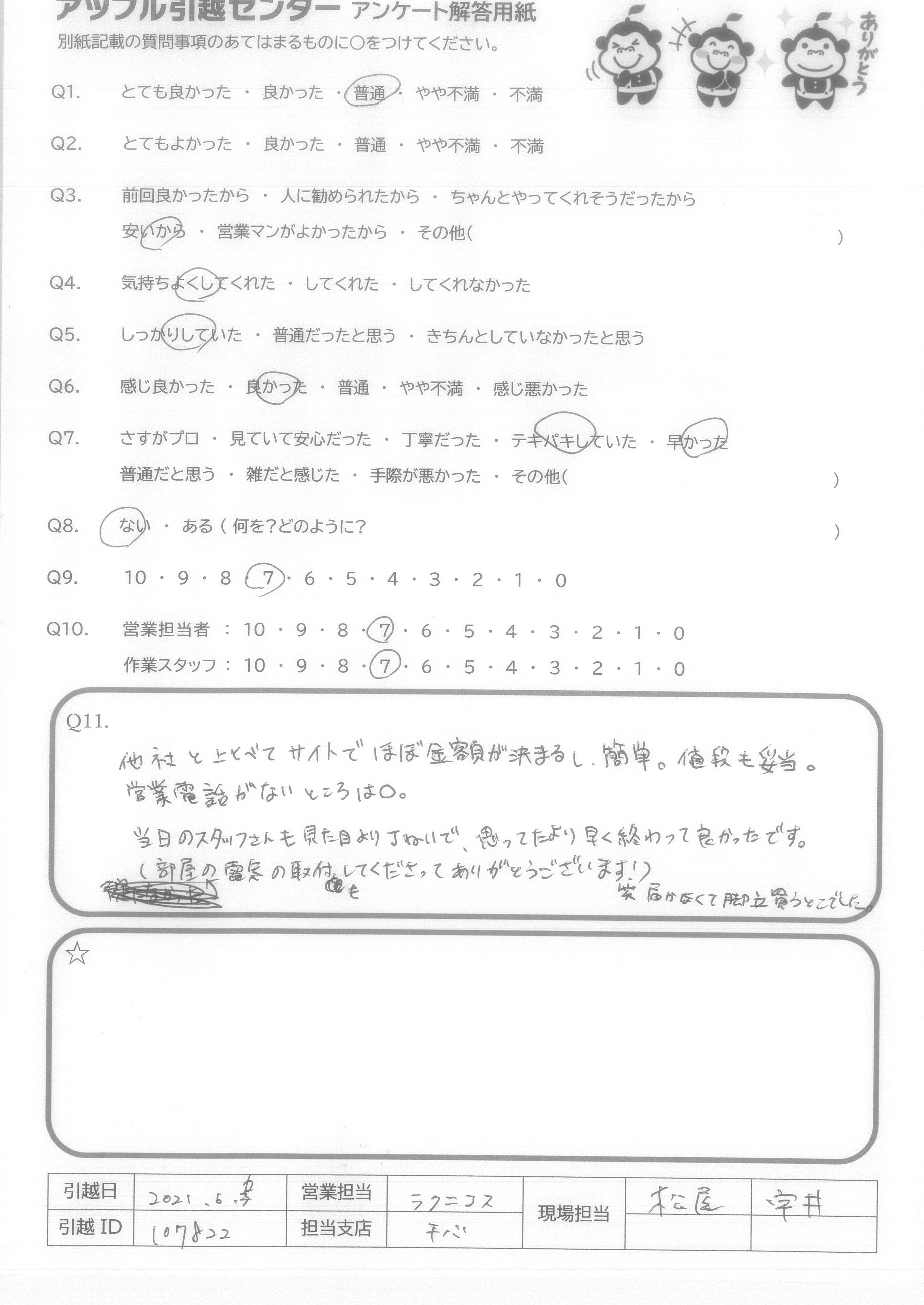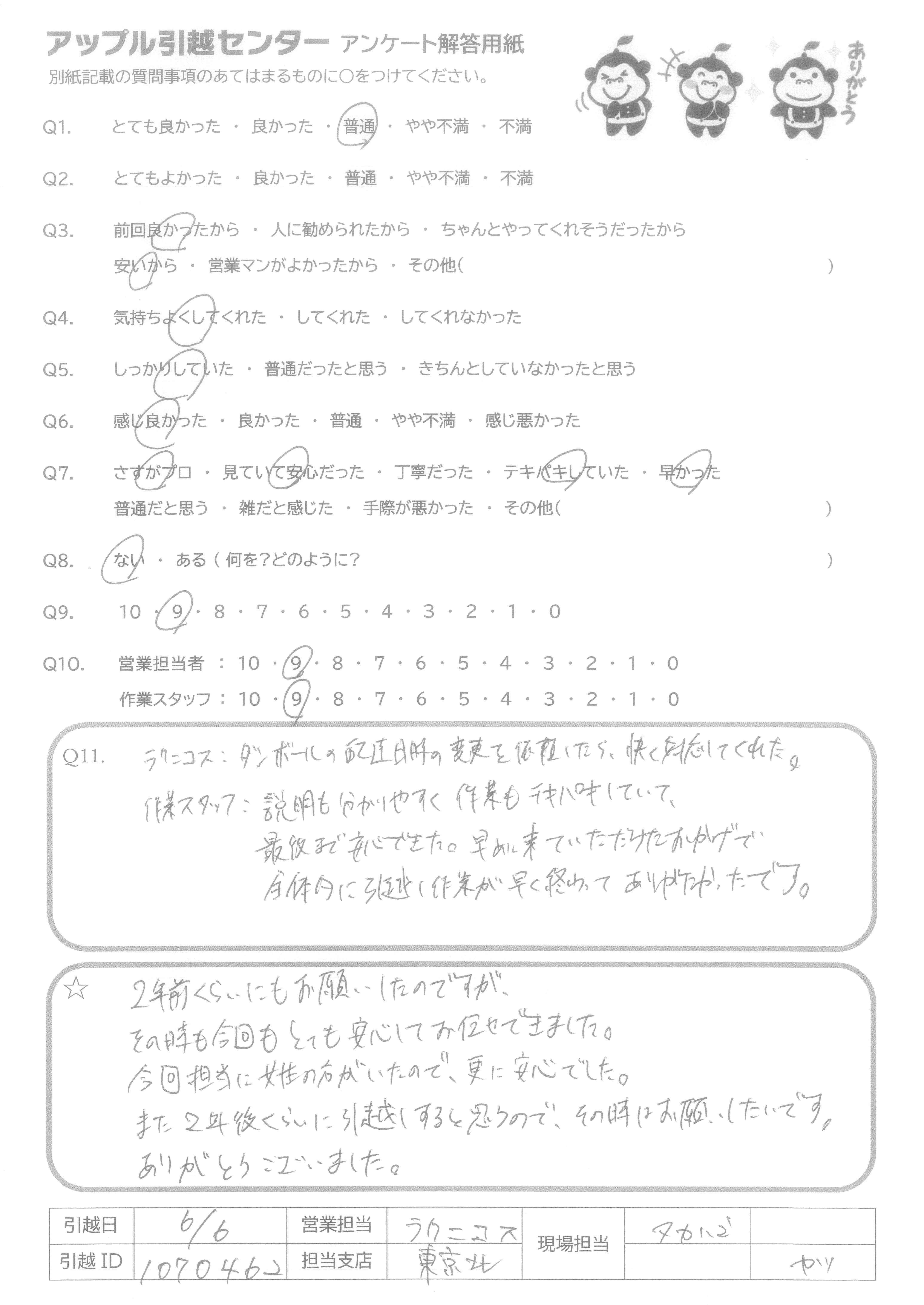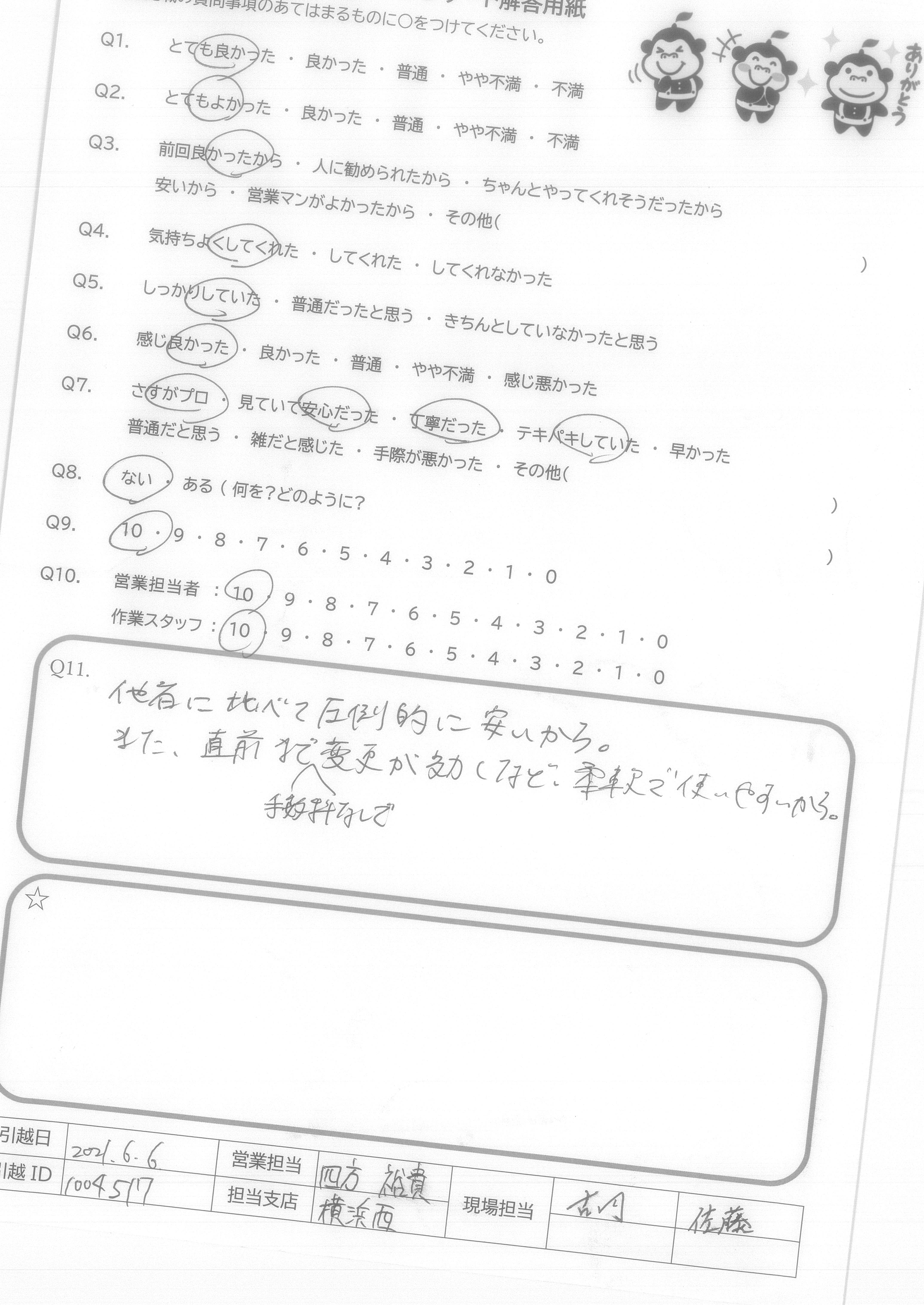 A.2年前くらいにもお願いしたのですが、 その時も今回もとても安心してお任せできました。 今回担当に女性の方がいたので、更に安心できた。 また、2年後くらいに引越しすると思うので、その時はお願いしたいです。 ありがとうございました。