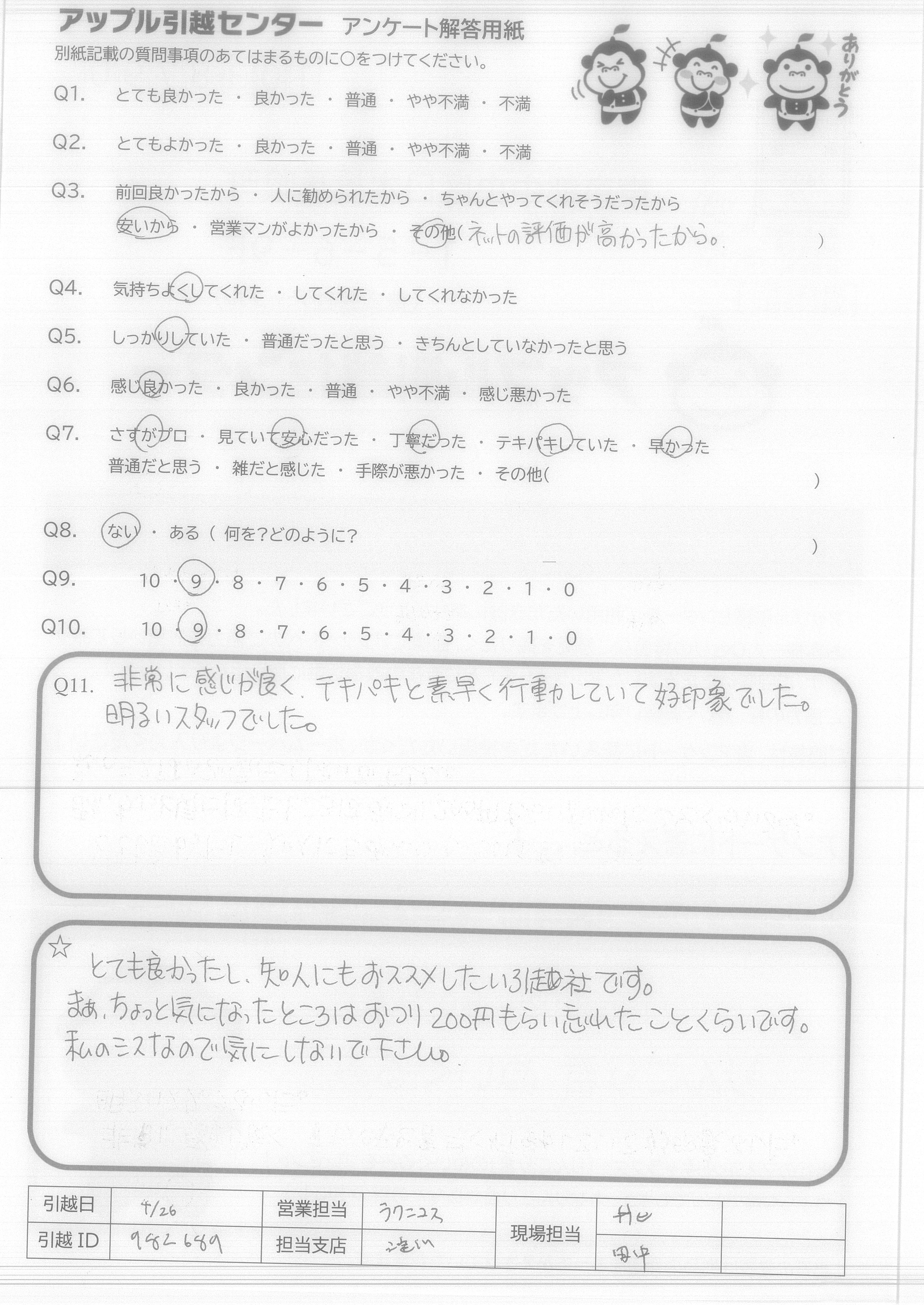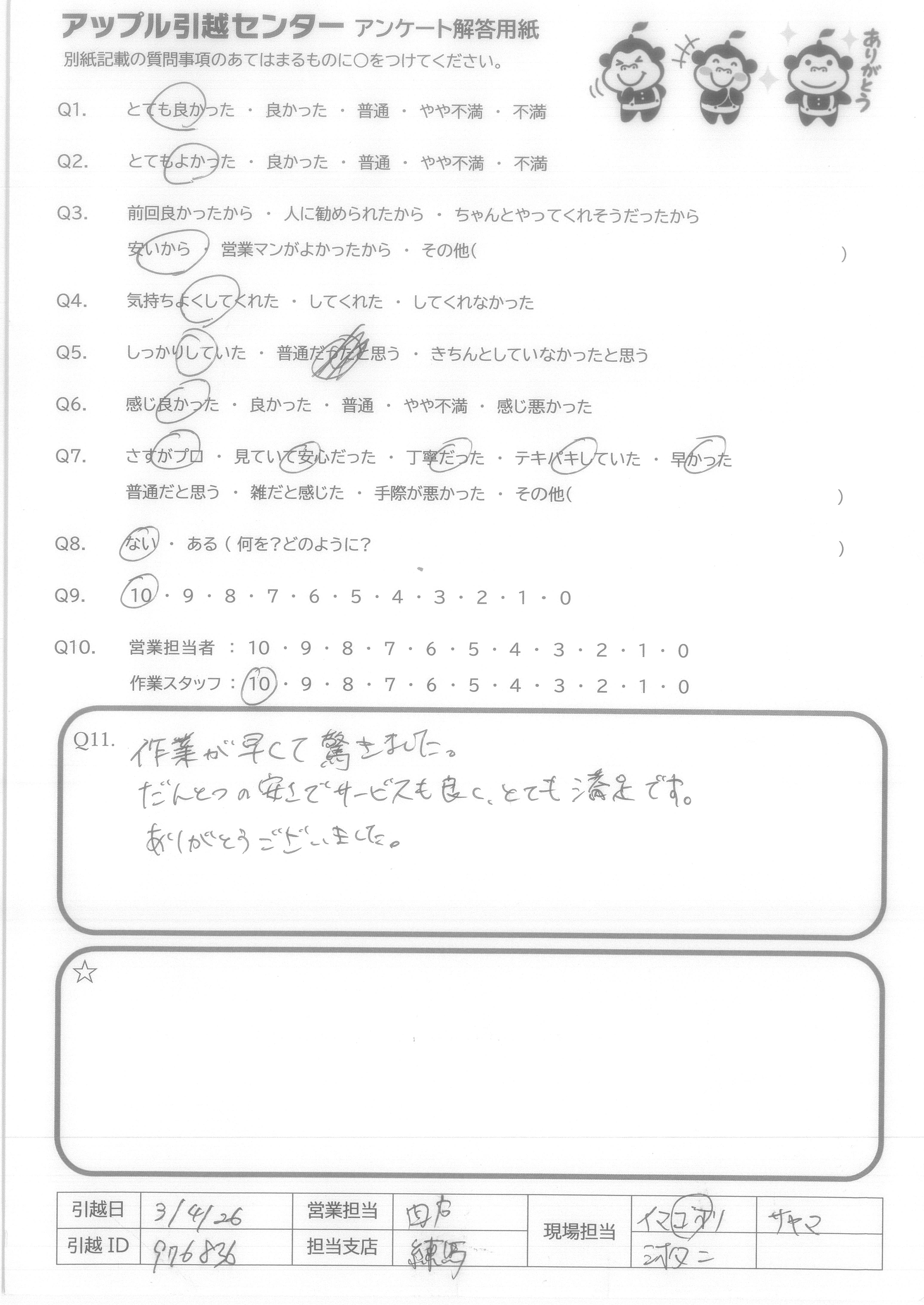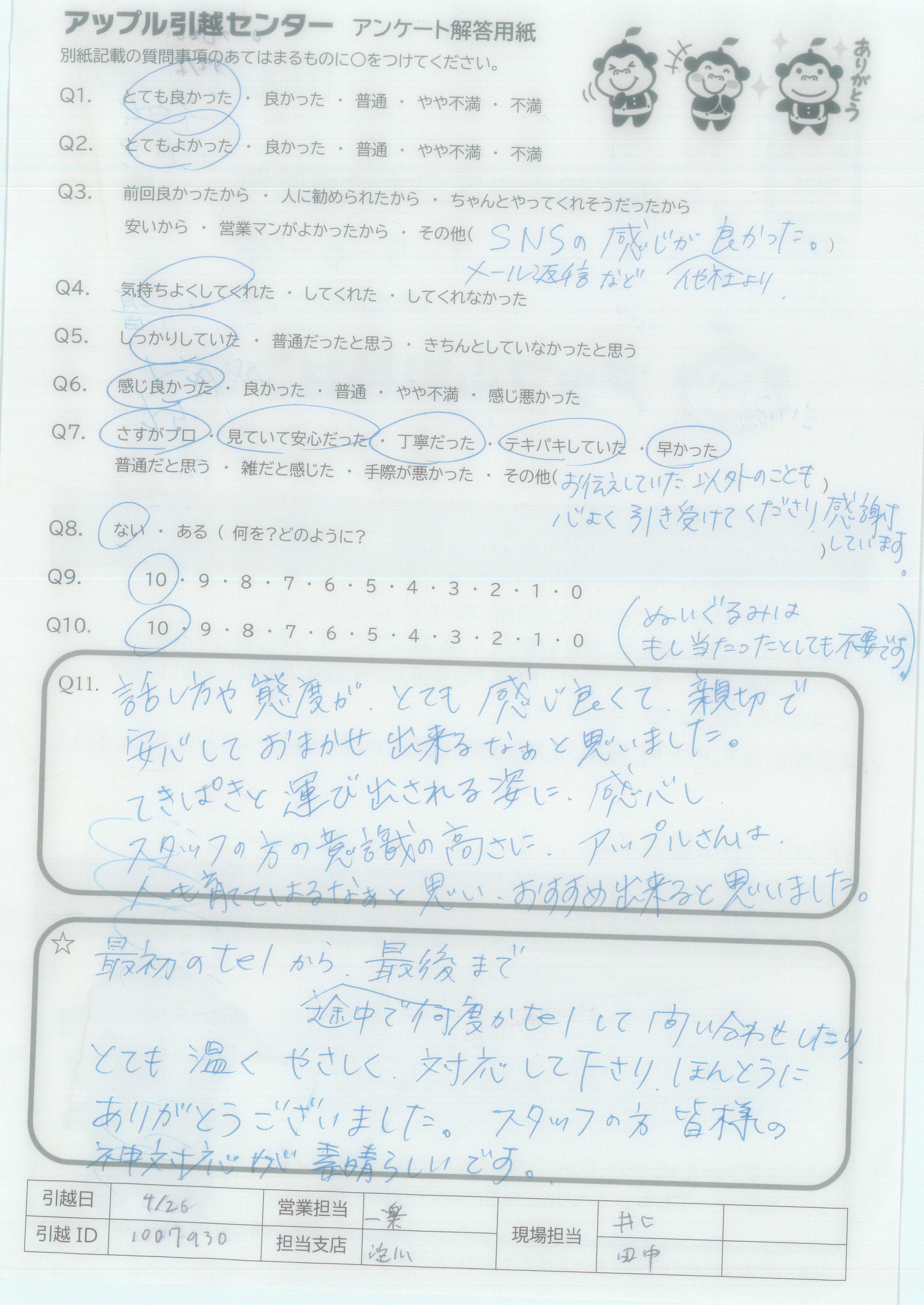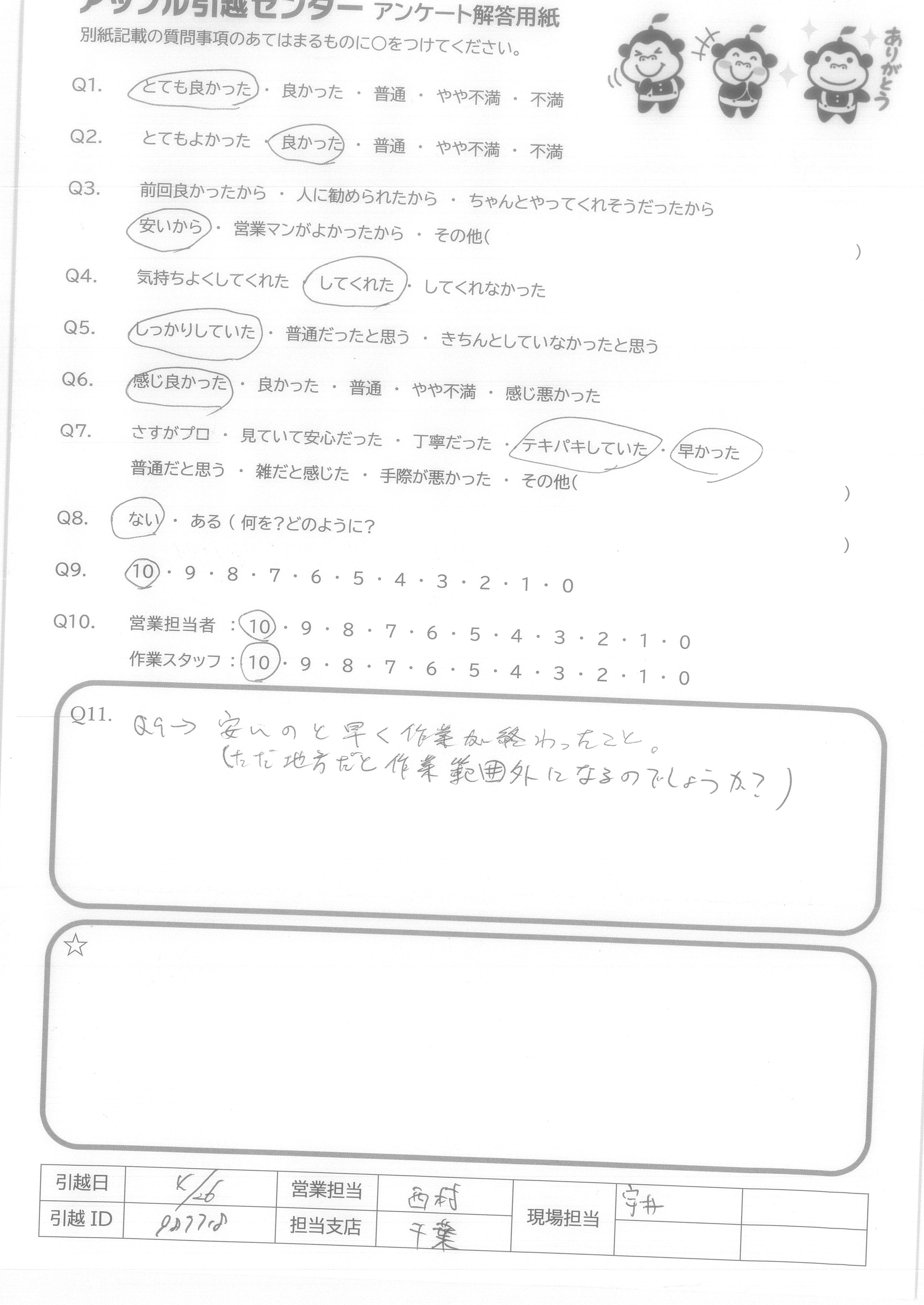 A.荷物が大量すぎて大変な引っ越しだったと思いますが、最後まで親切に対応してくださりとても感謝しています。特に言葉遣いに関しては皆様最後まで丁寧で、徹底した社内教育を感じました。社員さんとアルバイトさん(または新人さん?)がペアになって当日訪問してくださったのですが、新居に荷物を運びいれる際に指示が行き届かなかったみたいで、周囲に段ボール、真ん中に家具や衣装ケースがあったので、開梱がとにかく大変でした。それから、台座が無いので洗濯機を繋げるのが難しいと言われてしまい、保証書はその埋まった段ボールの中…ちょっと気持ちが萎えました。こんなこともあるんだなと勉強になりましたが、皆様最後まで優しかったのでトータル的には満足しています。荷物が大量過ぎたせいもあると思いますが、家具などに多少傷があったりしたのでそこは残念でした。テーブルやデスクが何個もあったので大変だっただろうなと思いますが、カバーをかけて貰えたら嬉しかったです。あと、冷蔵庫も狭いところに入れて貰ったので仕方がない…とは思いますが、やっぱり傷を見るとちょっと悲しいですね。でも、大変な引っ越し過ぎて終わらなくて、途中で人数を増やして貰ってやっと終わった…という感じだったので、その割には超格安だったと思います。こんなに荷物が増えていたんだとビックリする量でした。他社だったらオプションついているなって思います。本当に最初に決めて貰った値段だったのでそれは驚きでした。無理を言ったと思いますが、頑張って貰って本当に感謝しています。皆様遅くまでありがとうございました。 …ということで、衣装ケースや家具を周りに置いて欲しかった、洗濯機繋げて欲しかった(もしくは台座が必要なら先に教えて貰えてたら嬉しかった(皆様が帰った30分後に台座が届きましたが、ゴールデンウィークをはさんでしまったので洗濯機屋さんは明日来ます))、家具に傷がなければ…と言うところをマイナスして70点です。多分値切らずに最初からベテランさん揃いで人数集めて貰っていたら解決していただろうなと思うことなので、値切った私にも問題がありますので仕方がないですね。神経質な人にはすすめられないですが、「ちょっとくらいの傷気にしないよ」っていう友達にならものすごくすすめたいです。