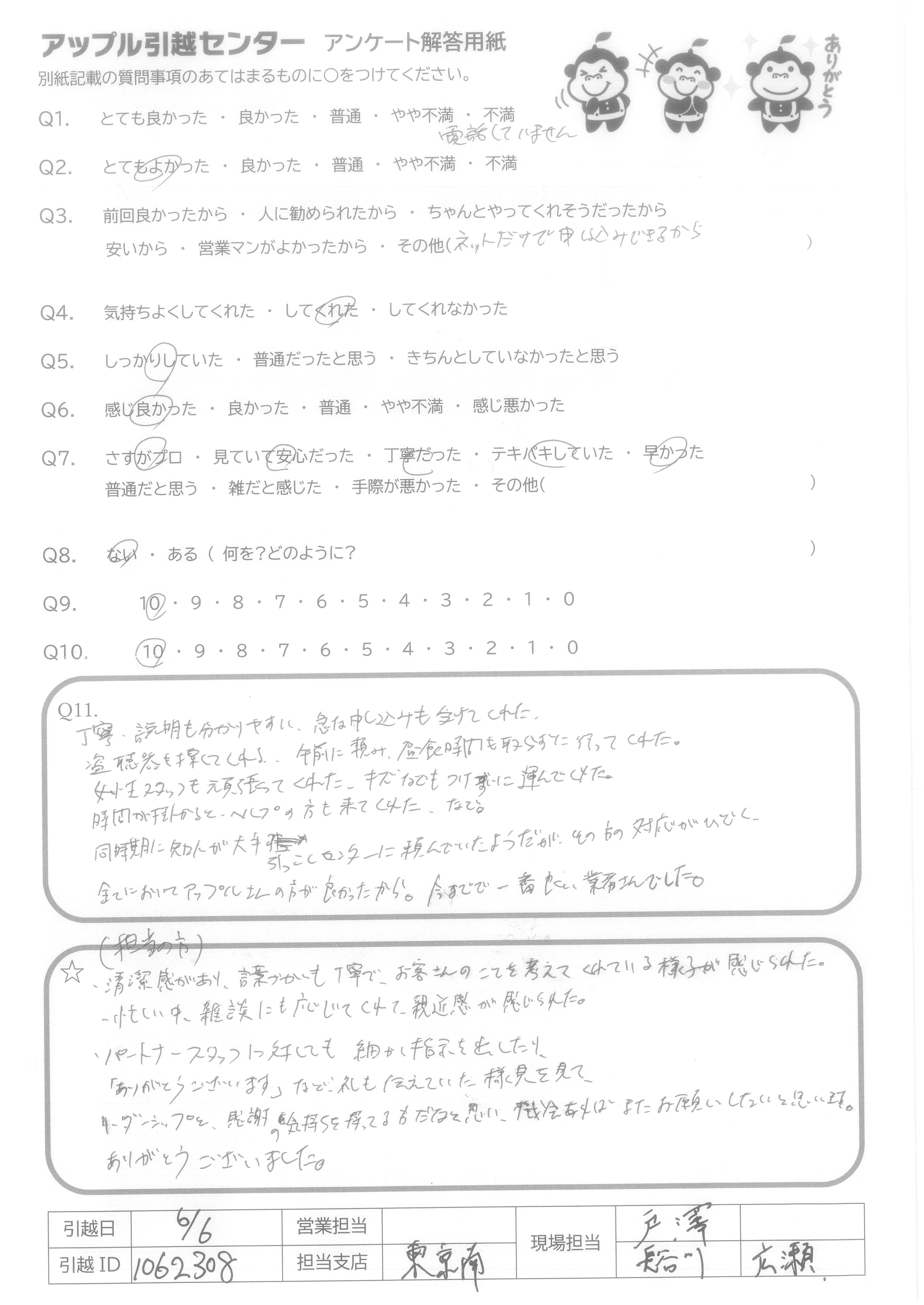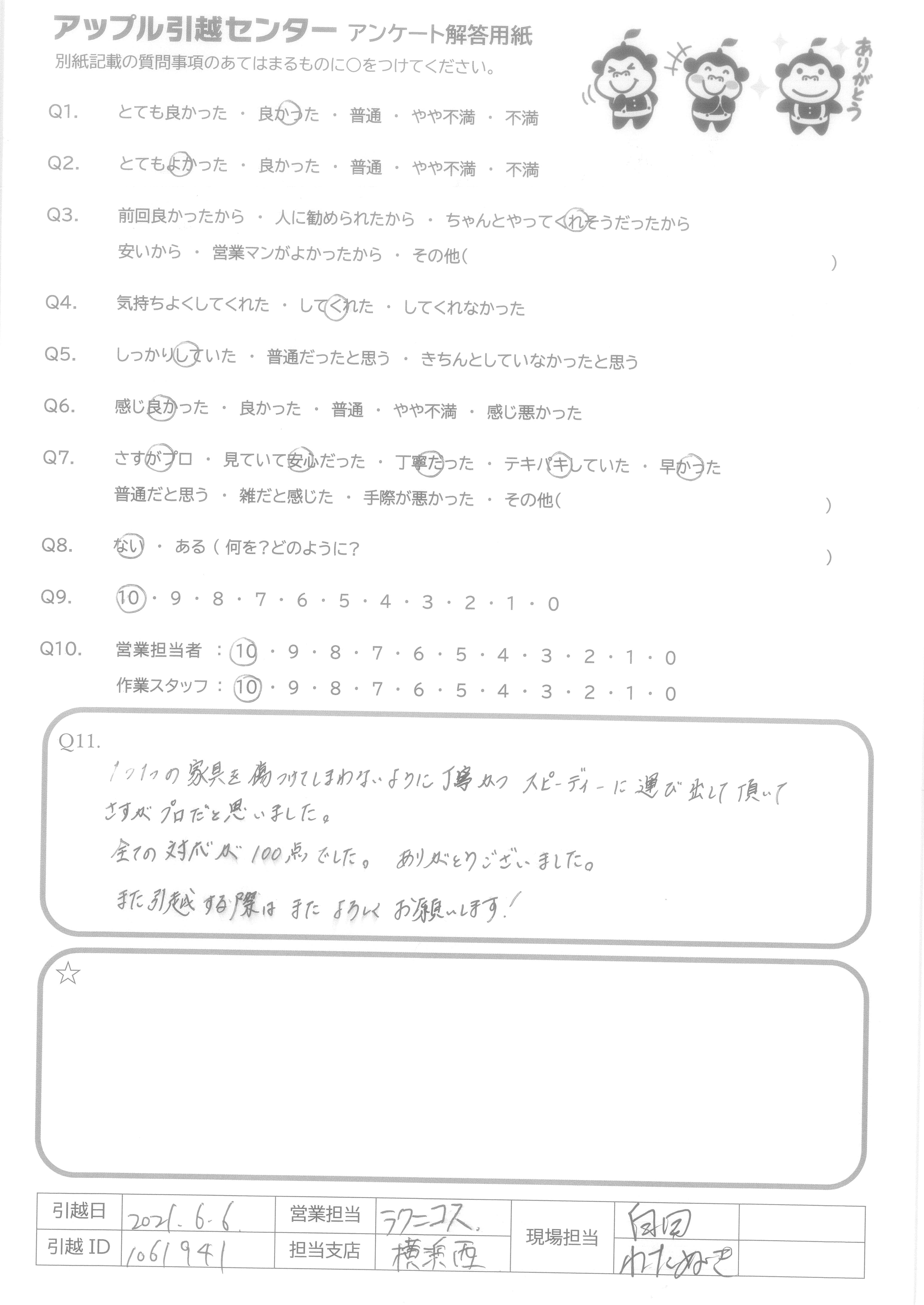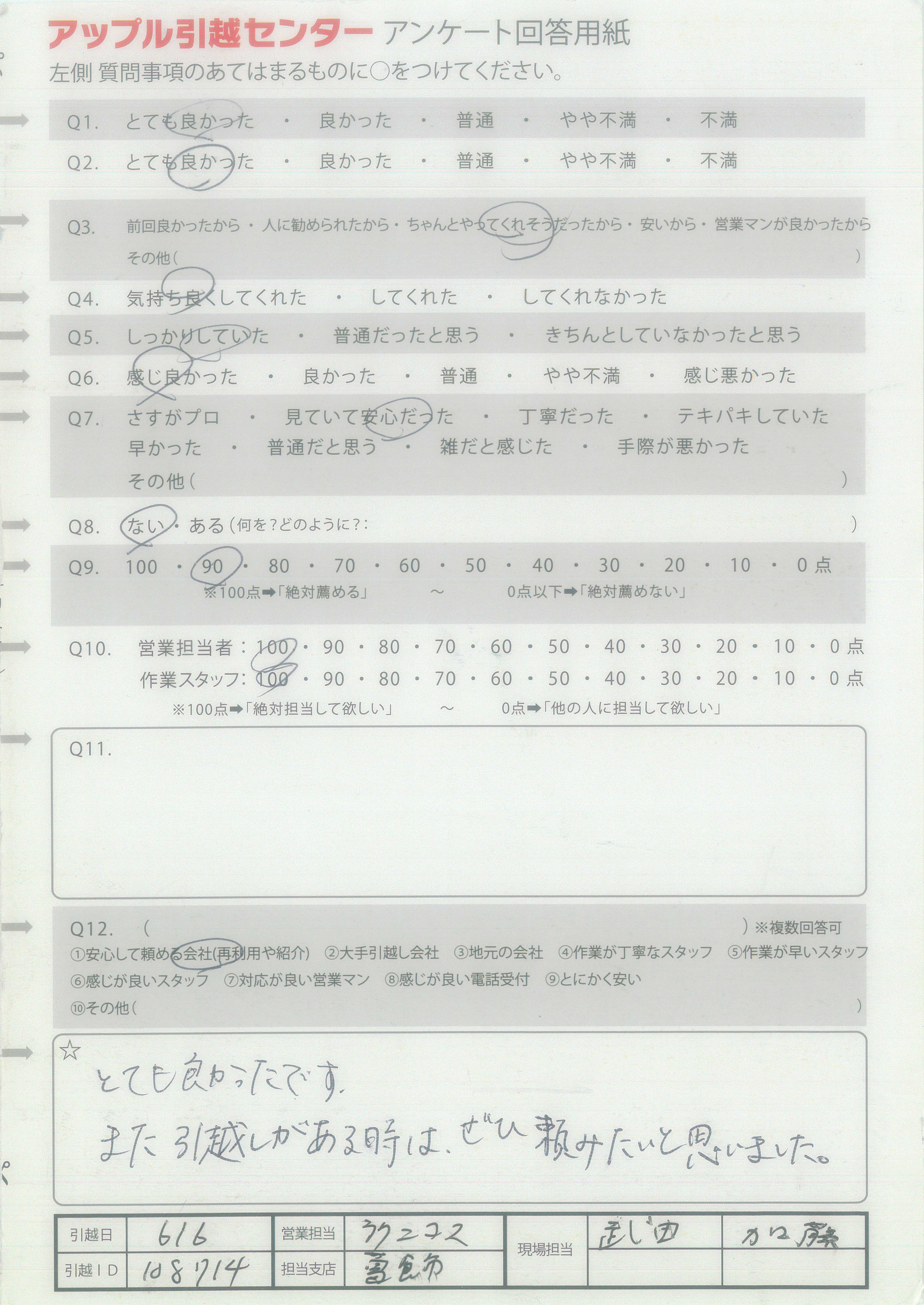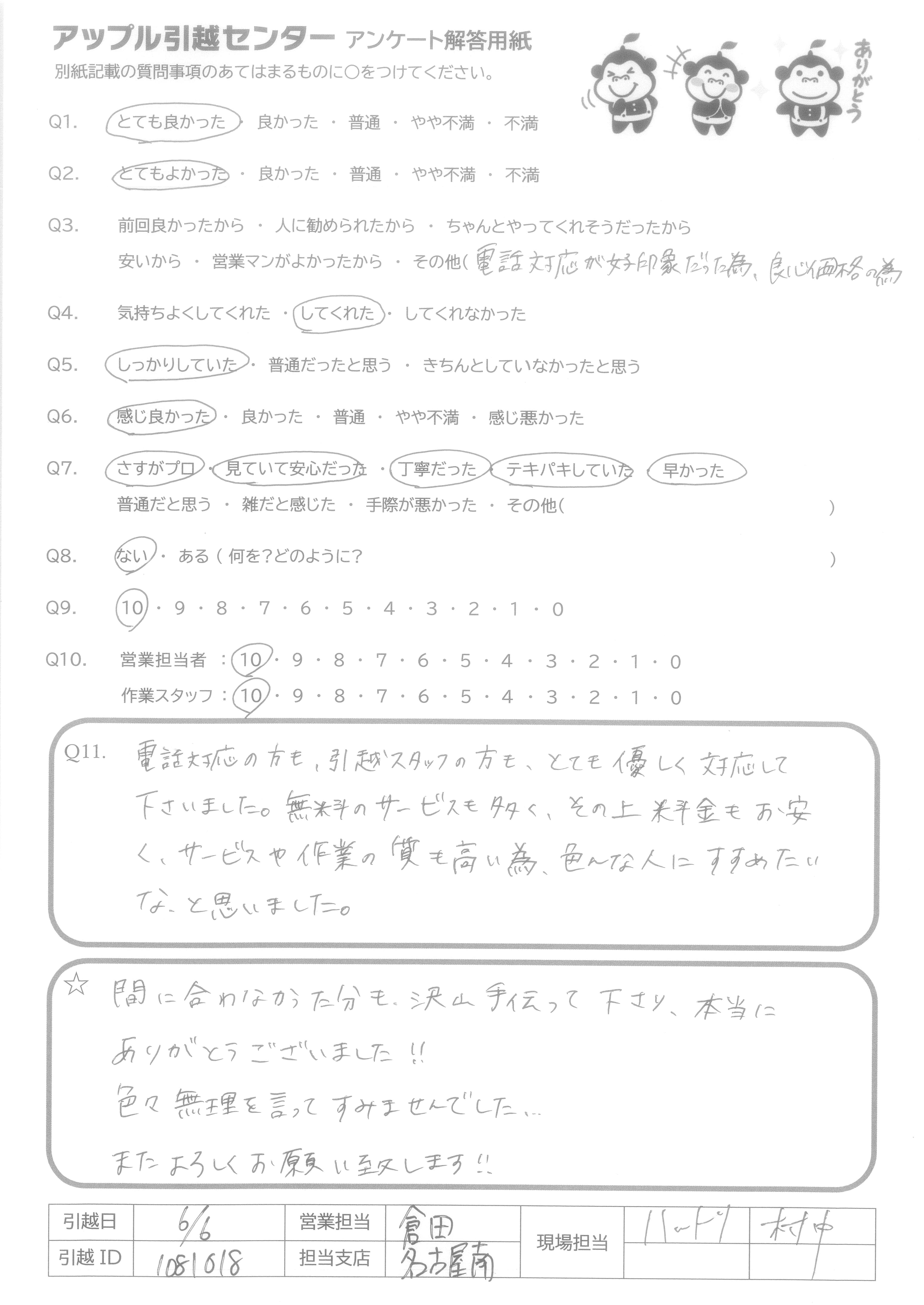A.非常にスムーズに対応して頂き、とても感謝しています。 初めての引っ越しで分からない点も多くありましたが、アップルさんに頼んでよかったです。