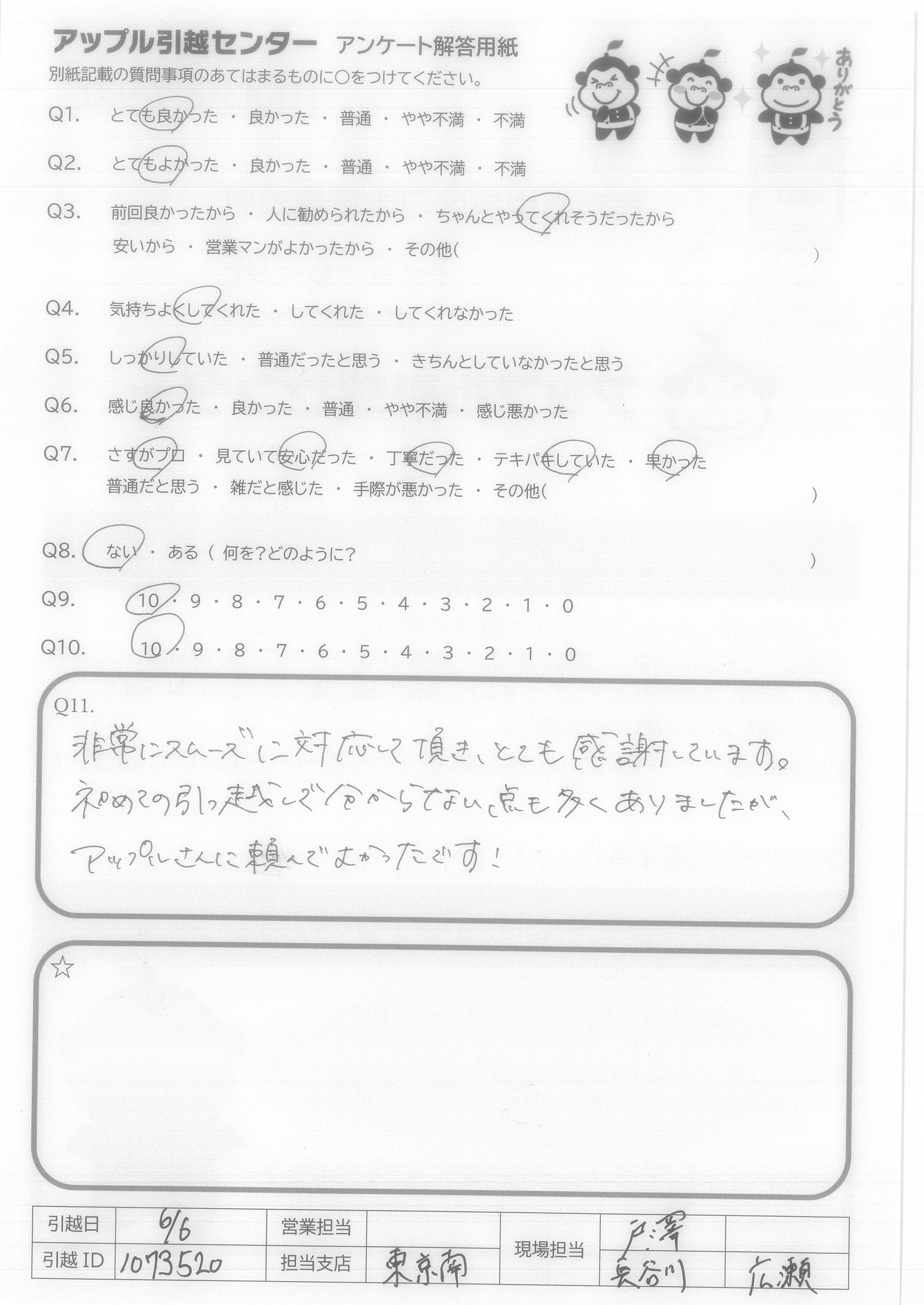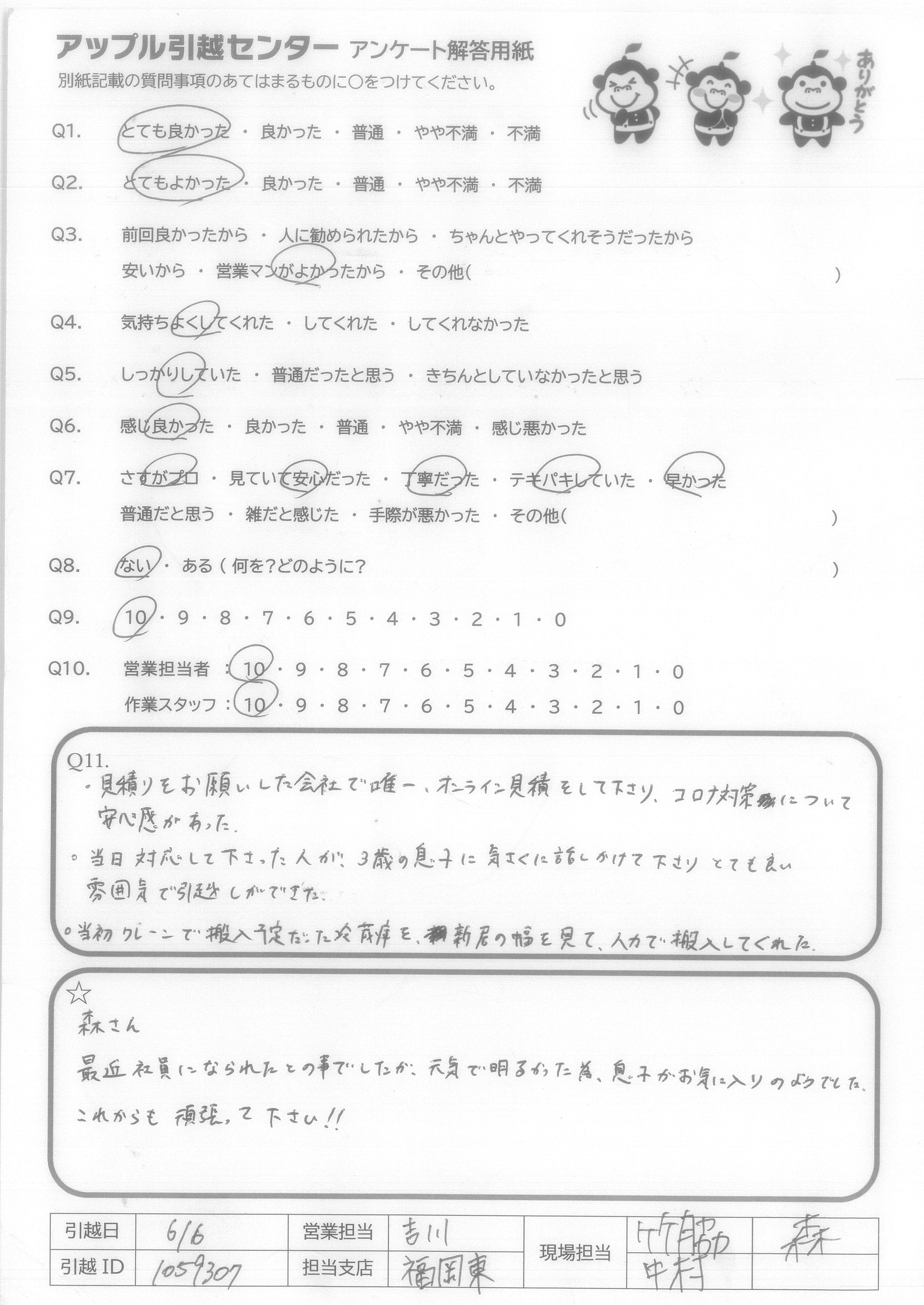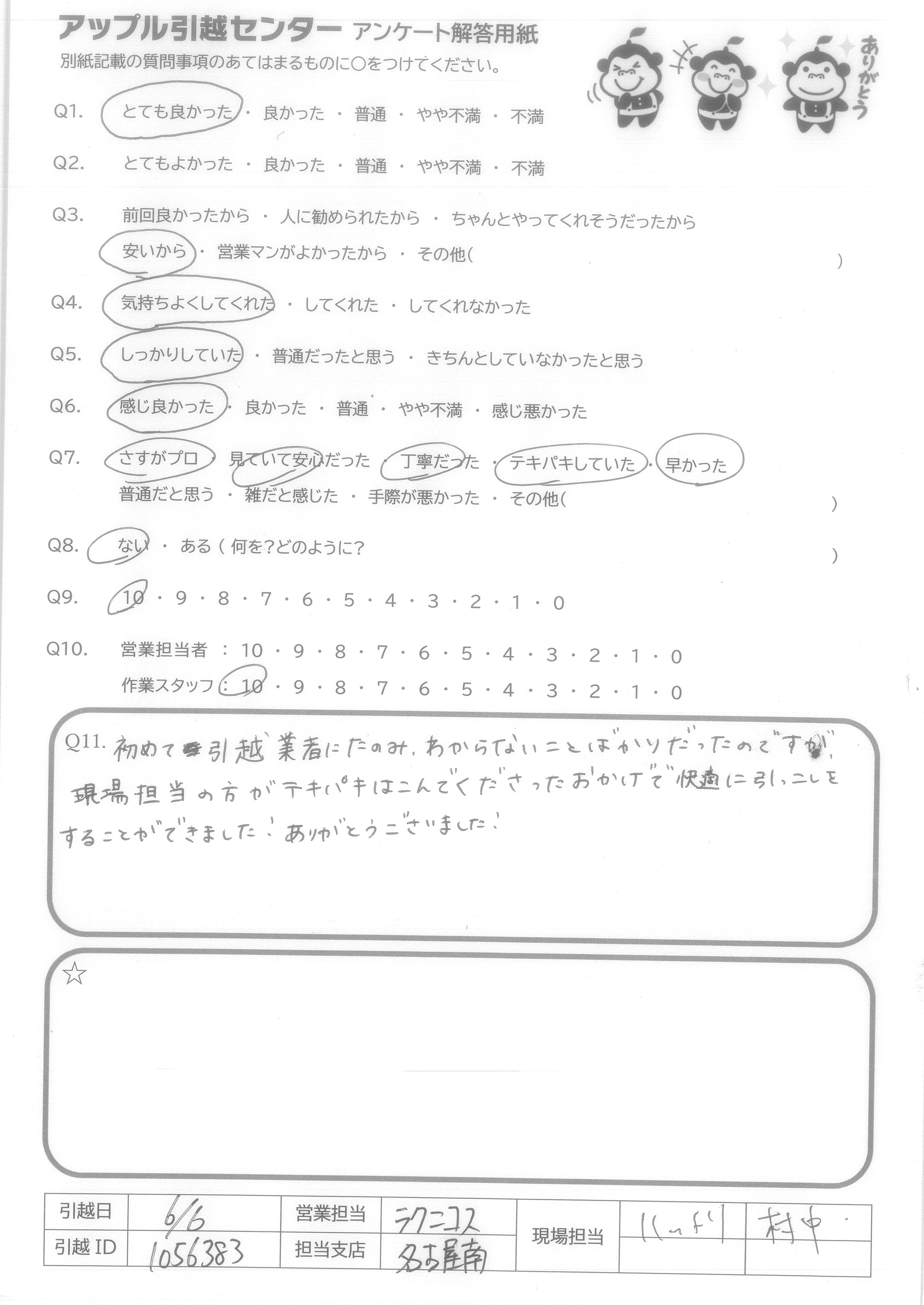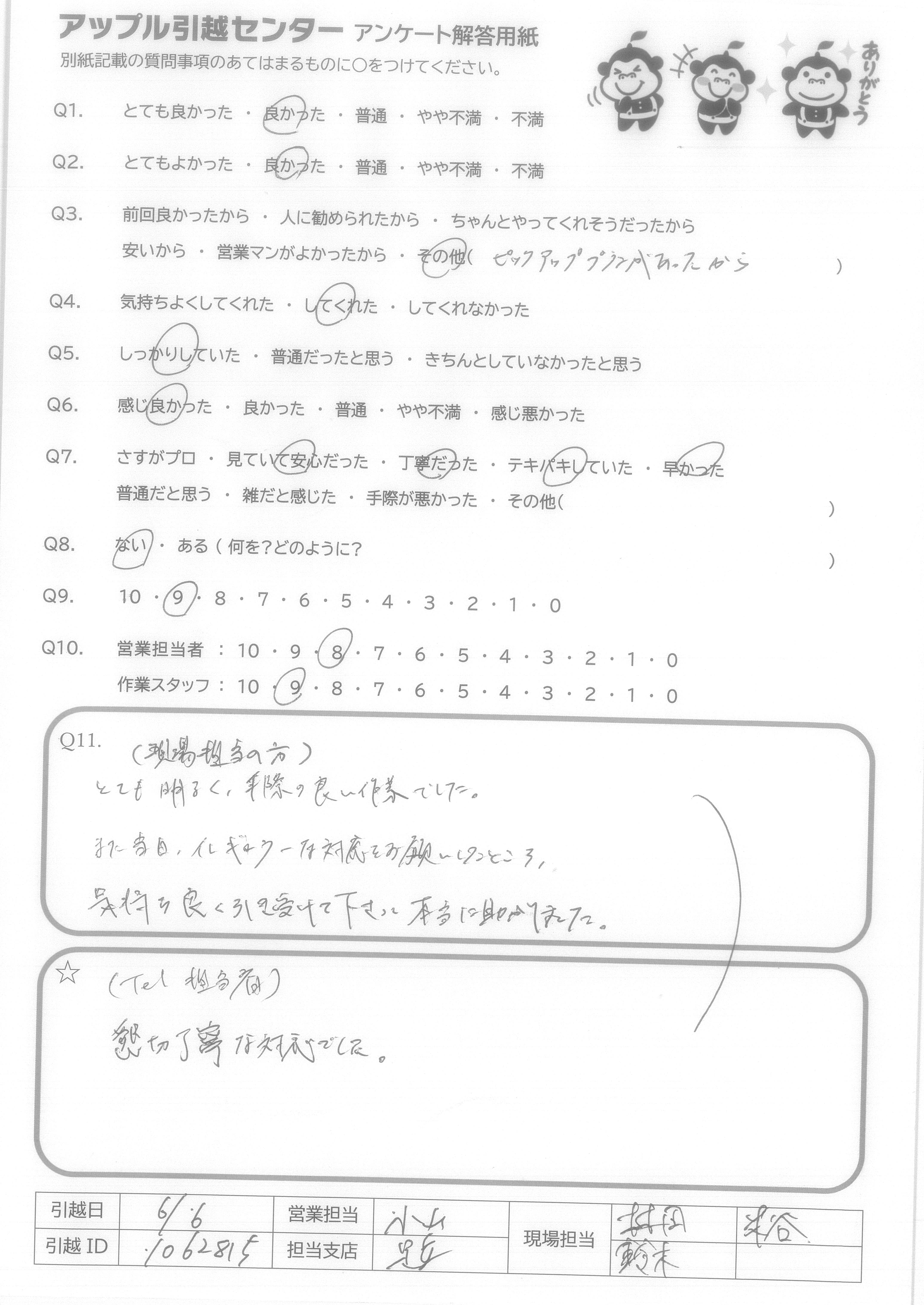 A.非常にスムーズに対応して頂き、とても感謝しています。 初めての引っ越しで分からない点も多くありましたが、アップルさんに頼んでよかったです。