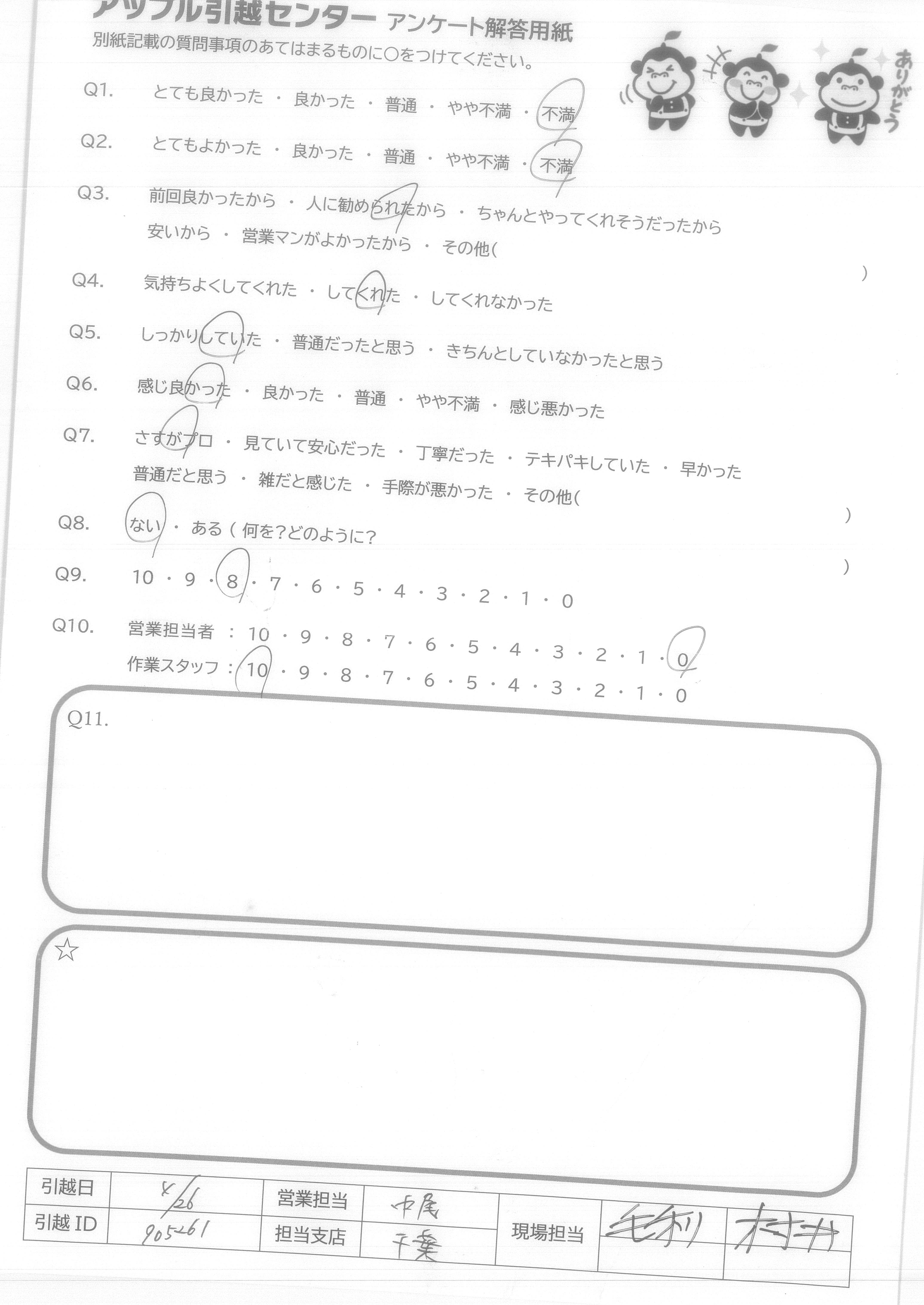 A.とても良かったし、知人にもおススメしたい引越社です。まぁ、ちょっと気になったところはおつり200円もらい忘れたことくらいです。 私のミスなので気にしないで下さい。