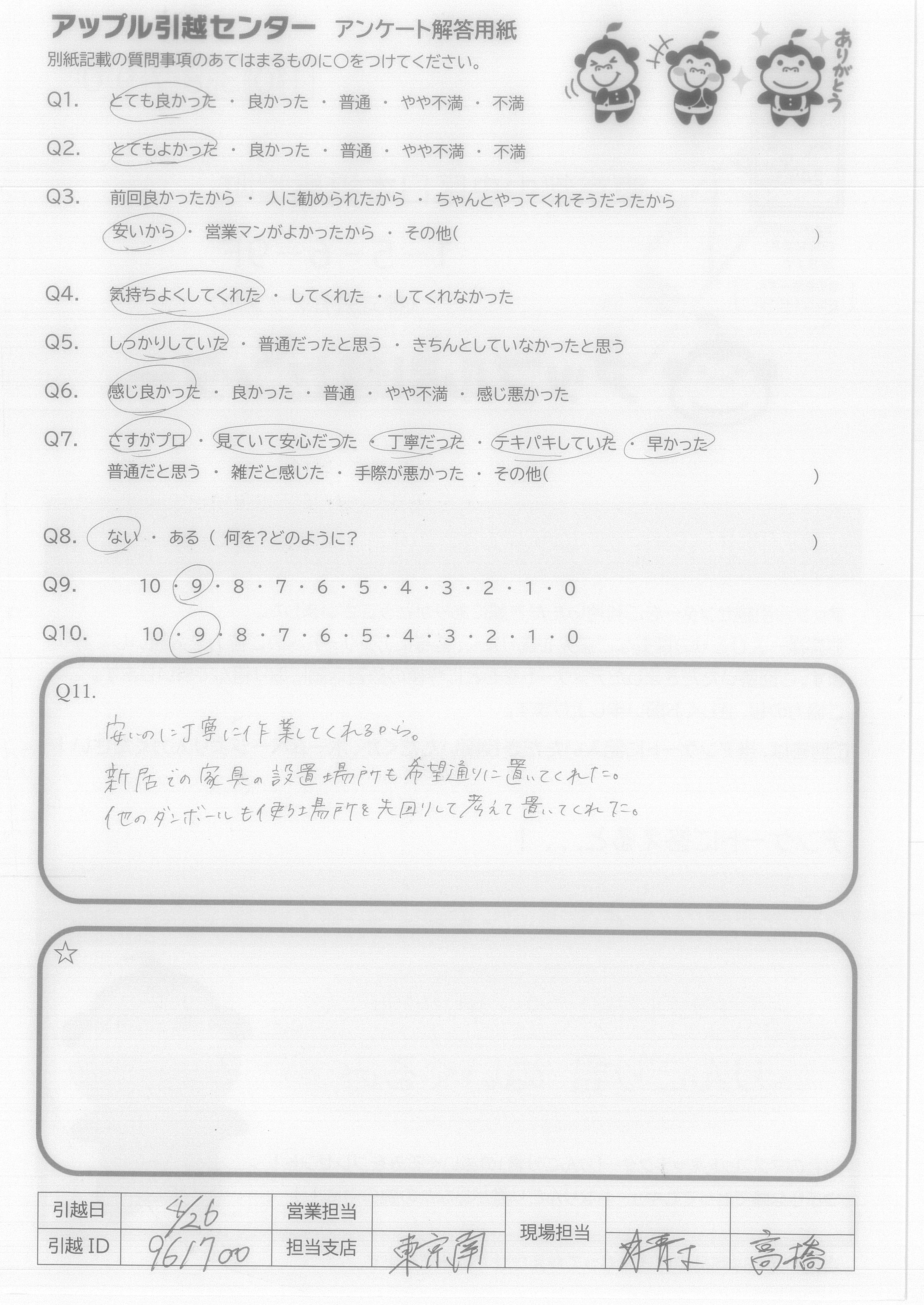 A.安いのに丁寧に作業してくれるから。 新居での家具の設置場所も希望通りに置いてくれた。 他のダンボールも使う場所を先回りして考えて置いてくれた。