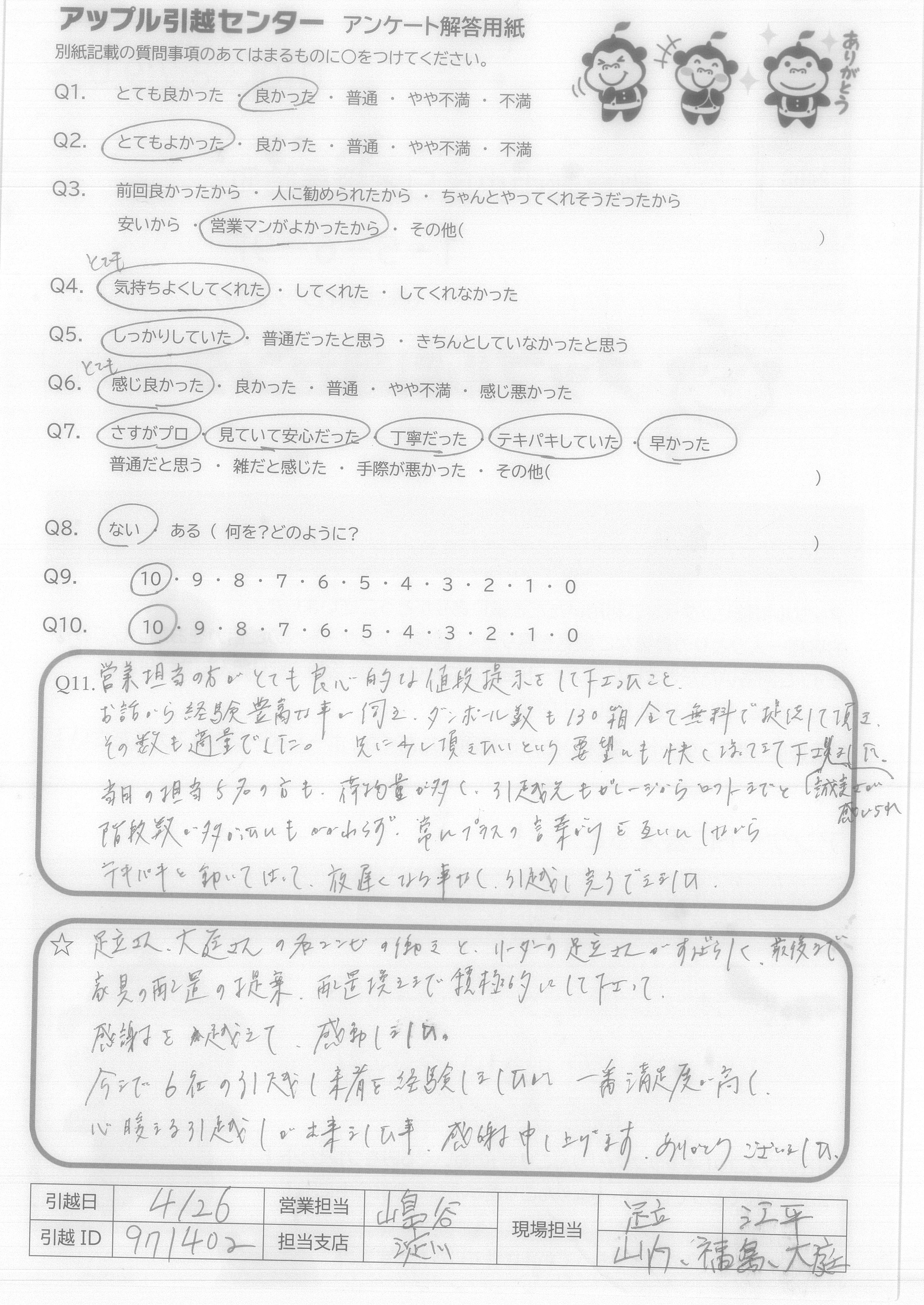 A.足立さん、大庭さんの名コンビの働きとリーダーの足立さんがすばらしく、最後まで家具の配置の提案、配置換えまで積極的にして下さって、感謝を超えて感動しました。 今まで6社の引越し業者を経験しましたが、一番満足度が高く、心暖まる引越しが出来ました事、感謝申し上げます。ありがとうございました。