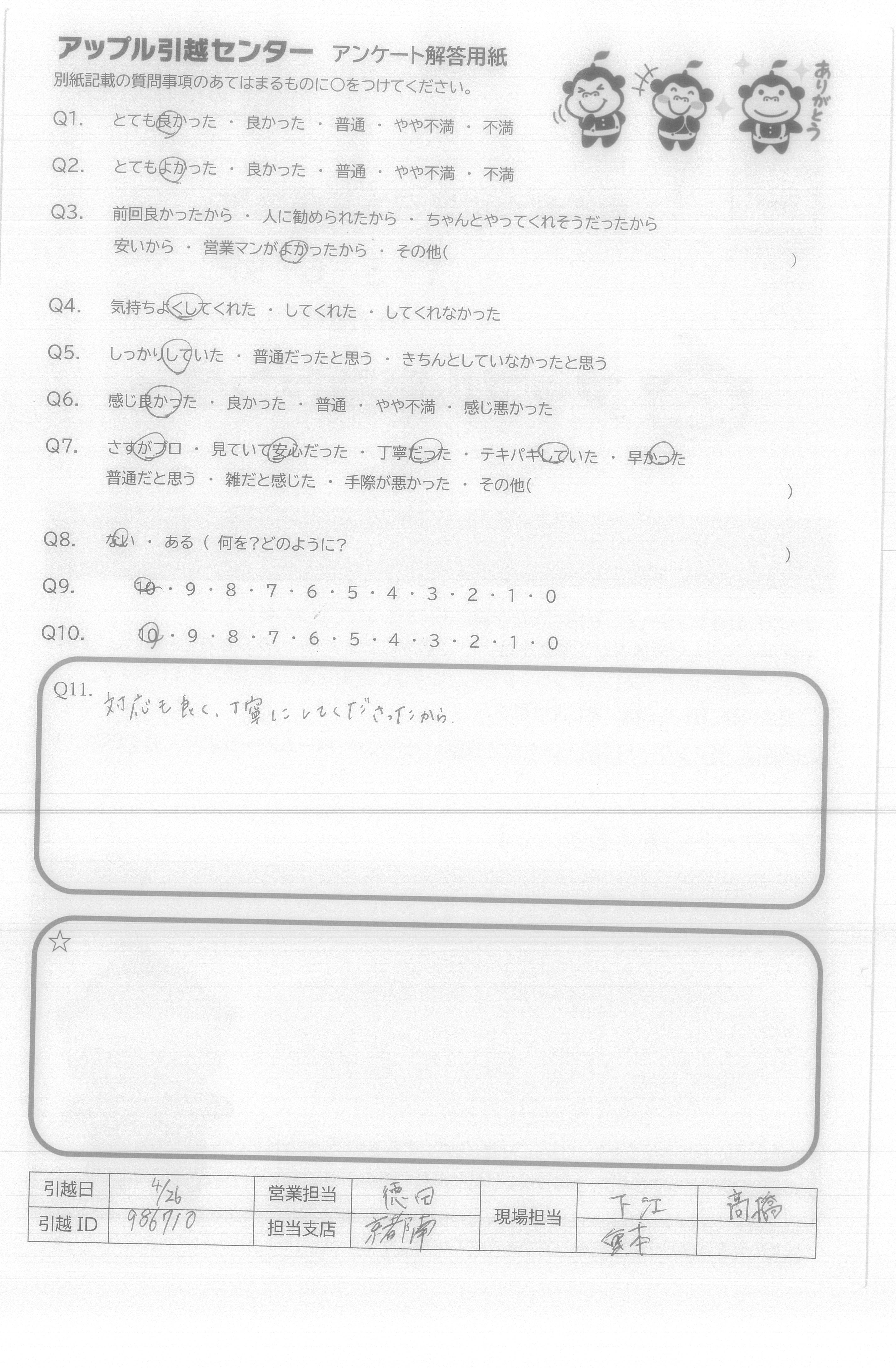 A.感想や要望は上に全部書いてしまいました。 引っ越しシーズンの大変な最中に、大変な引っ越し…本当にありがとうございました。急に引っ越しが決まったので荷物を減らしきれずご迷惑をおかけしました。足の指は大丈夫でしたか?それから洗濯機を1人で持ったら腰を痛めるので心配でした。重い荷物を笑顔で運ぶなんて、本当にすごいお仕事だと思っています。皆様お体を大切に、これからも頑張ってください。