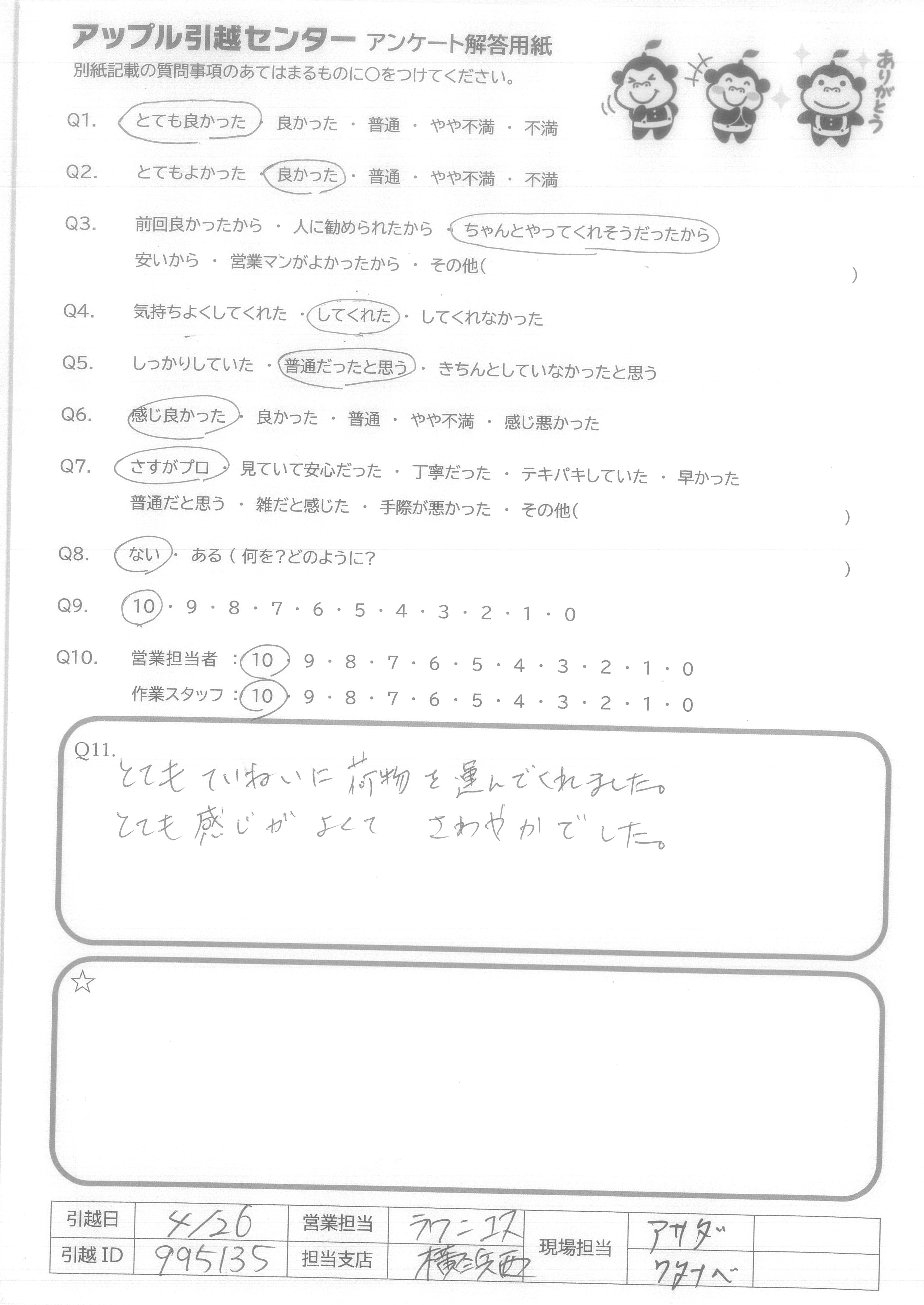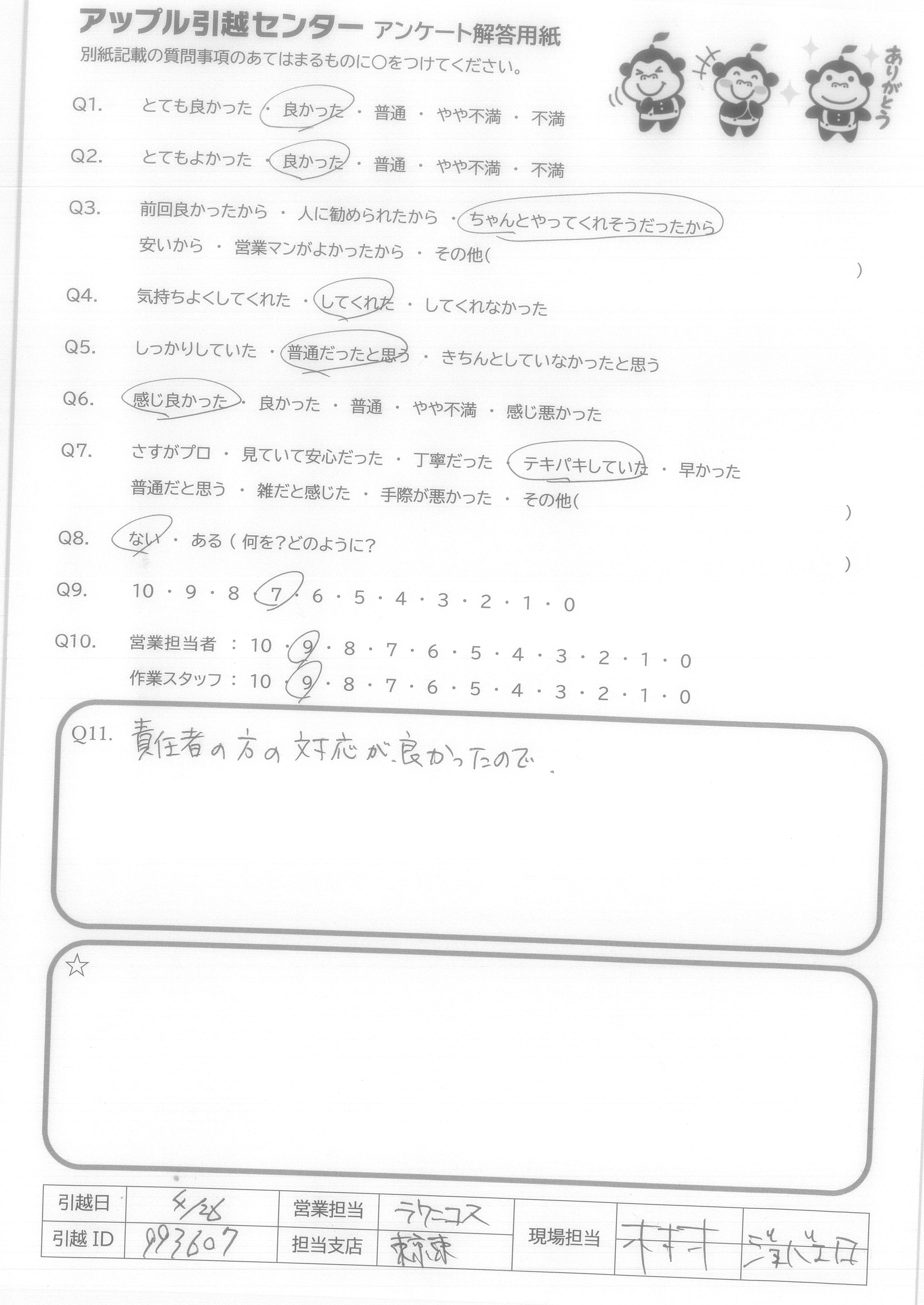 A.話し方や態度がとても感じ良くて親切で安心しておまかせ出来るなあと思いました。 てきぱきと運び出される姿に、感心し、スタッフの方の意識の高さに、アップルさんは人も育てているなあと思い、おすすめ出来ると思いました。