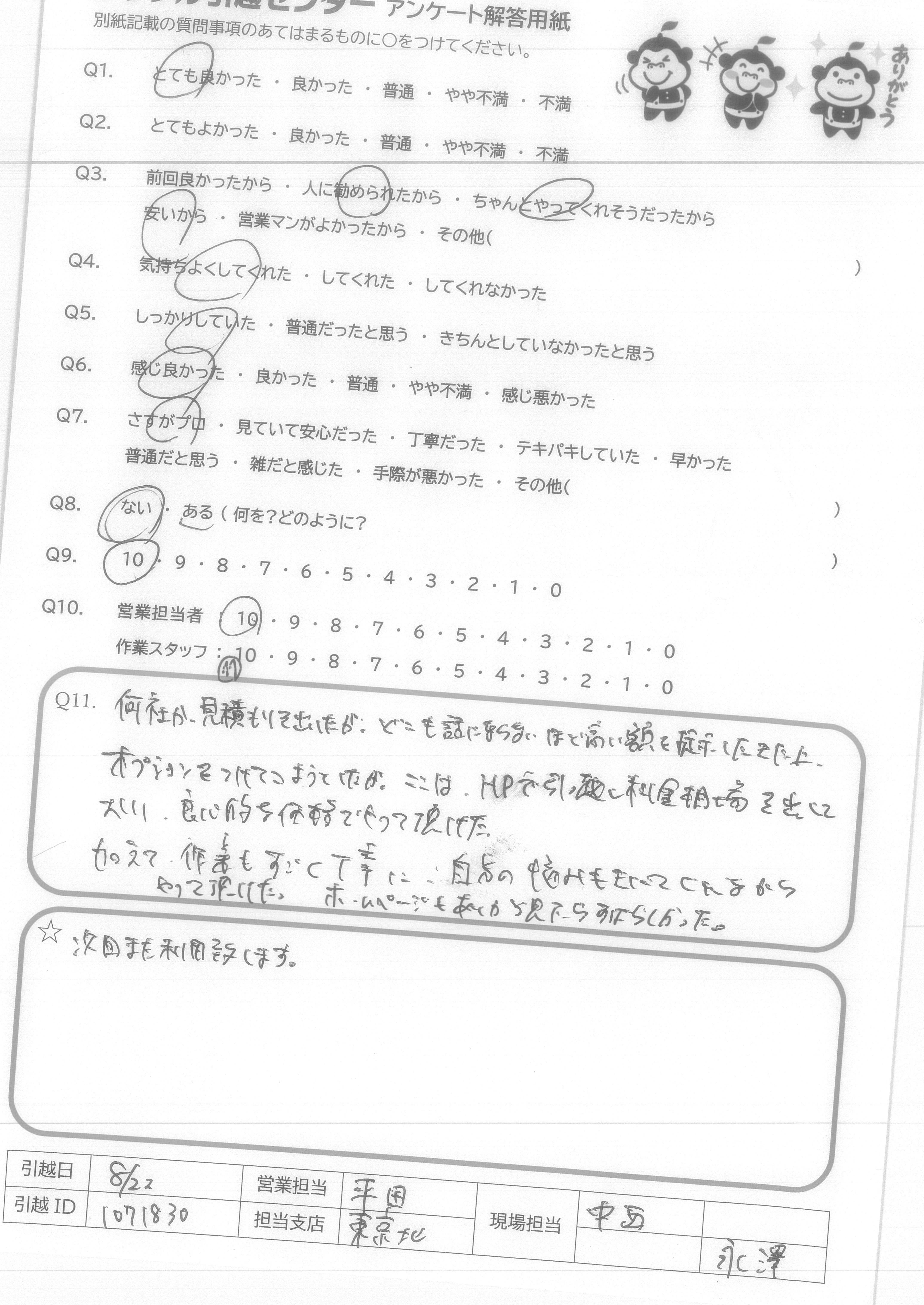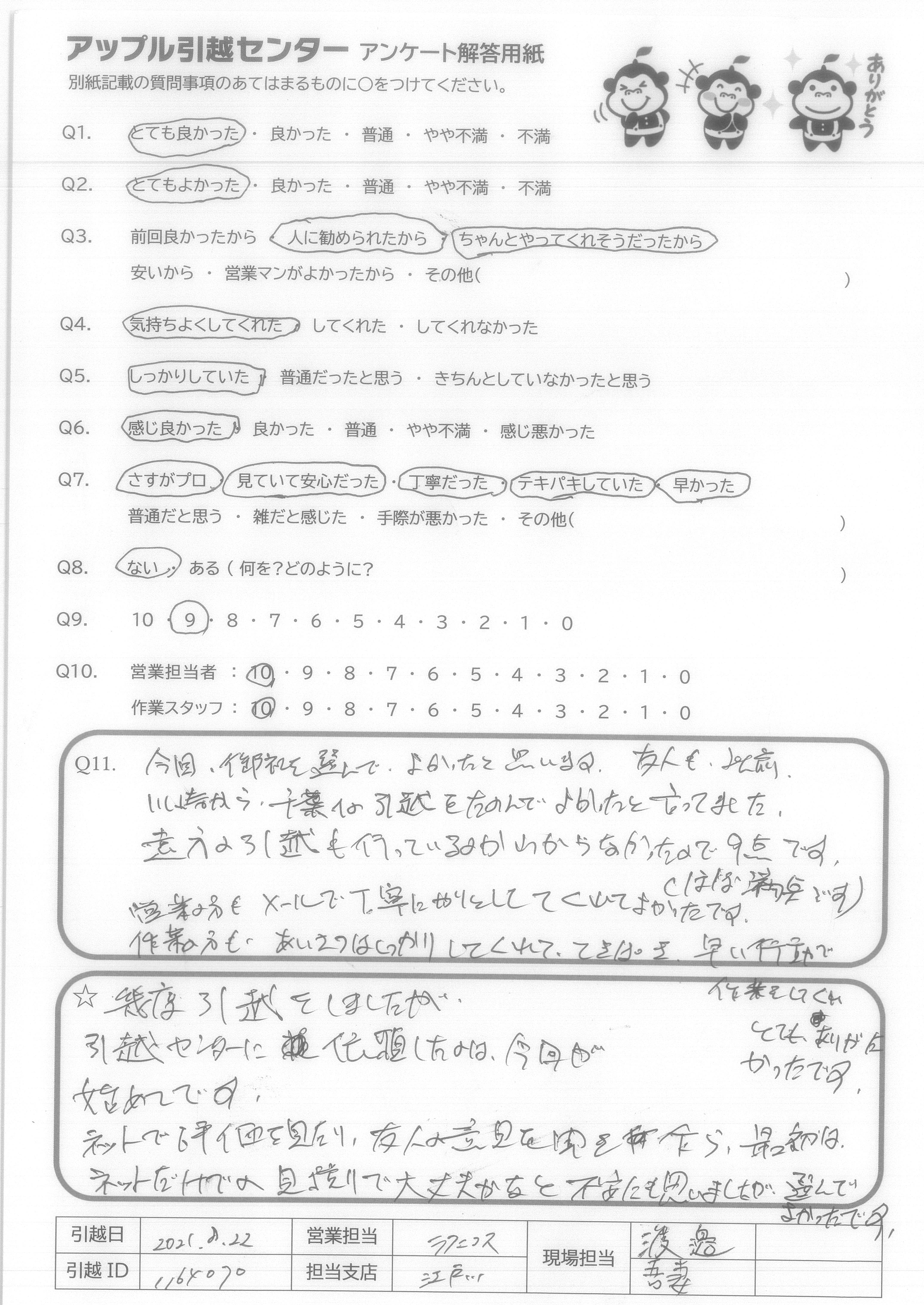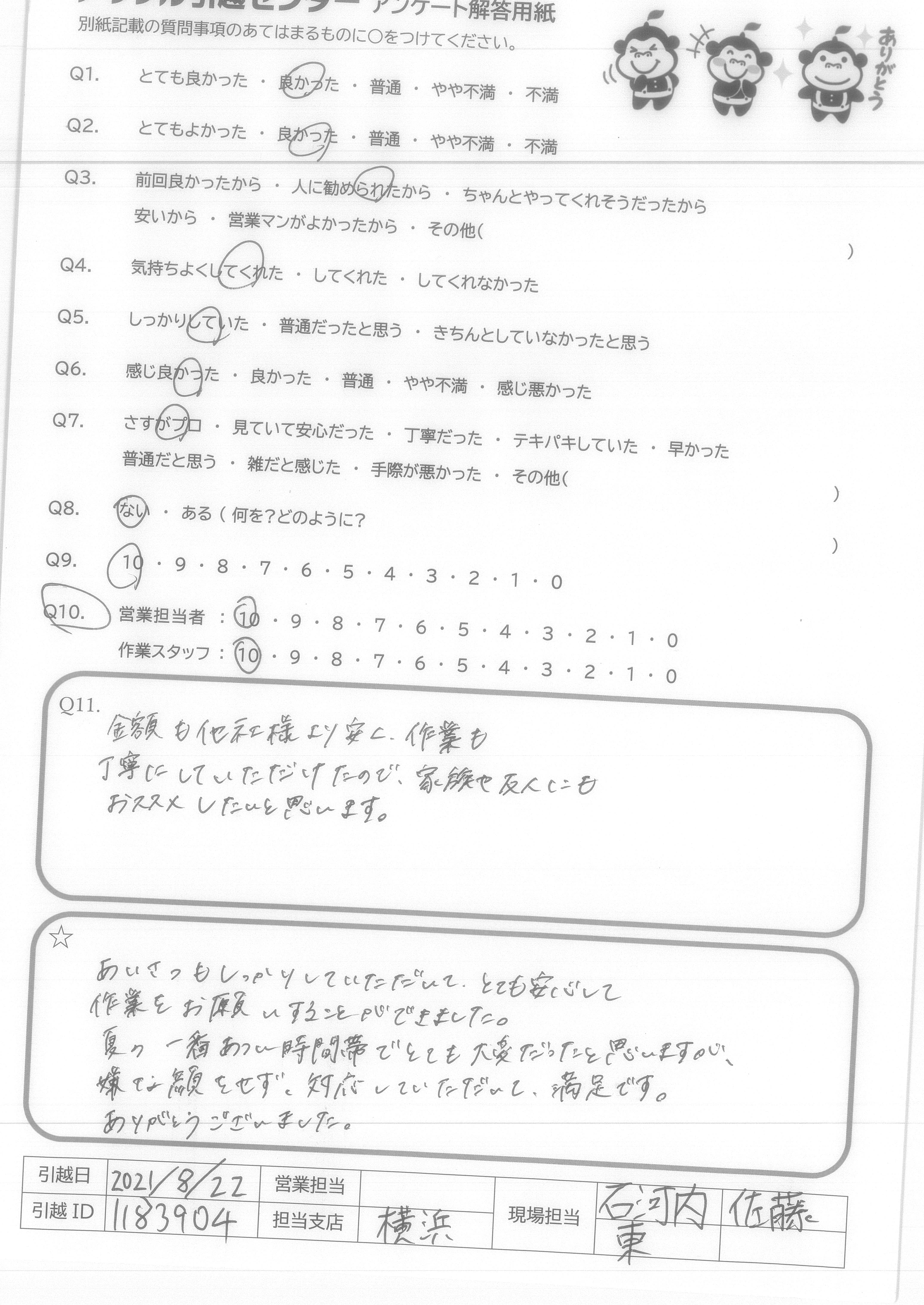 A.今回、御社を選んで、よかったと思います。友人も以前川崎から、千葉への引越をたのんでよかったと言ってました。遠方の引越も行っているかわからなかったので、9点です。(ほぼ満点です) 営業の方もメールで丁寧にやりとりしてくれてよかったです。 作業の方も、あいさつはしっかりしてくれててきぱき早い行動で作業をしてくれとてもありがたかったです。