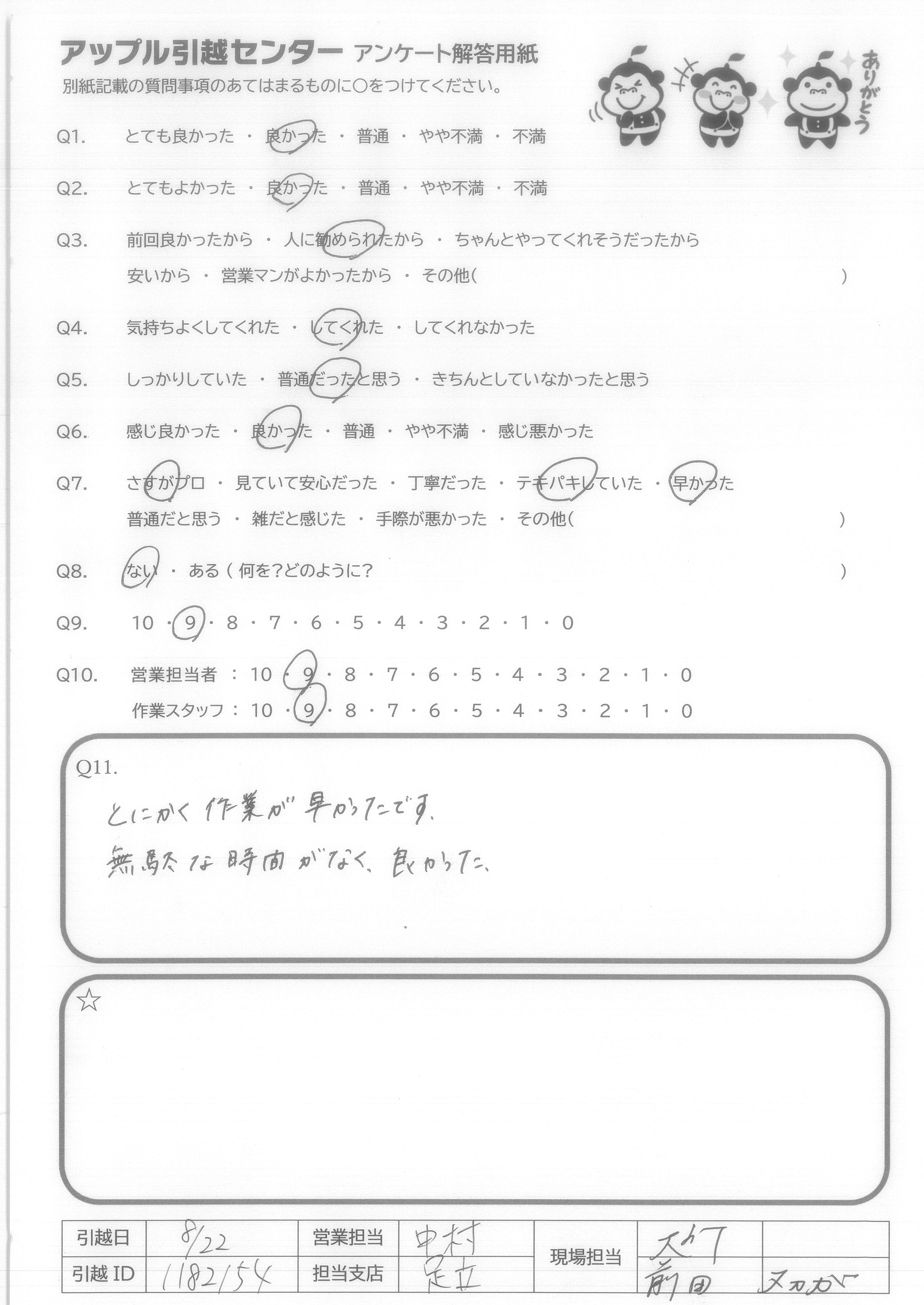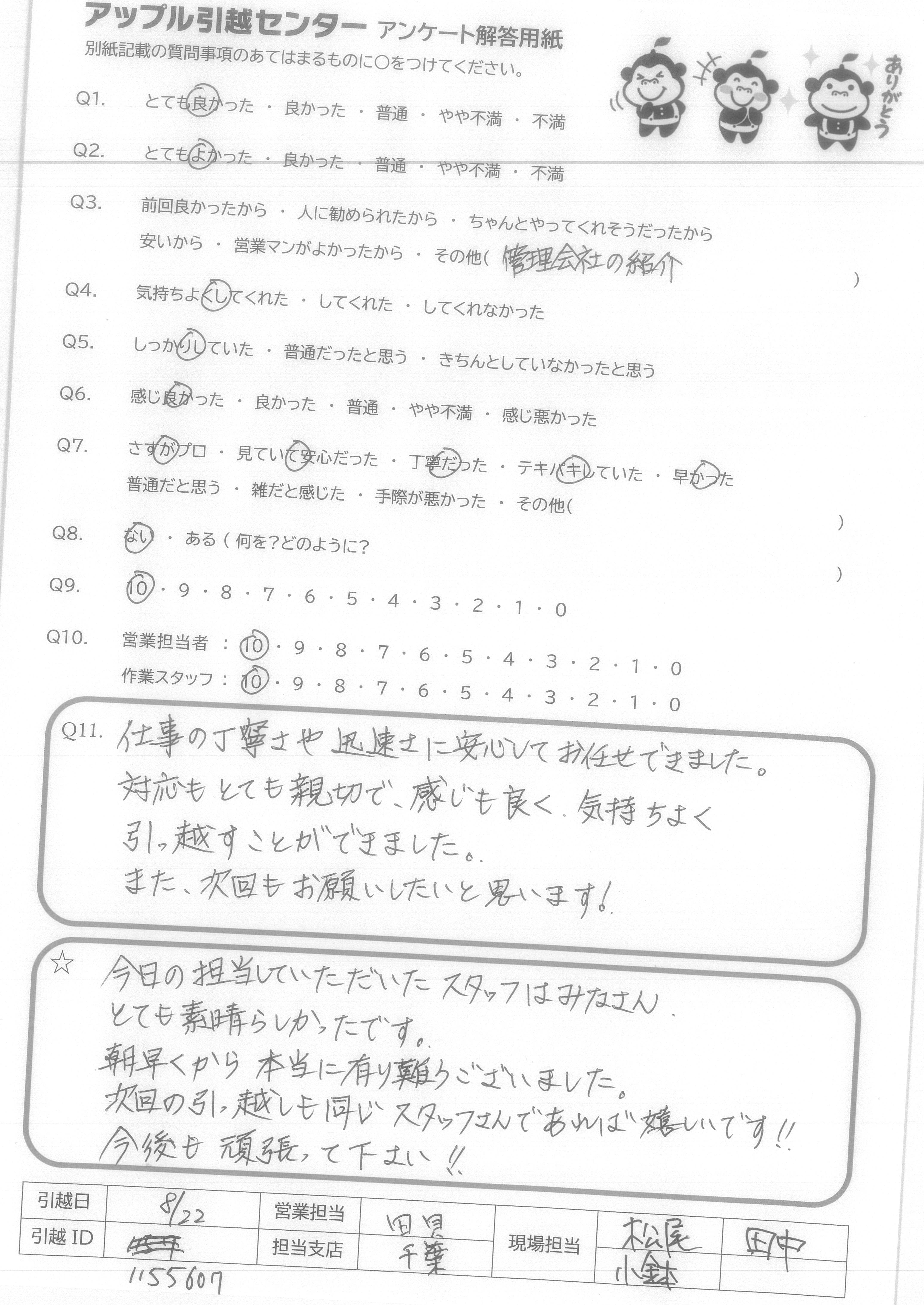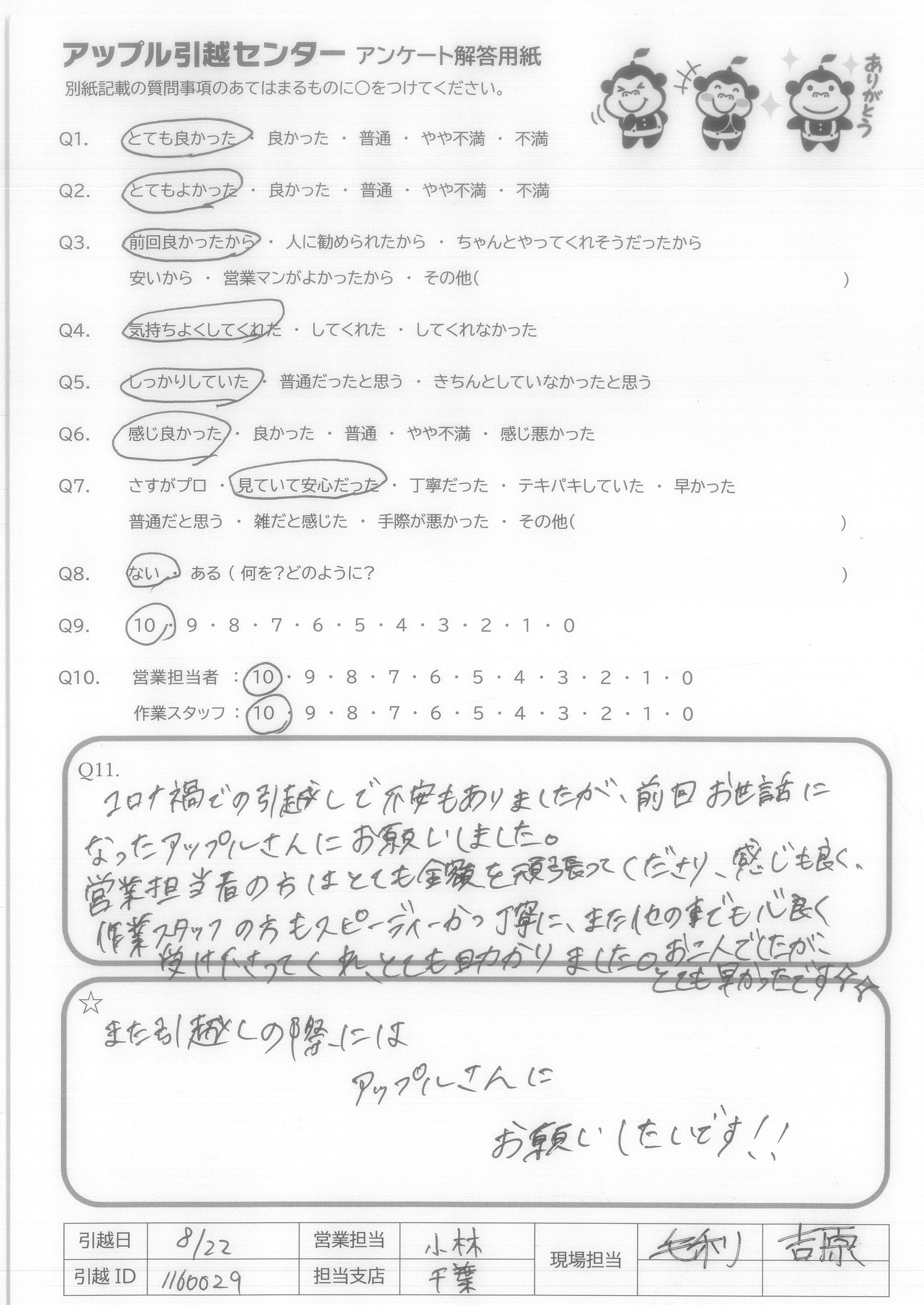 A.今回、御社を選んで、よかったと思います。友人も以前川崎から、千葉への引越をたのんでよかったと言ってました。遠方の引越も行っているかわからなかったので、9点です。(ほぼ満点です) 営業の方もメールで丁寧にやりとりしてくれてよかったです。 作業の方も、あいさつはしっかりしてくれててきぱき早い行動で作業をしてくれとてもありがたかったです。