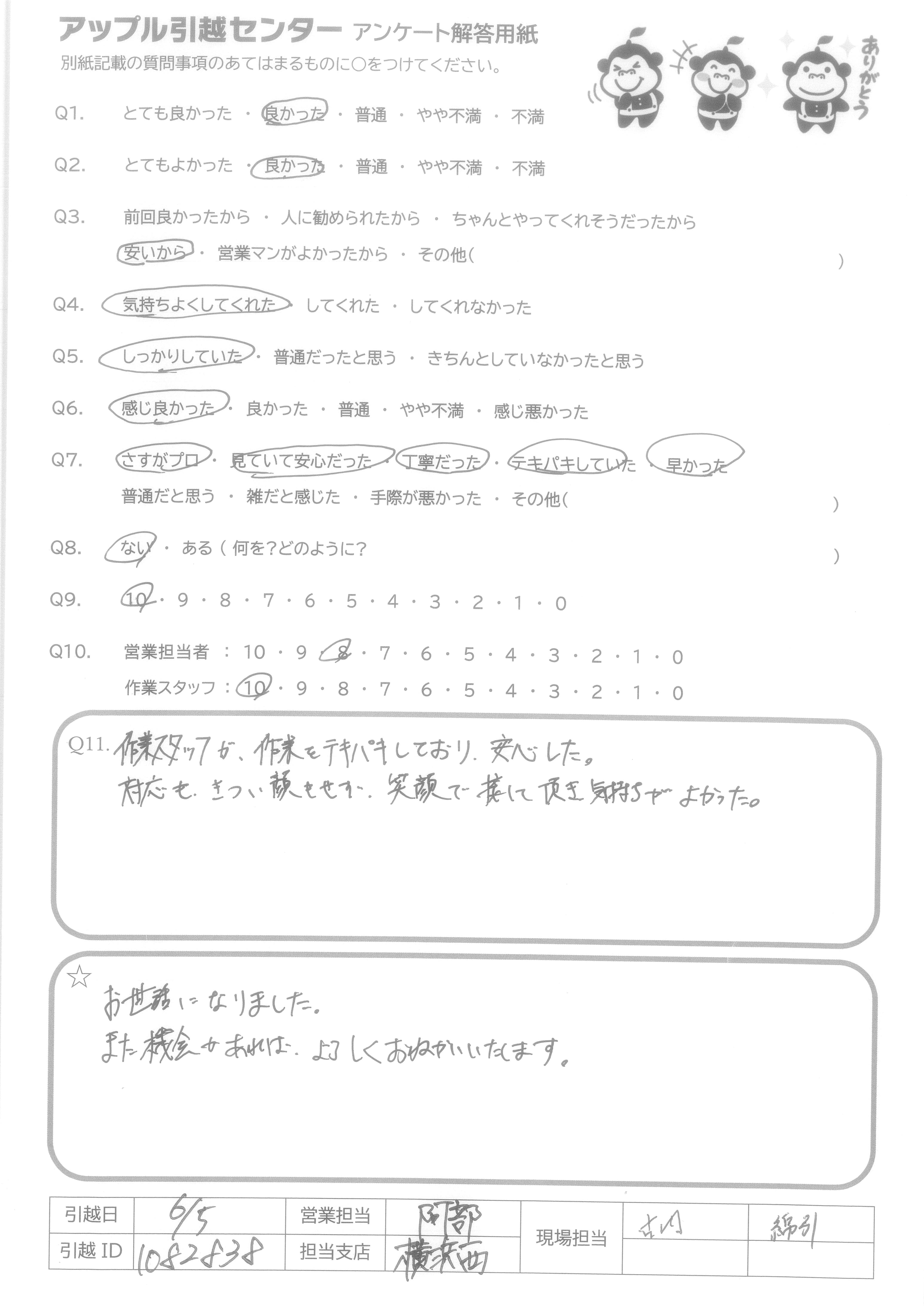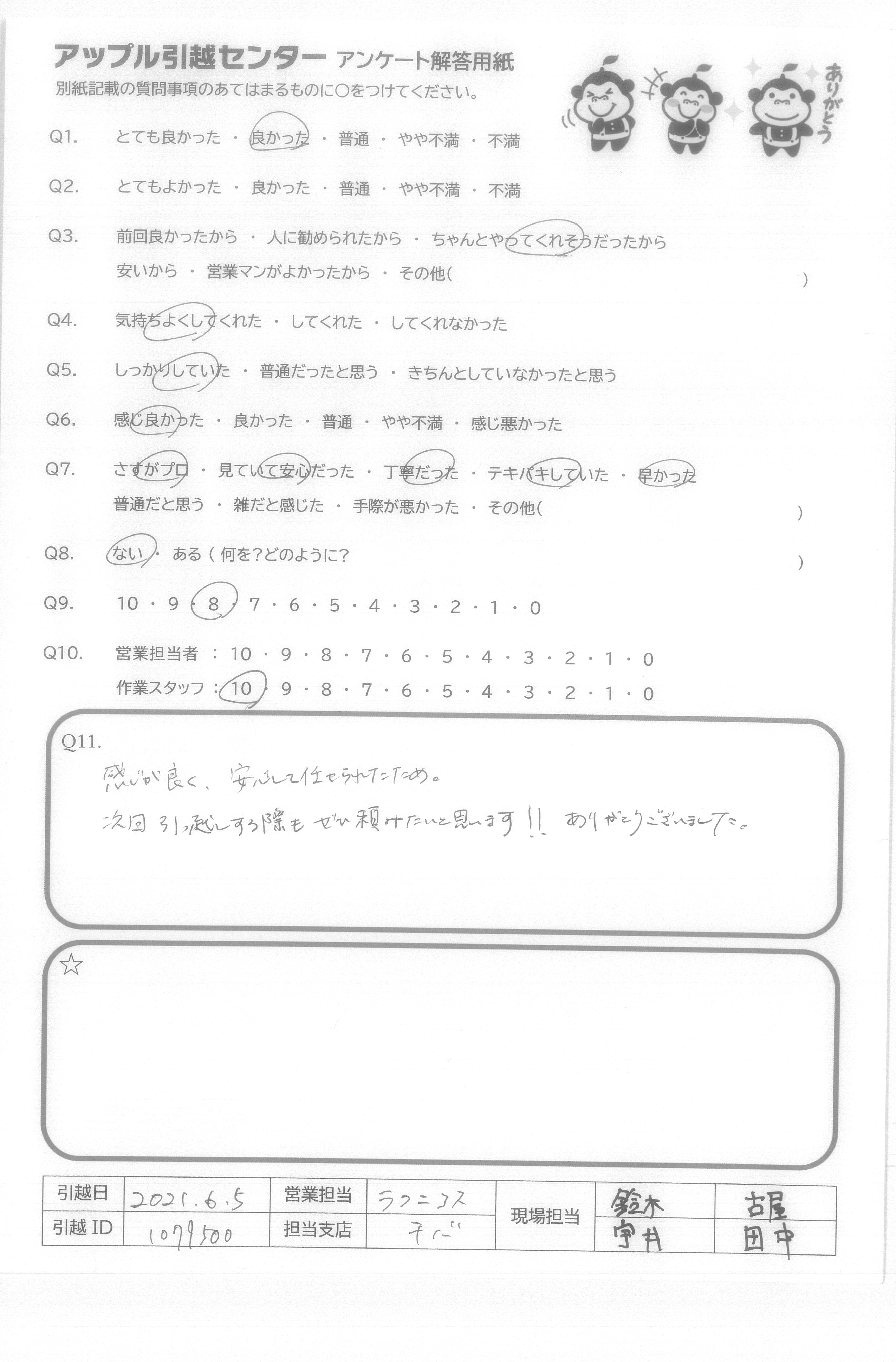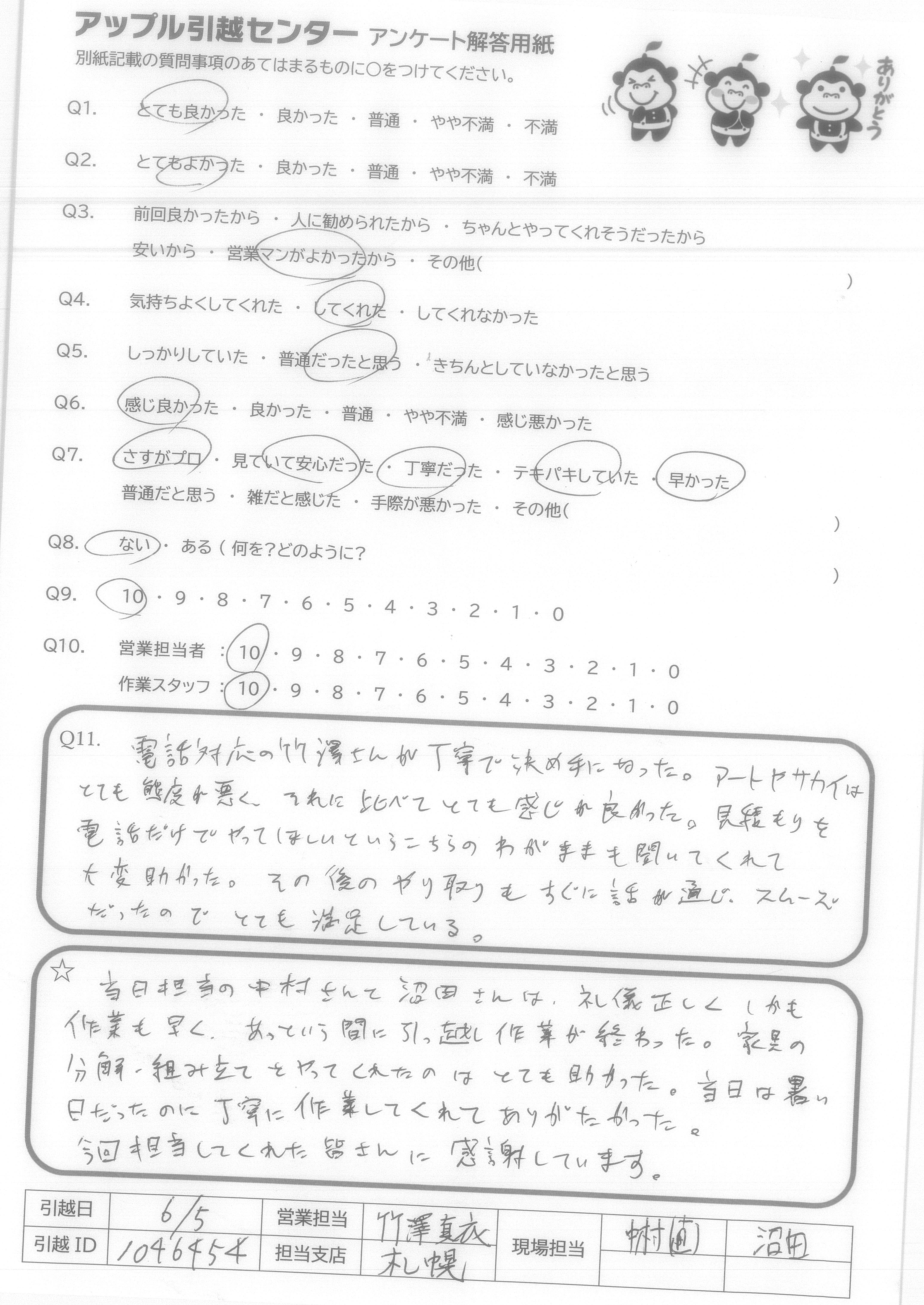 A.当日担当の中村さんと沼田さんは礼儀正しくしかも作業も早く、あっという間に引っ越し作業が終わった。家具の分解・組み立てをやってくれたのはとても助かった。当日は暑い日だったのに丁寧に作業してくれてありがたかった。 今回担当してくれた皆さんに感謝しています。
