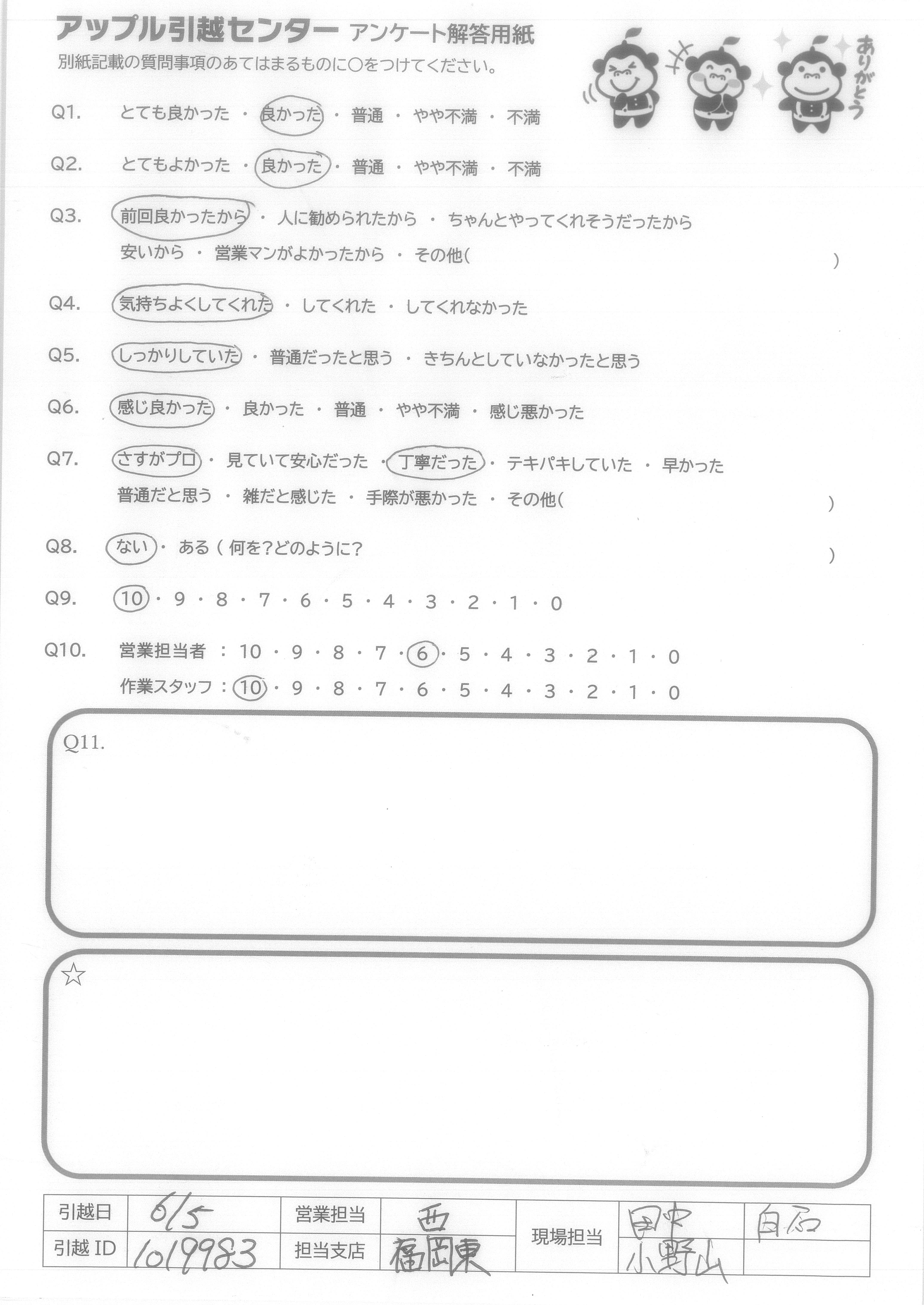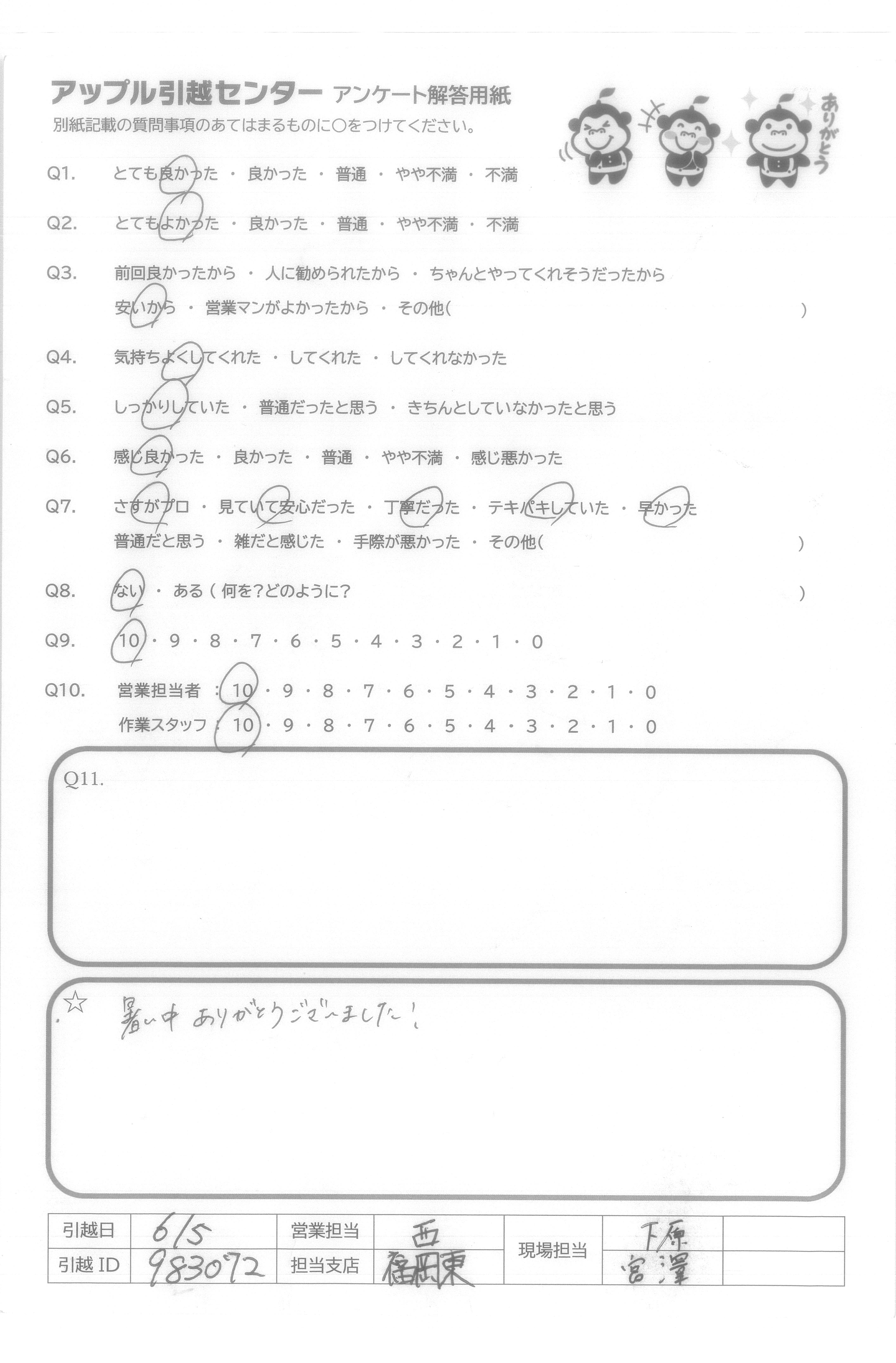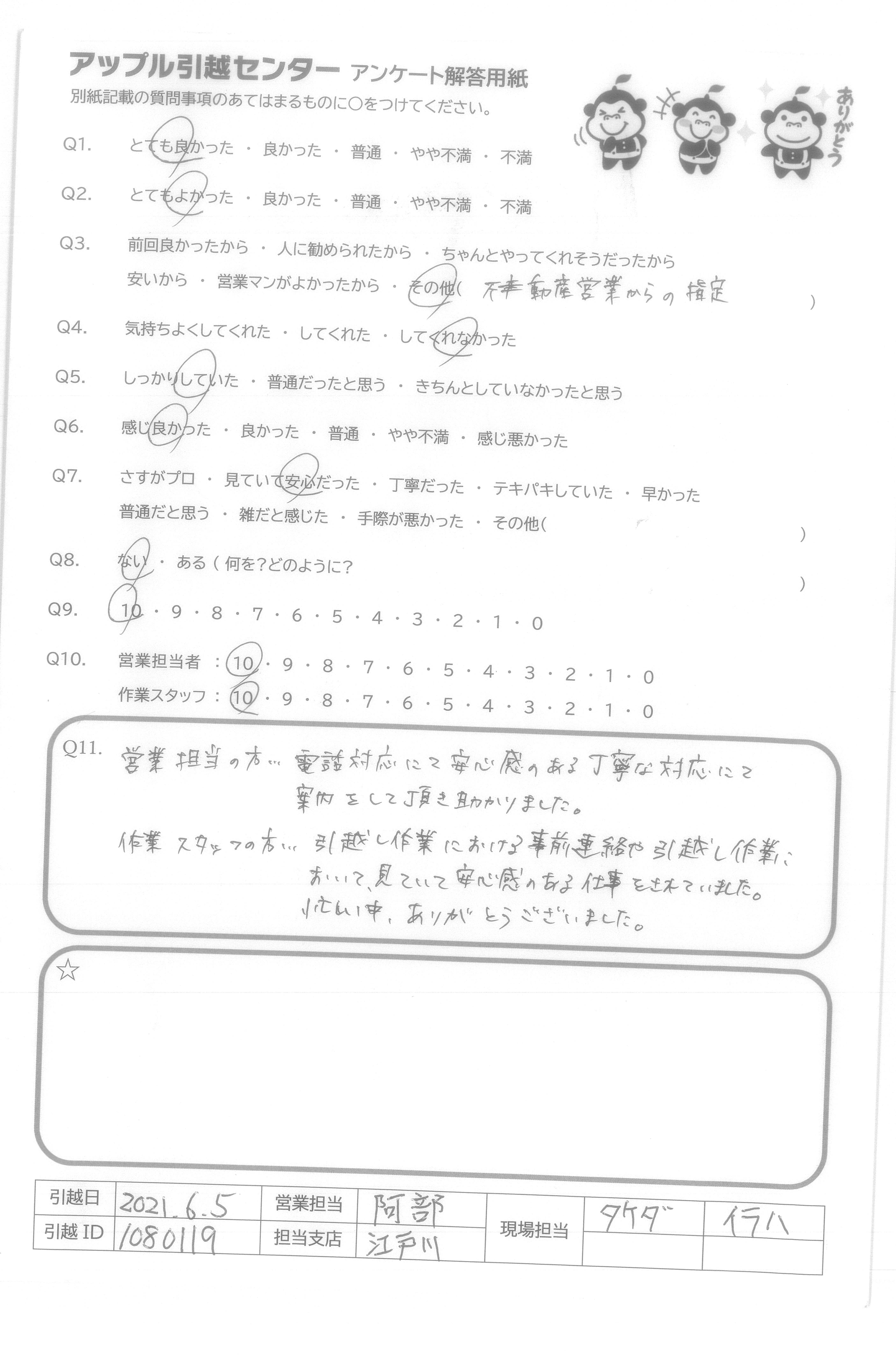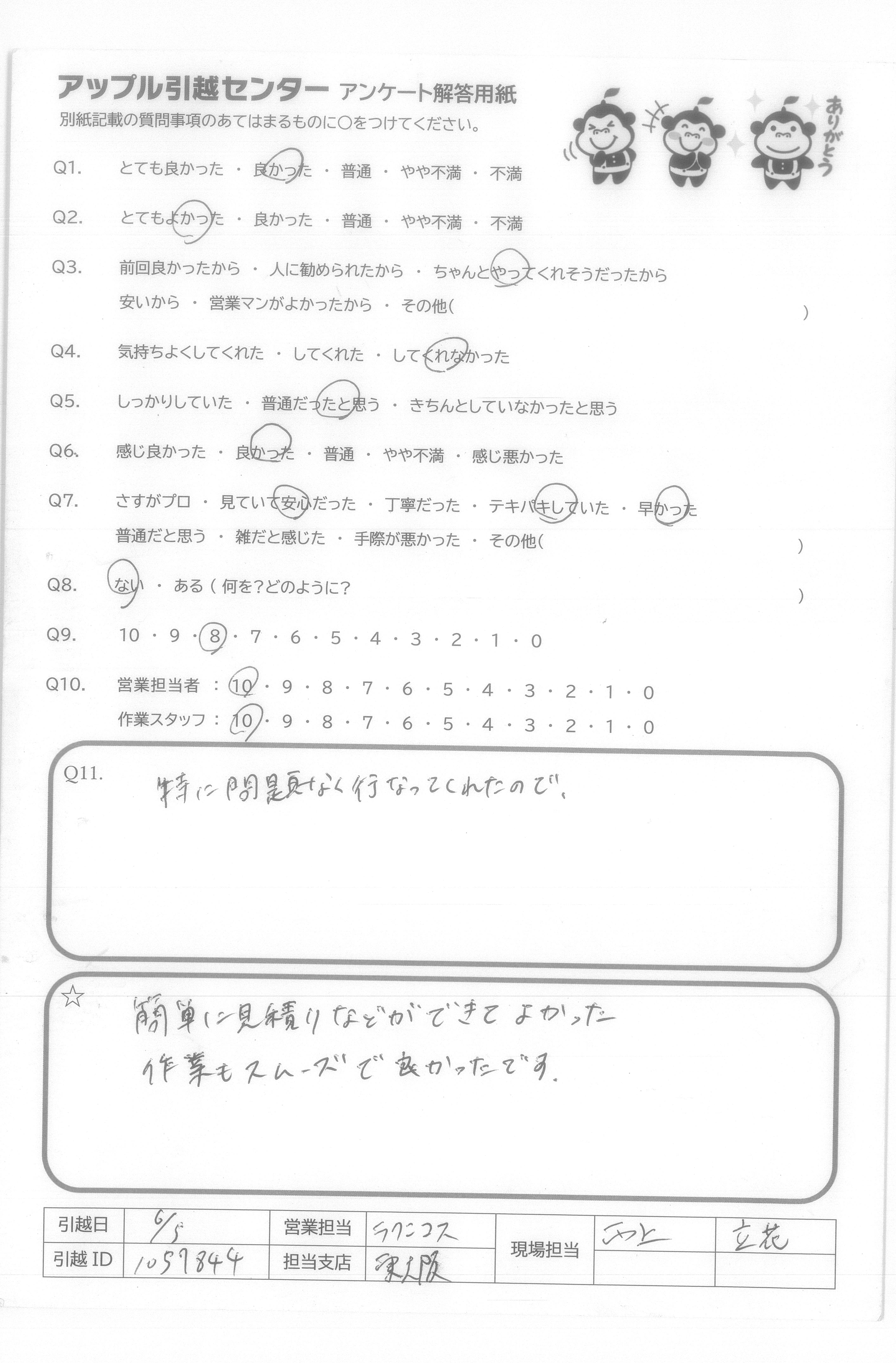 A.当日担当の中村さんと沼田さんは礼儀正しくしかも作業も早く、あっという間に引っ越し作業が終わった。家具の分解・組み立てをやってくれたのはとても助かった。当日は暑い日だったのに丁寧に作業してくれてありがたかった。 今回担当してくれた皆さんに感謝しています。