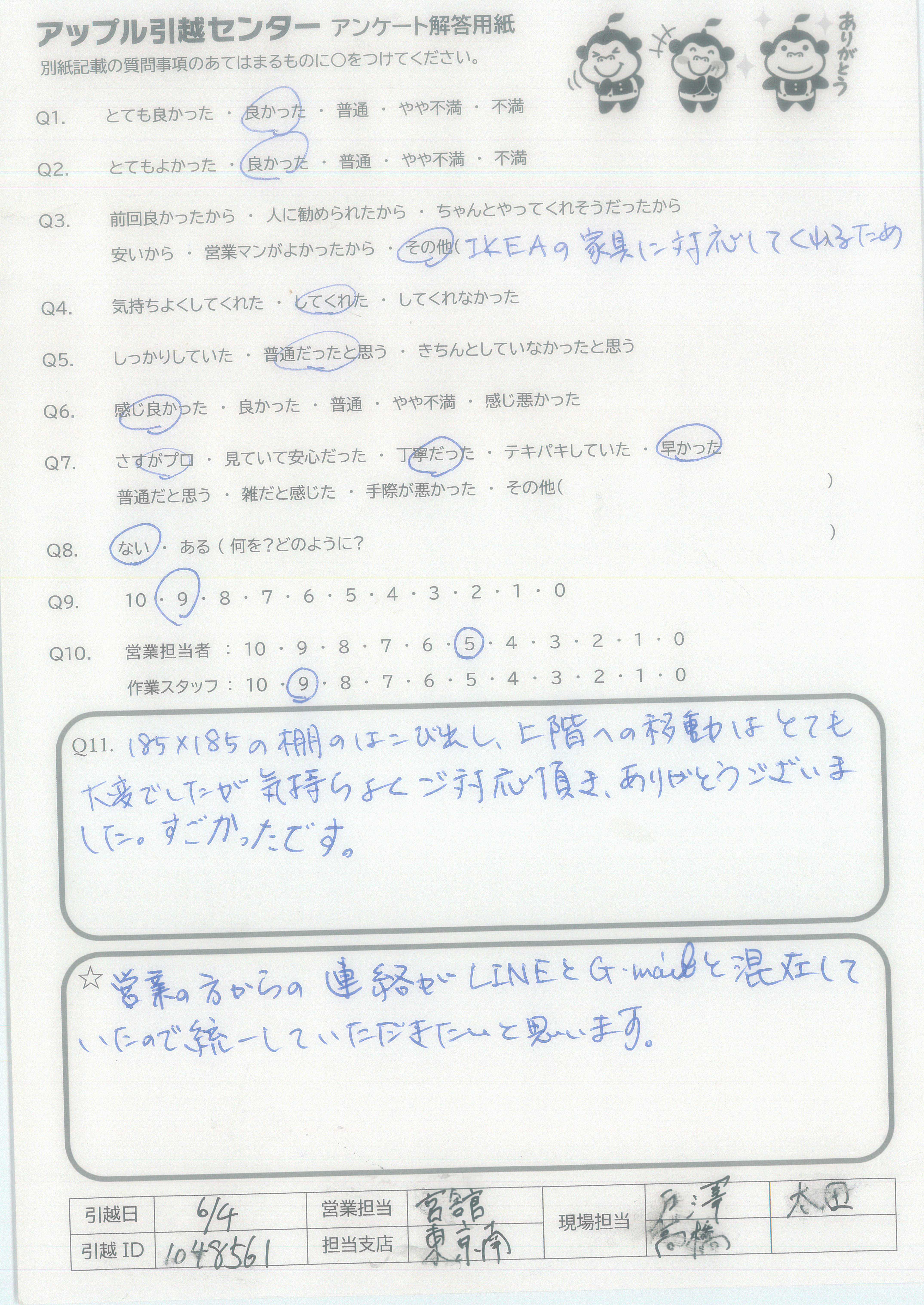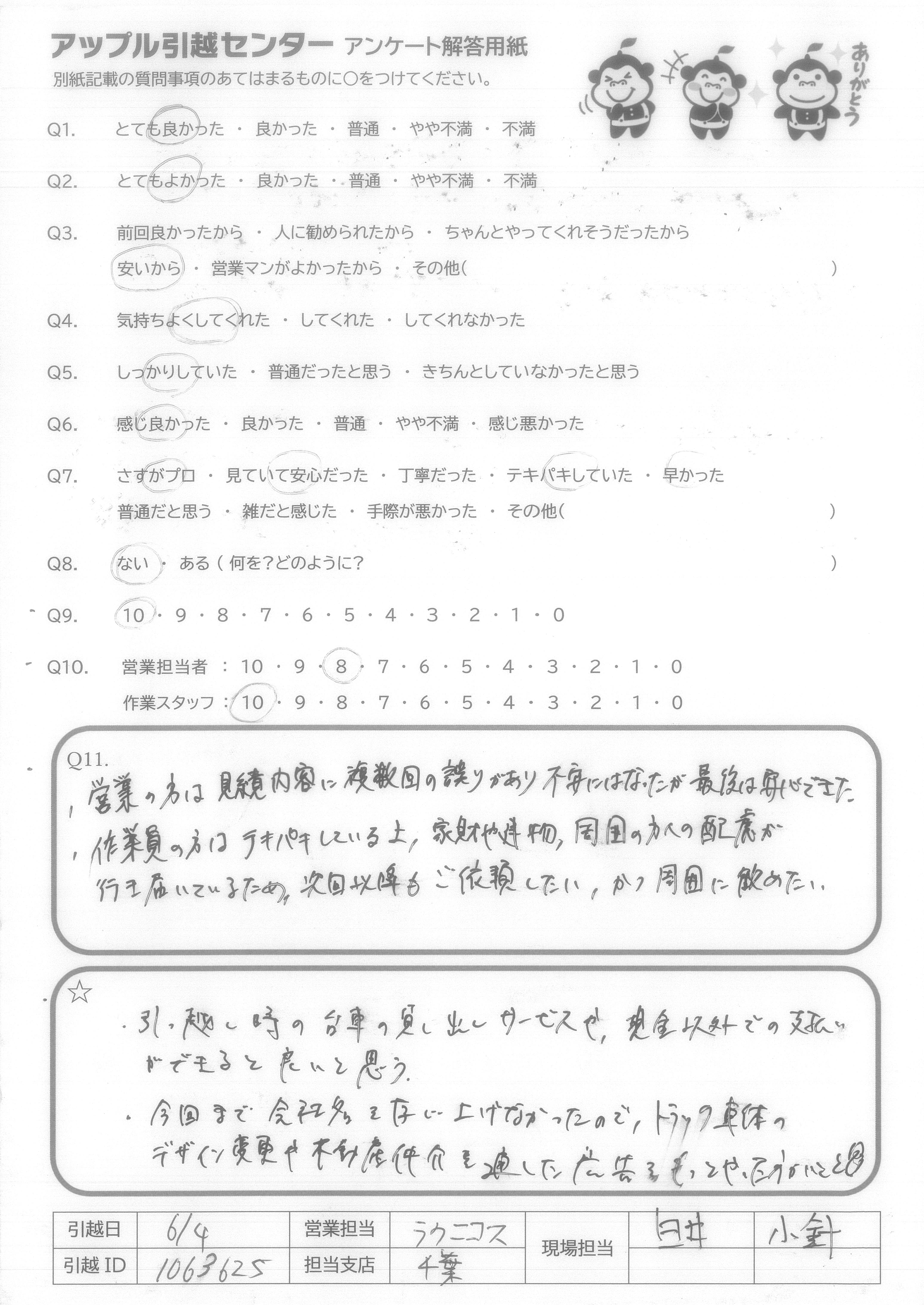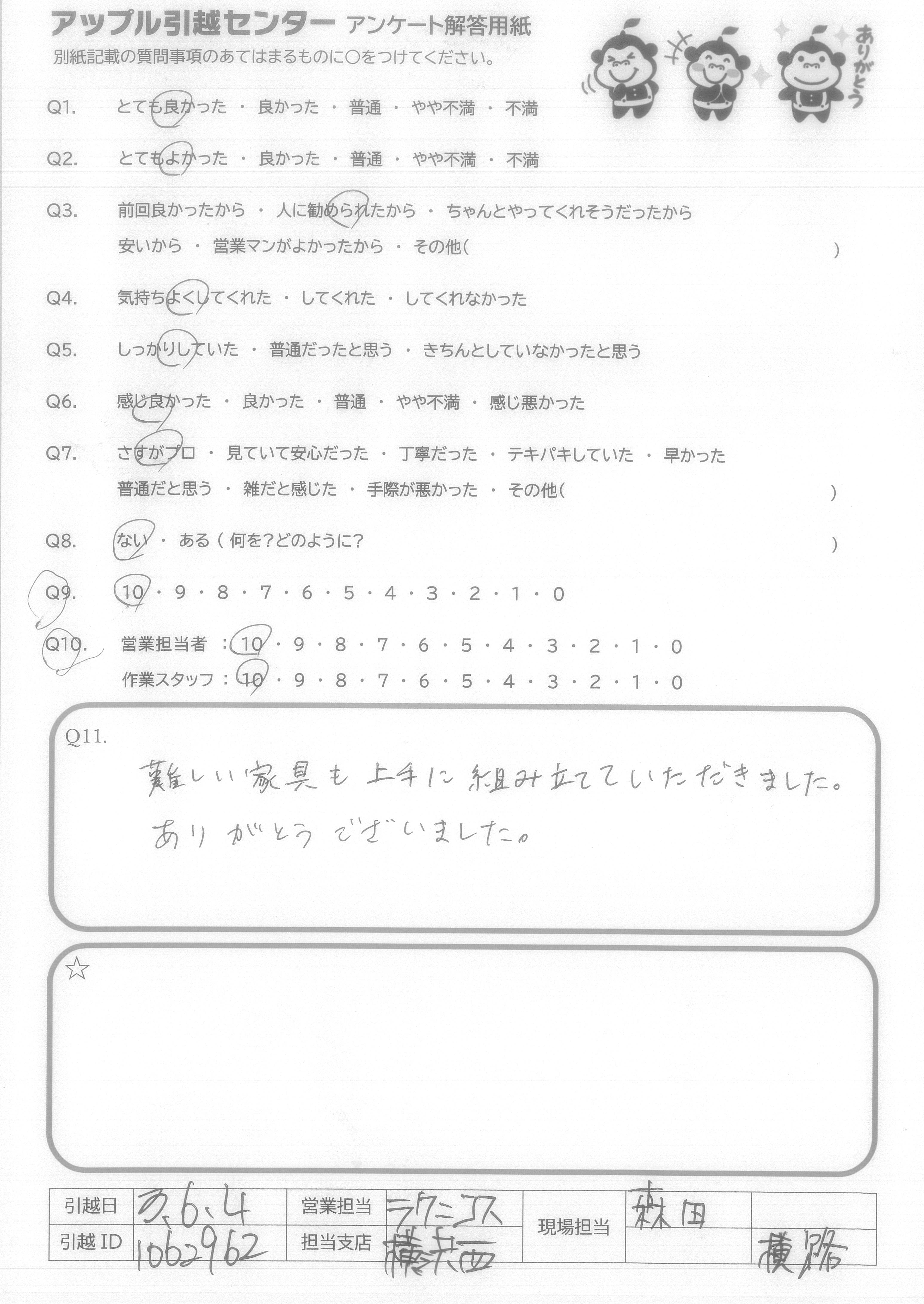 A.アップルさんはとても対応が良かったので、とてもお薦めです。ただ、どちらの引越業者さんにされるかの理由は人それぞれかと思いますのでQ9は”6”とさせて頂きました。 今回ご対応頂いた西村さんチームの皆様は、丁寧にスピーディに作業をこなしてくださり、また、丁寧にご説明もしてくださり、安心して引越しをすることができ、大変ありがたかったです。 それでQ10は”9”とさせて頂きました。