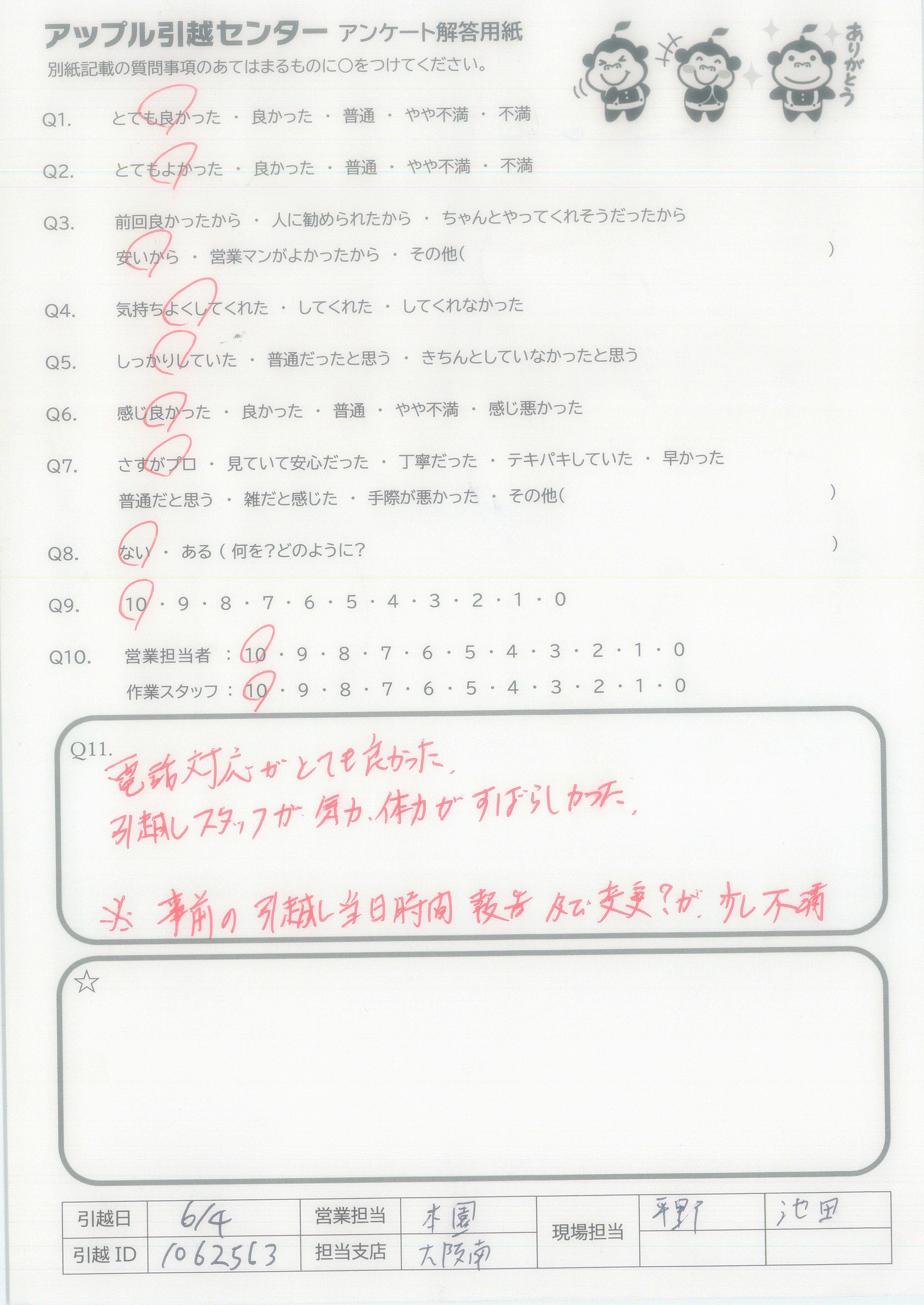 A.電話対応がとても良かった。 引越しスタッフが気力、体力がすばらしかった。 ※事前の引越し当日時間で変更?が少し不満