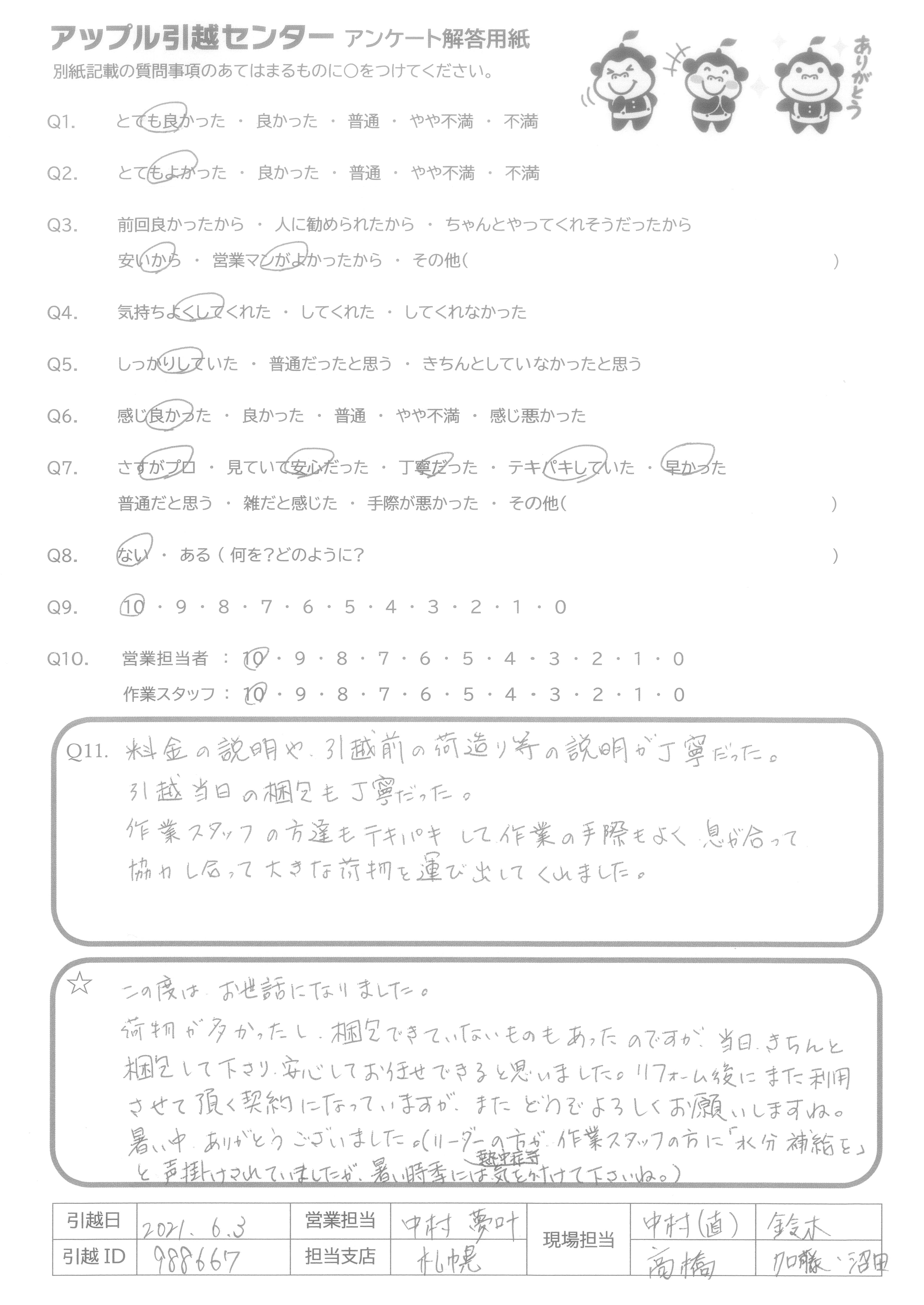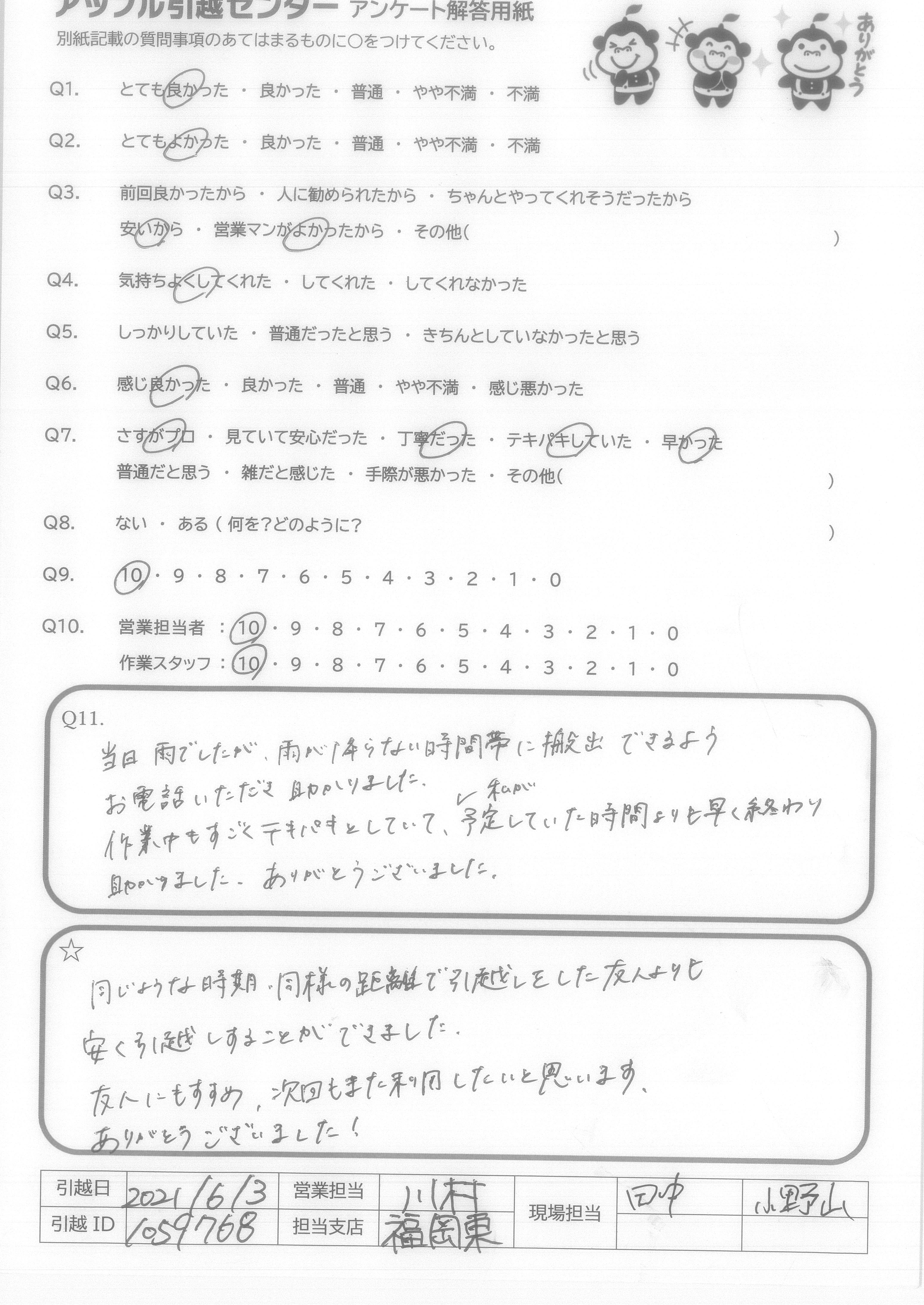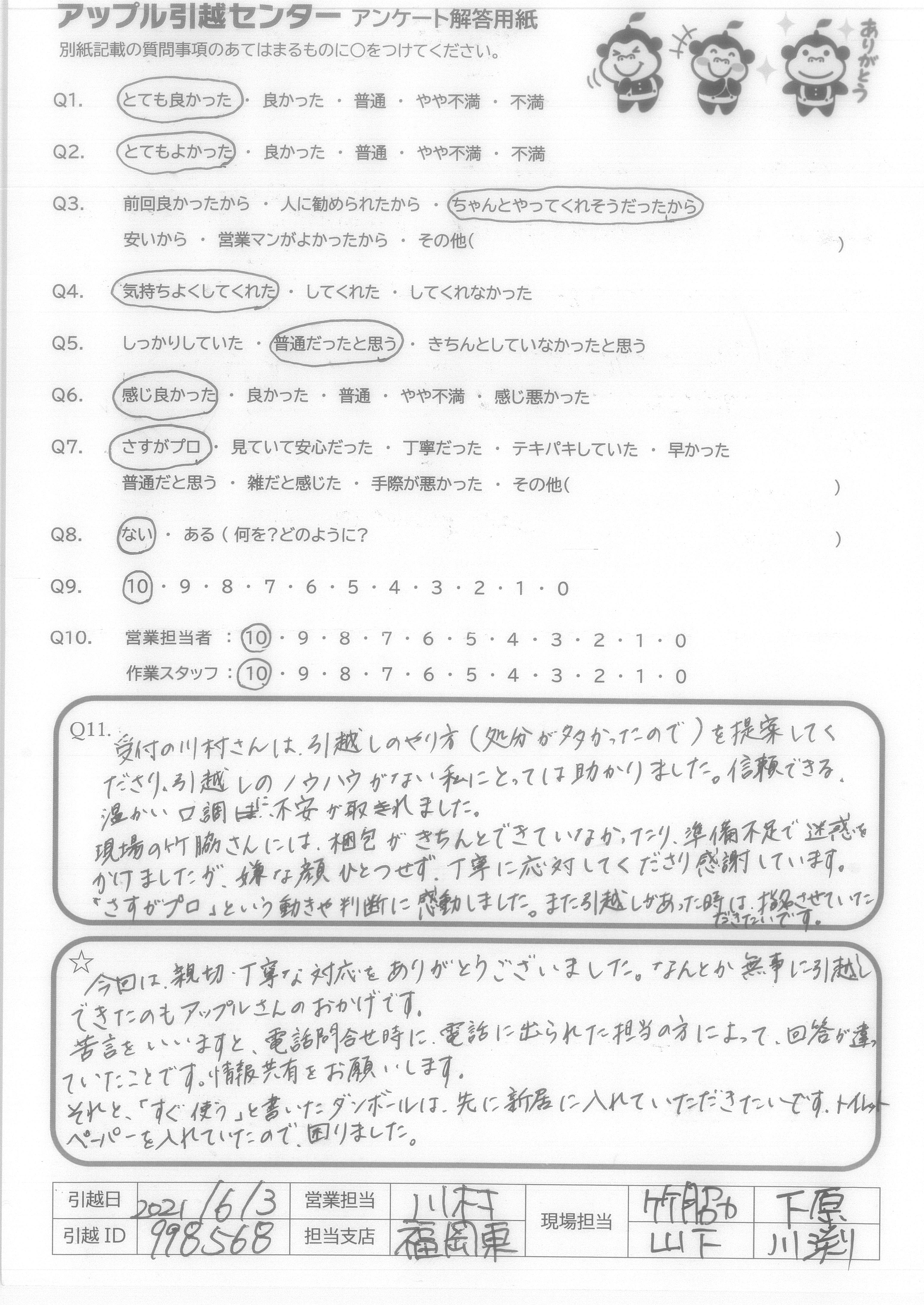 A.今回は親切・丁寧な対応をありがとうございました。なんとか無事に引越しできたのもアップルさんのおかげです。苦言をいいますと、電話問合せ時に、電話に出られた担当の方によって、回答が違っていたことです。情報共有をお願いします。 それと、「すぐ使う」と書いたダンボールは、先に新居に入れていただきたいです。トイレットペーパーを入れていたので、困りました。