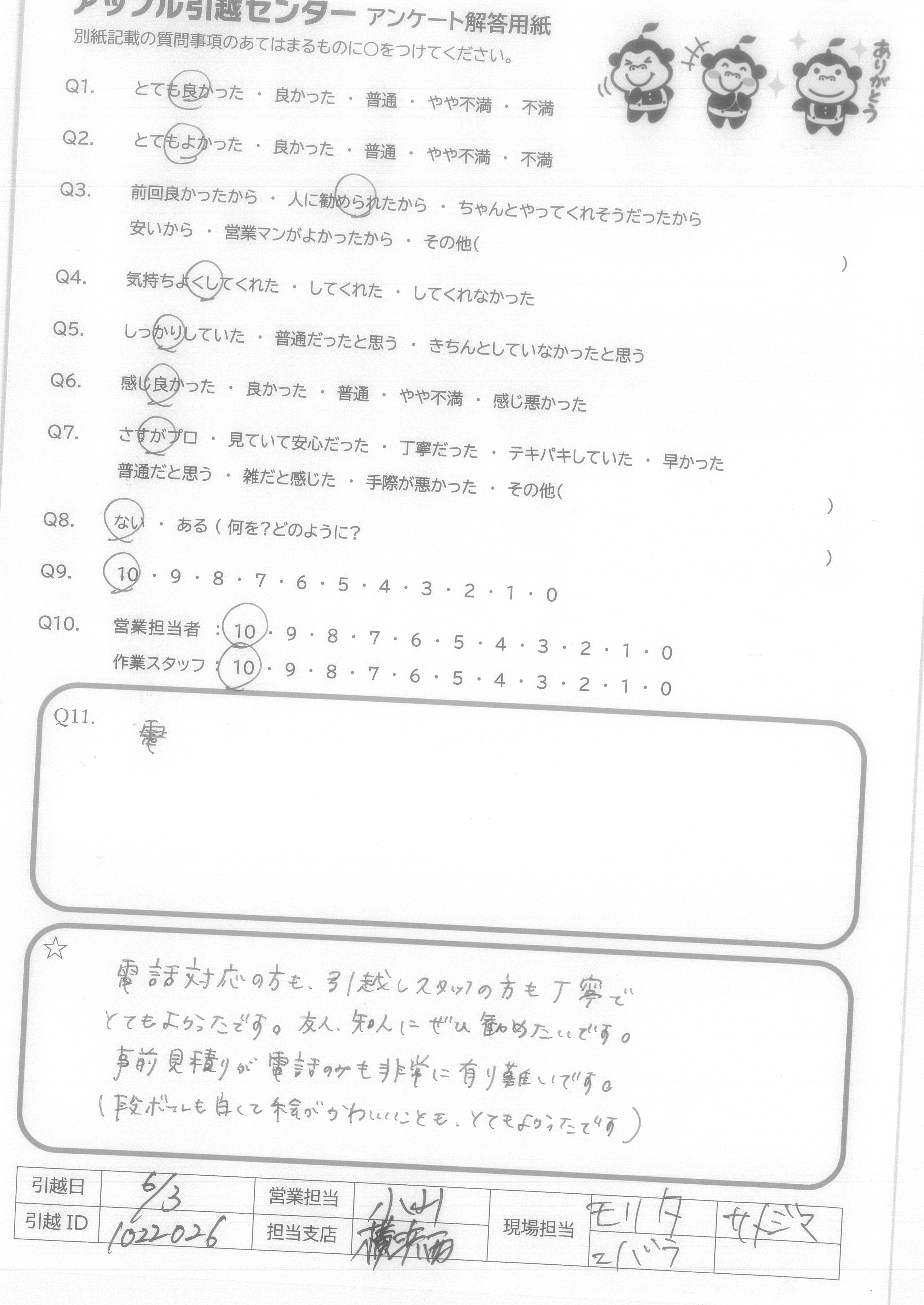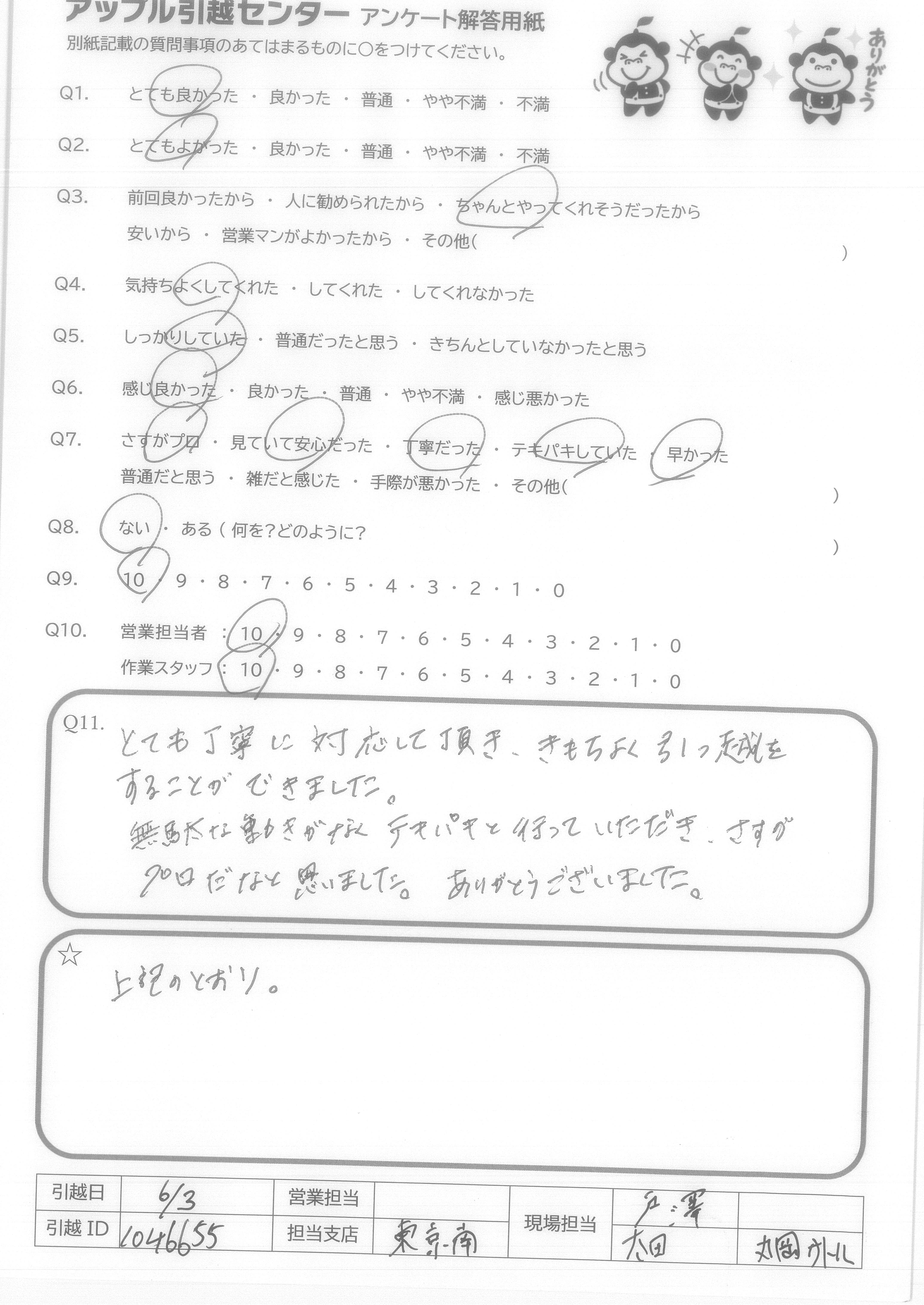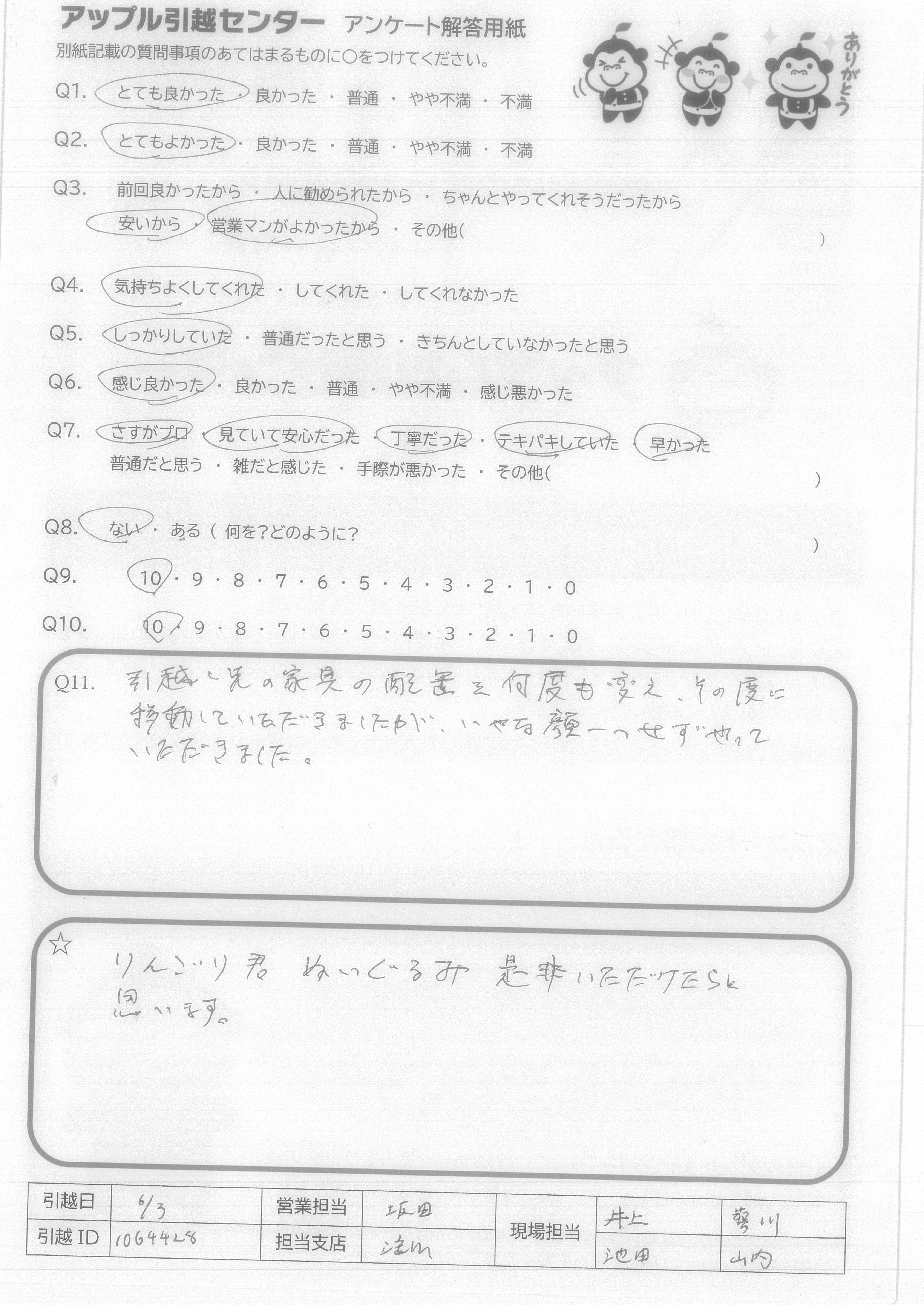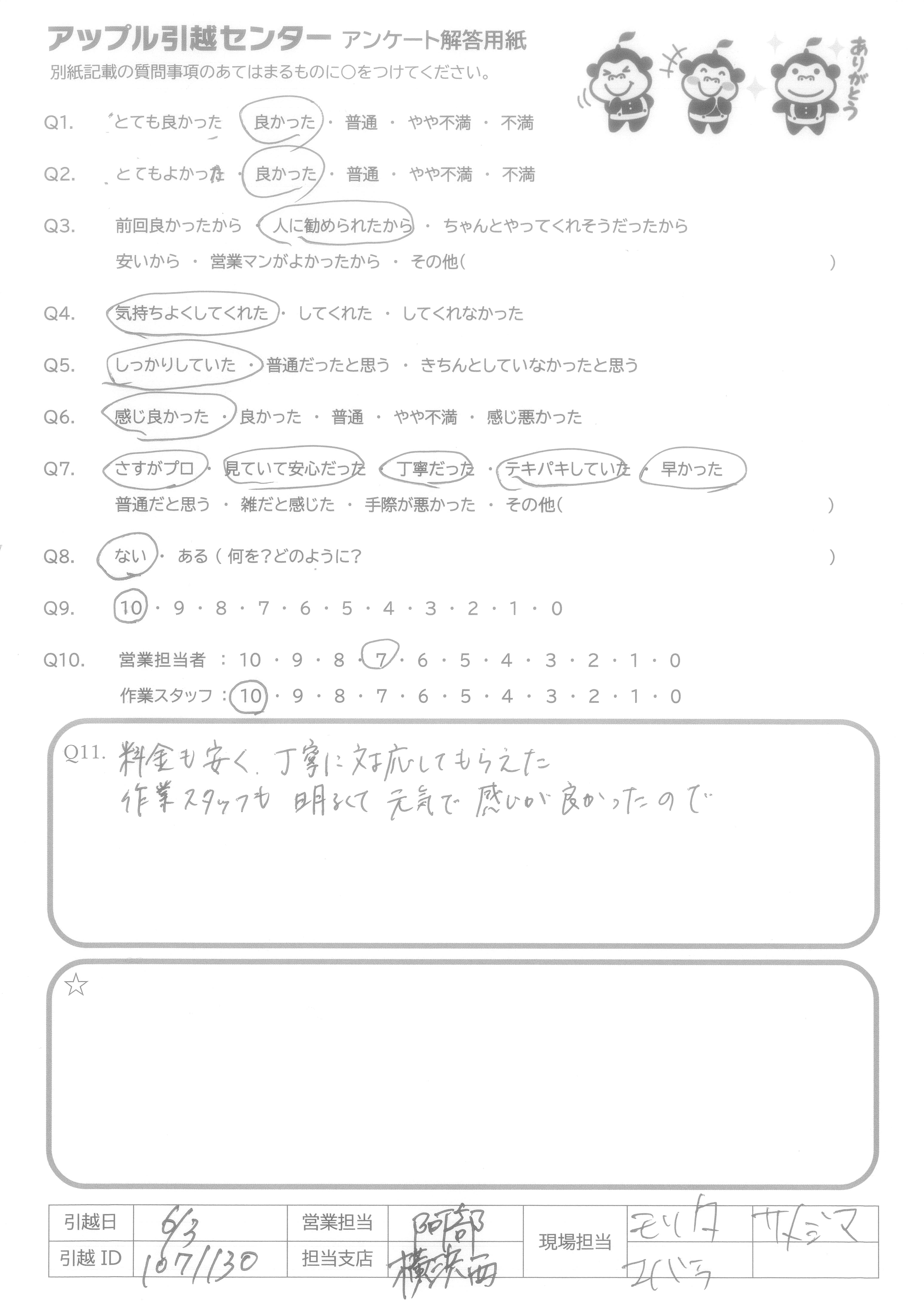 A.今回は親切・丁寧な対応をありがとうございました。なんとか無事に引越しできたのもアップルさんのおかげです。苦言をいいますと、電話問合せ時に、電話に出られた担当の方によって、回答が違っていたことです。情報共有をお願いします。 それと、「すぐ使う」と書いたダンボールは、先に新居に入れていただきたいです。トイレットペーパーを入れていたので、困りました。