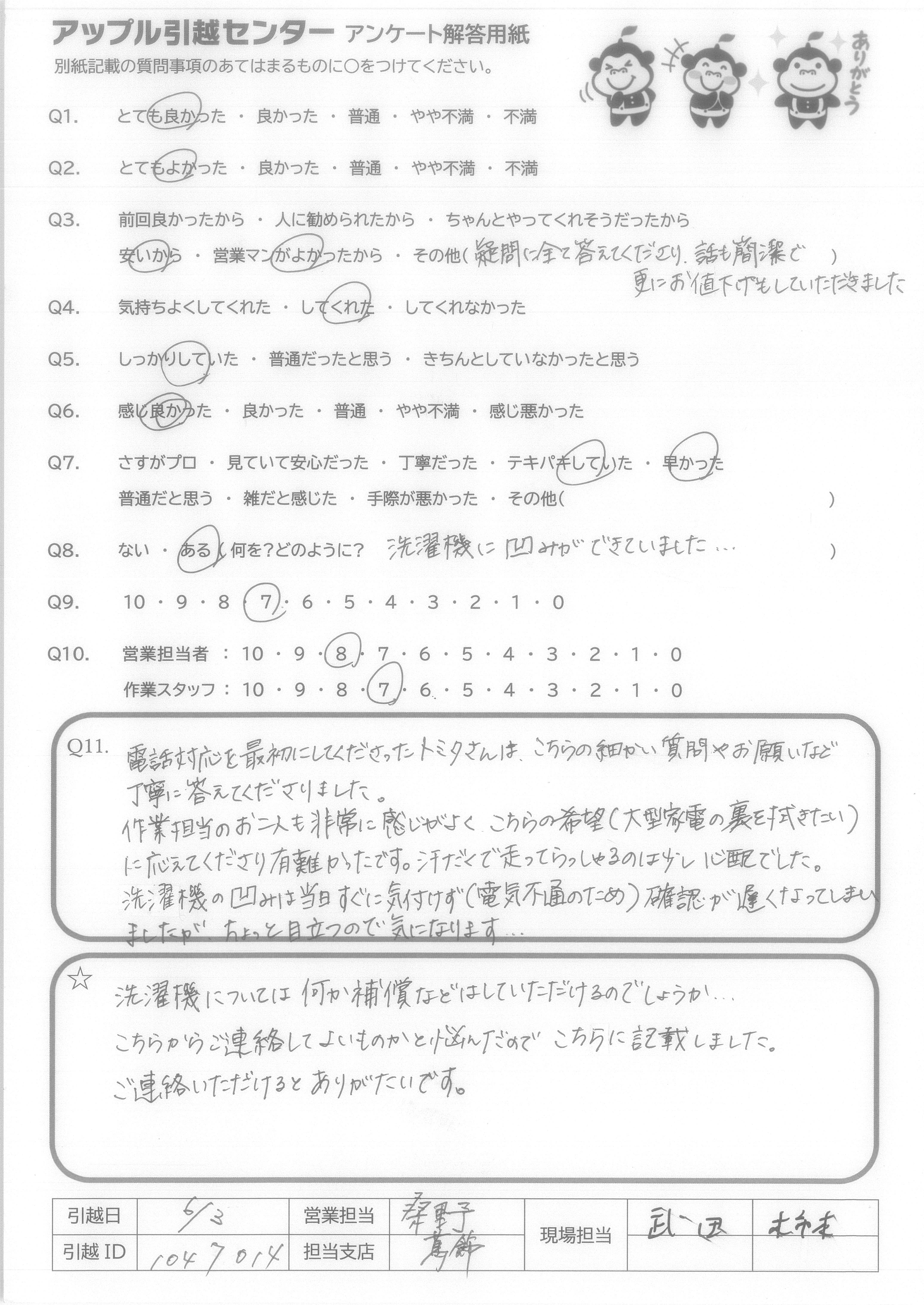 A.電話応対を最初にしてくださったトミタさんはこちらの細かい質問やお願いなど丁寧に答えてくださりました。 作業担当の御二人も非常に感じがよく、こちらの希望(大型家電の裏を拭きたい) に応えてくださり有難かったです。汗だくで走ってらっさゃるのは少し心配でした。 洗濯機の凹みは当日すぐに気づけず(電気普通のため)確認が遅くなってしまいましたがちょっと目立つのできになります…