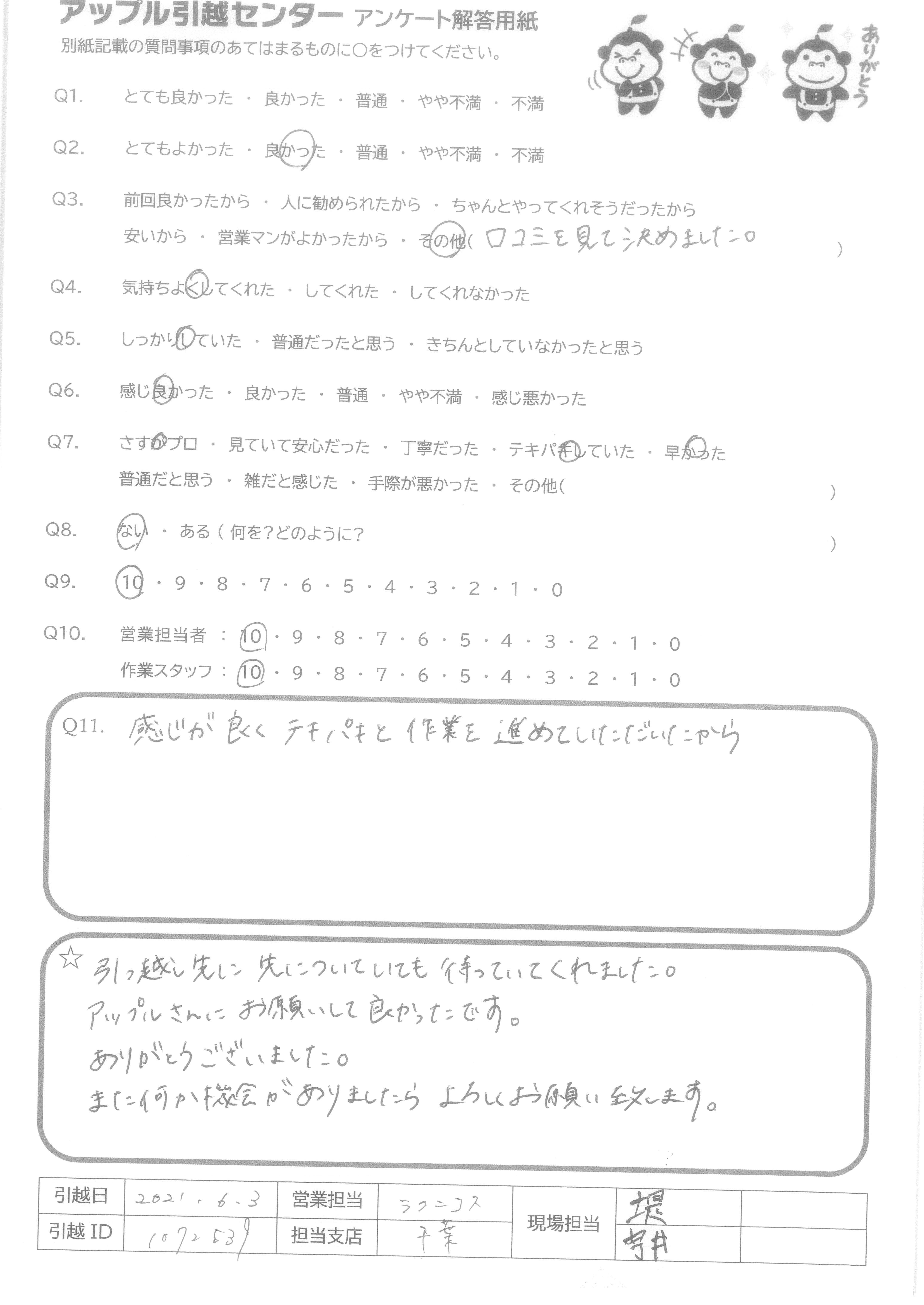 A.素早く引っ越し作業をして頂きありがとうございました。 電話対応も作業スタッフさんも感じが良かったです。