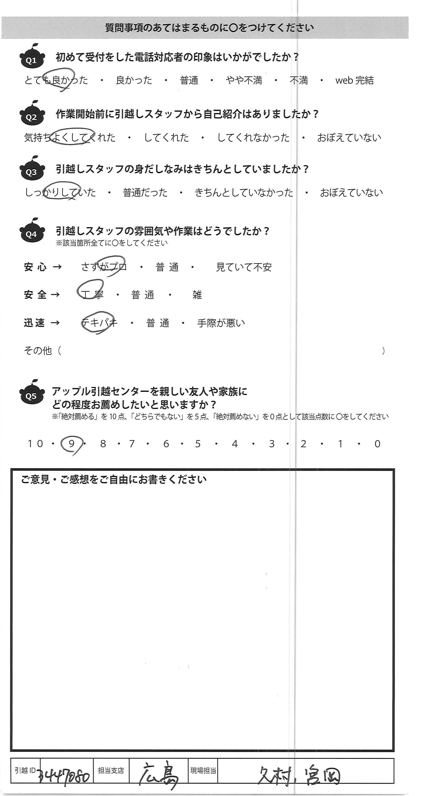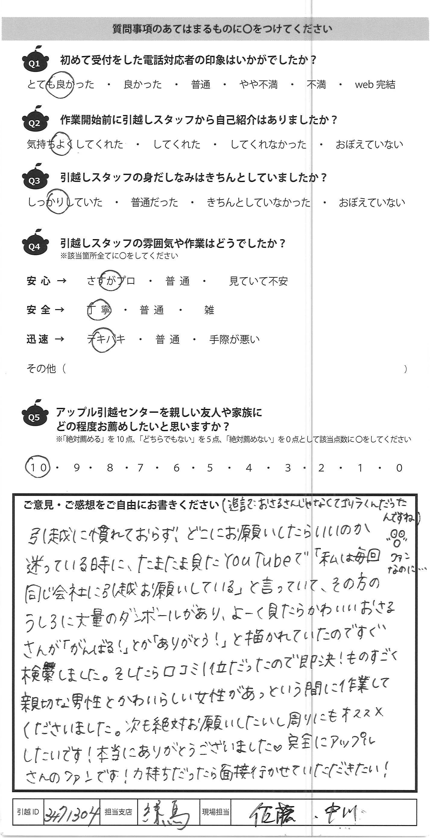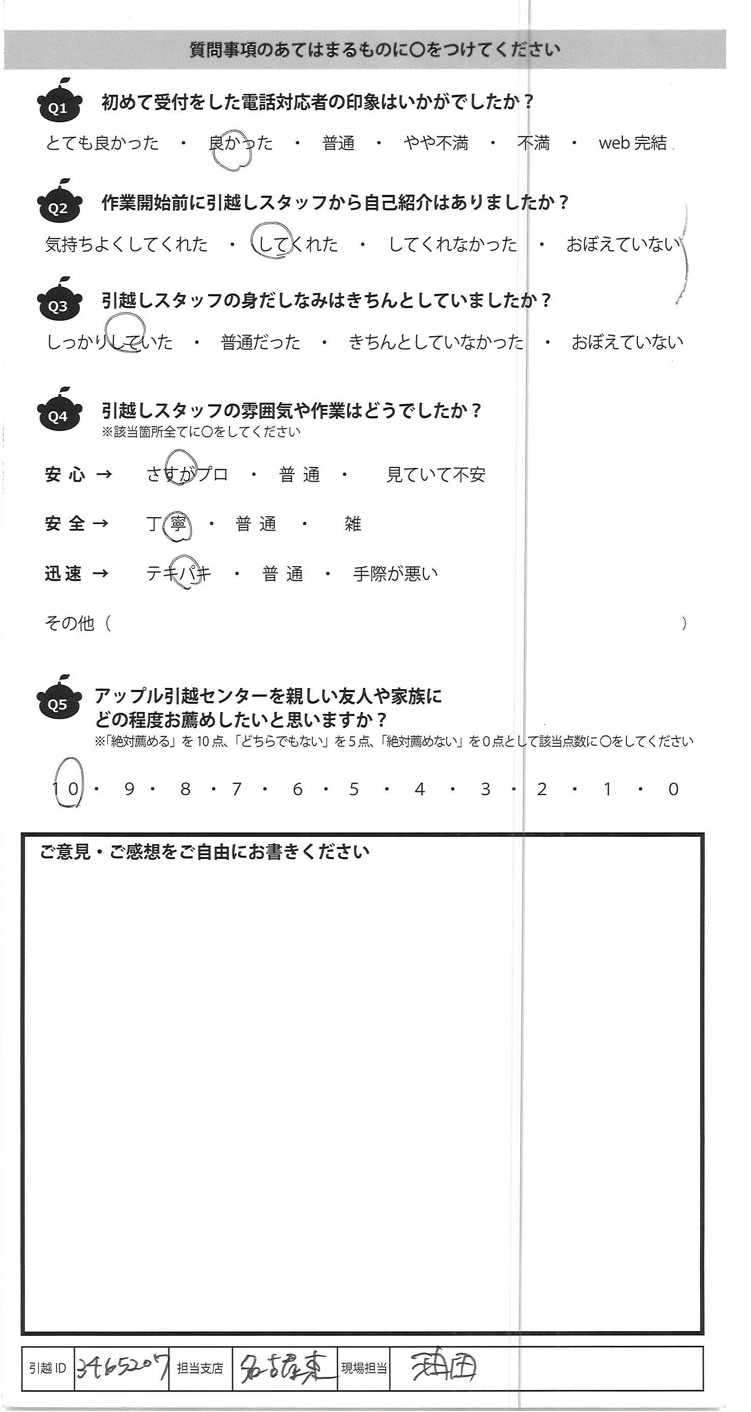 A.お二人とも、すごく感じがよく、優しくて、 仕事も丁寧で、てきぱきこなして いただき、3ヶ所の引っ越し移動 でしたが、気持ちよく引っ越しを終える 事ができ感謝しています。 ありがとうございました。 暑い中おつかれ様でした。