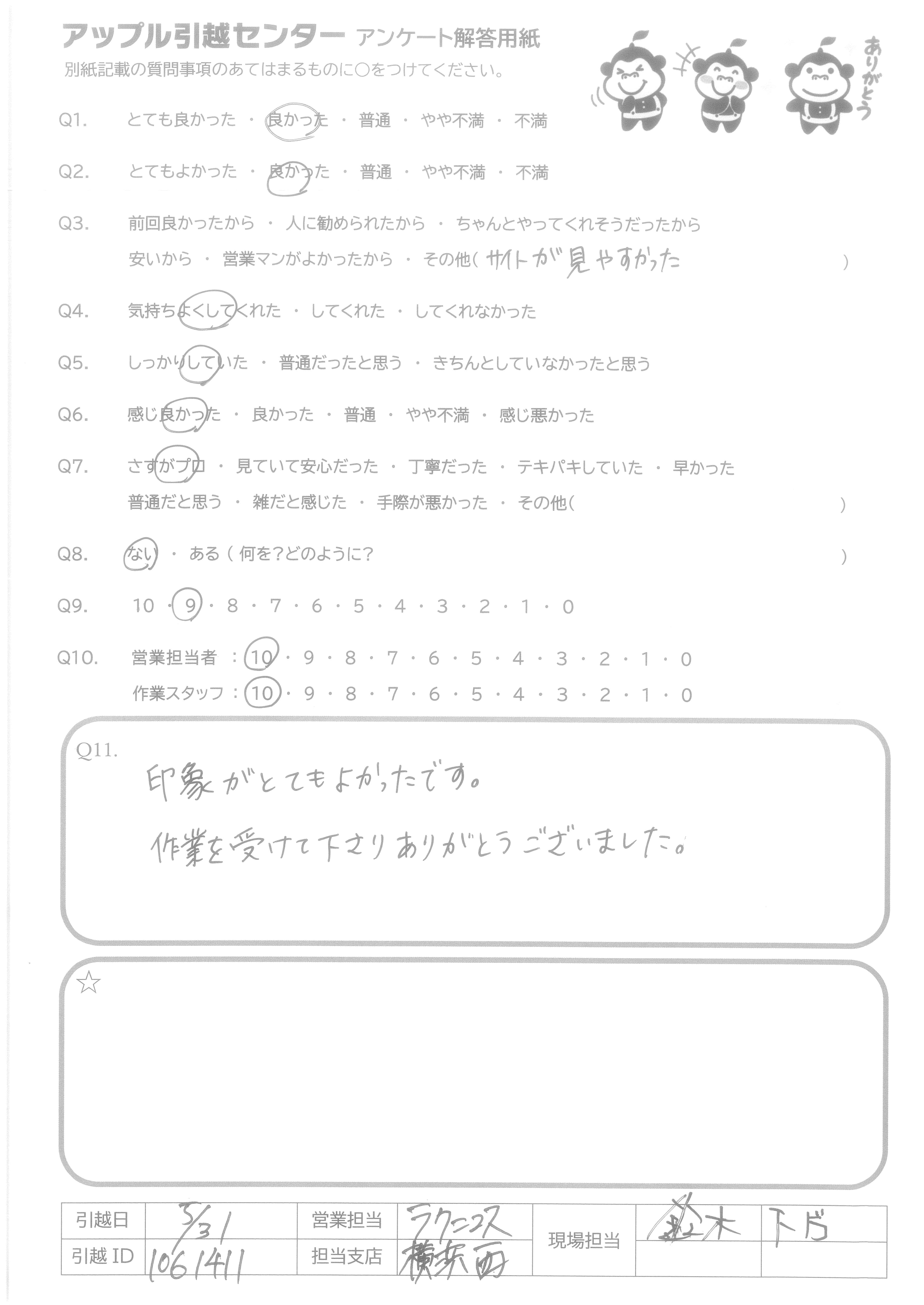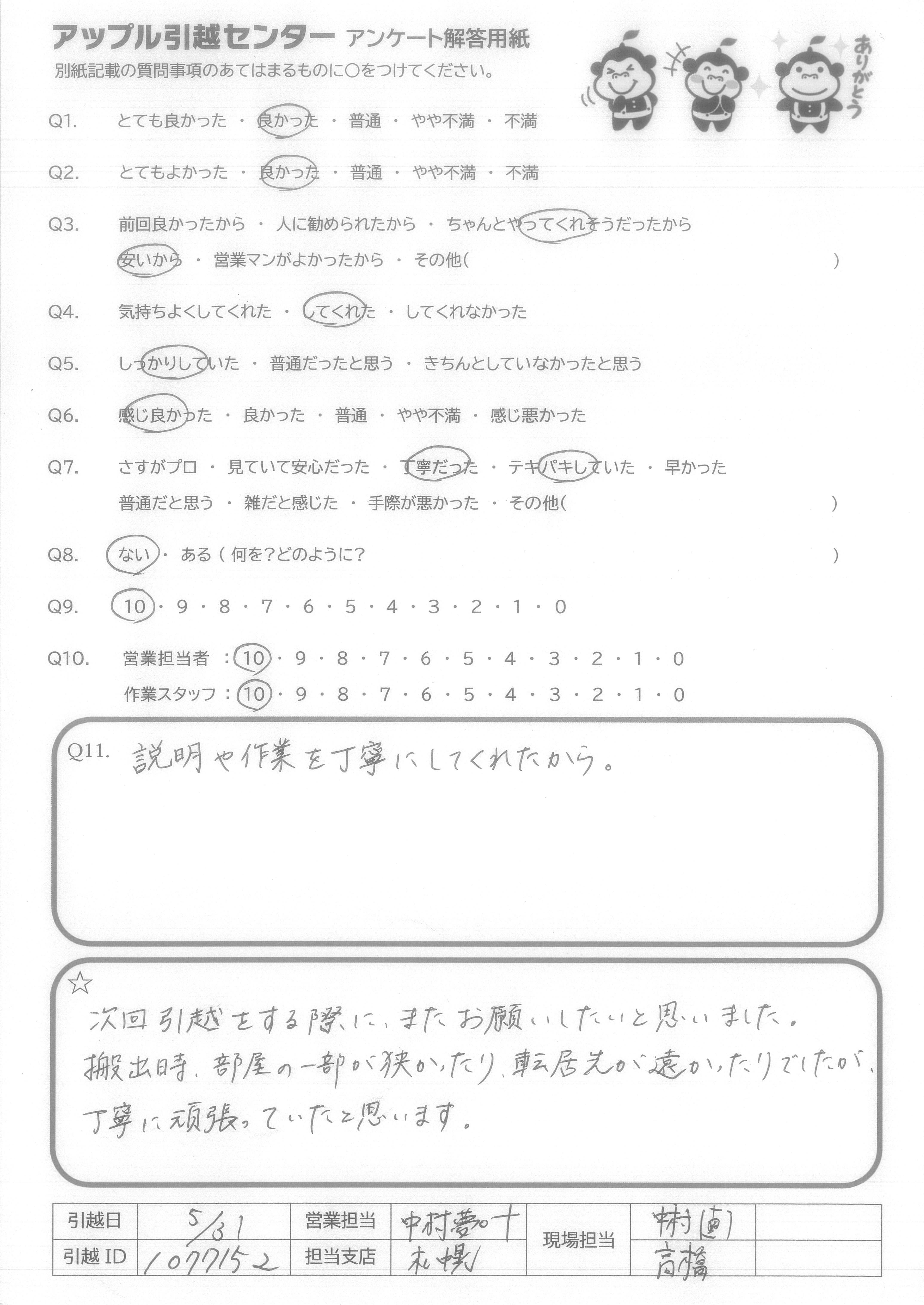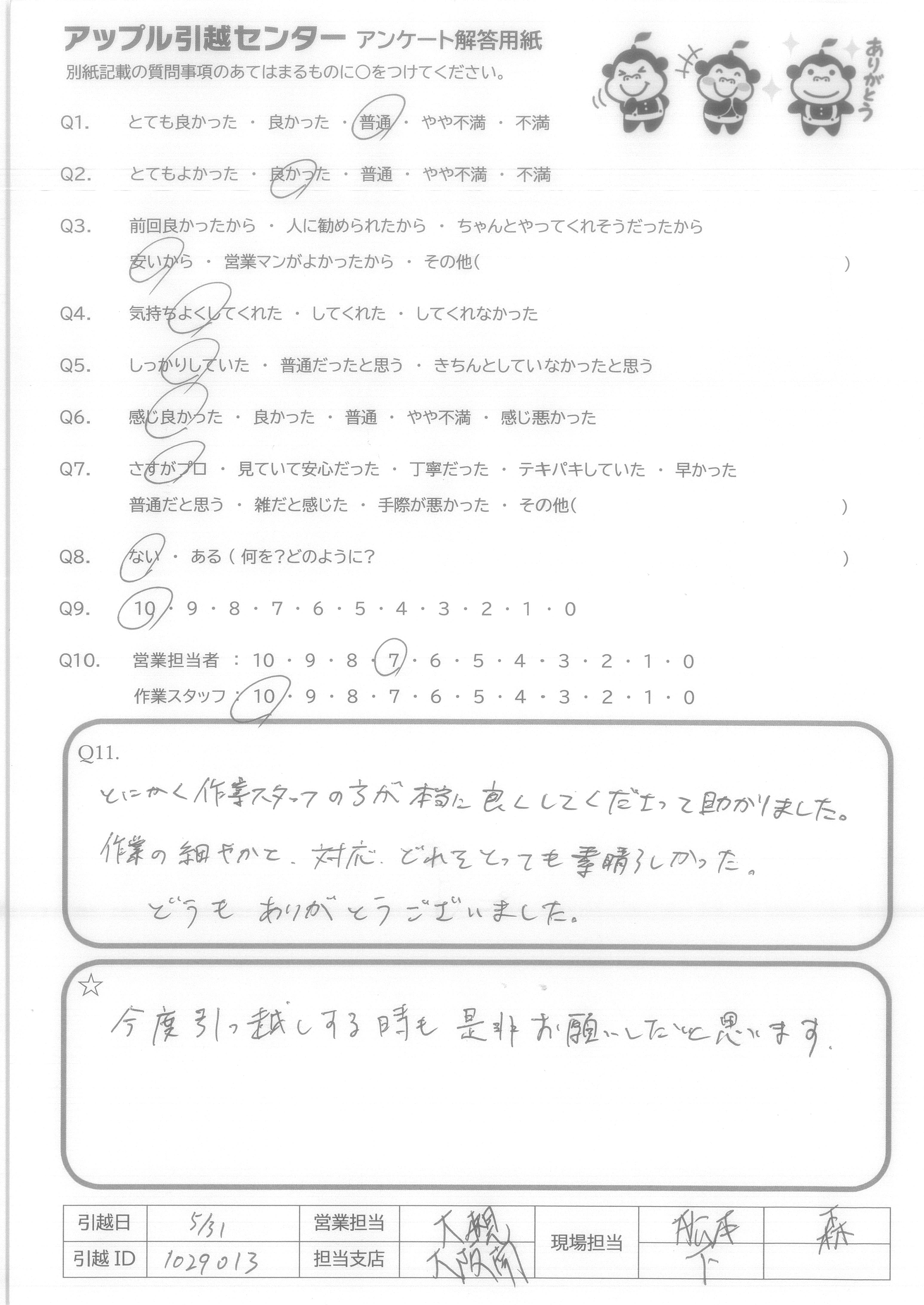 A.次回引越をする際に、またお願いしたいと思いました。 搬出時、部屋の一部が狭かったり、転居先が遠かったりでしたが、丁寧に頑張っていたと思います。