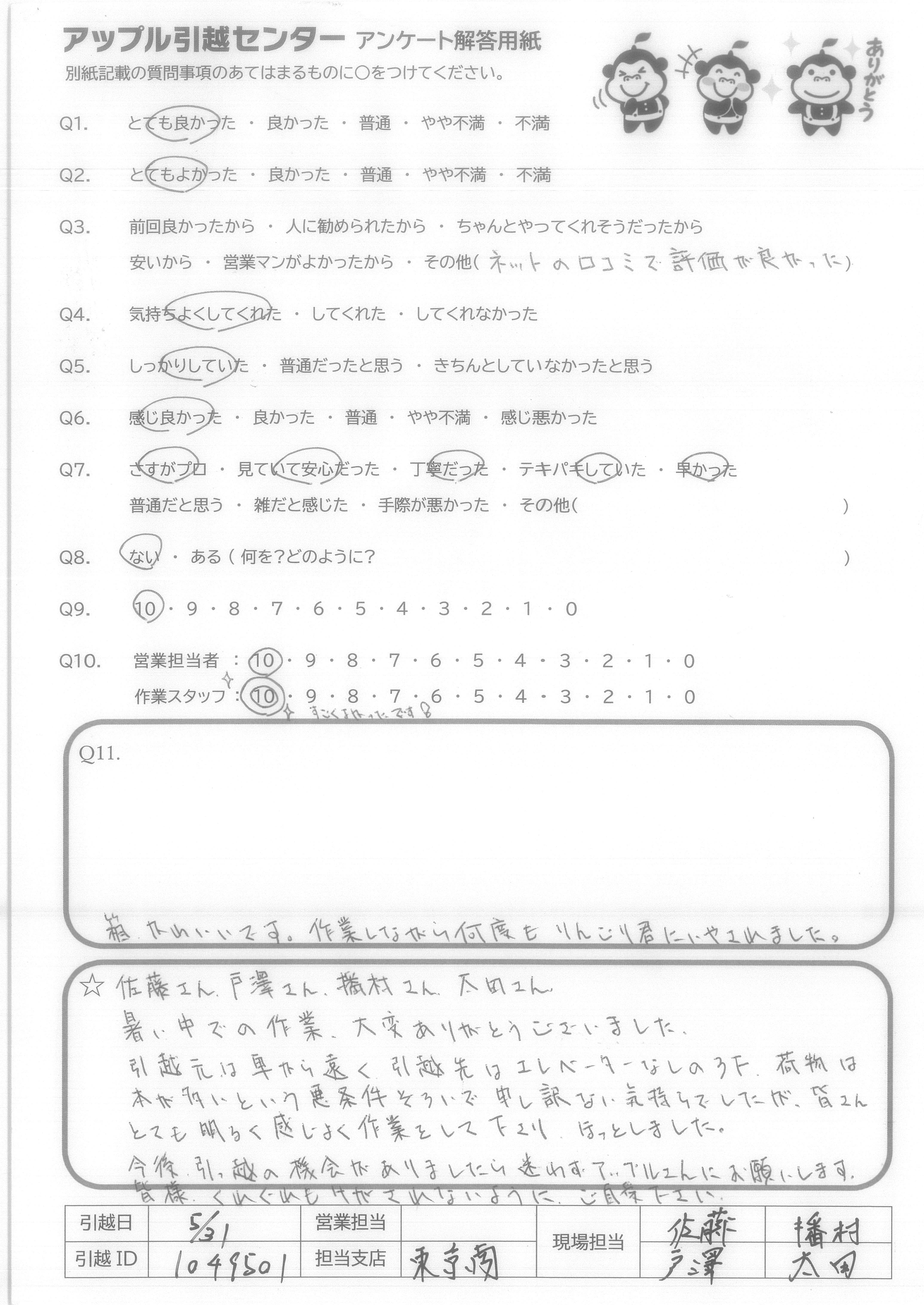 A.佐藤さん、戸澤さん、播村さん、太田さん 暑い中での作業、大変ありがとうございました。 引越元は車から遠く引越先はエレベーターなしの3F,荷物は本が多いという悪条件そろいで申し訳ない気持ちでしたが、皆さんとても明るく感じよく作業をして下さり、ほっとしました。 今後、引っ越の機会がありましたら迷わずアップルさんにお願いします。 皆様、くれぐれもけがされないように、ご自愛ください。