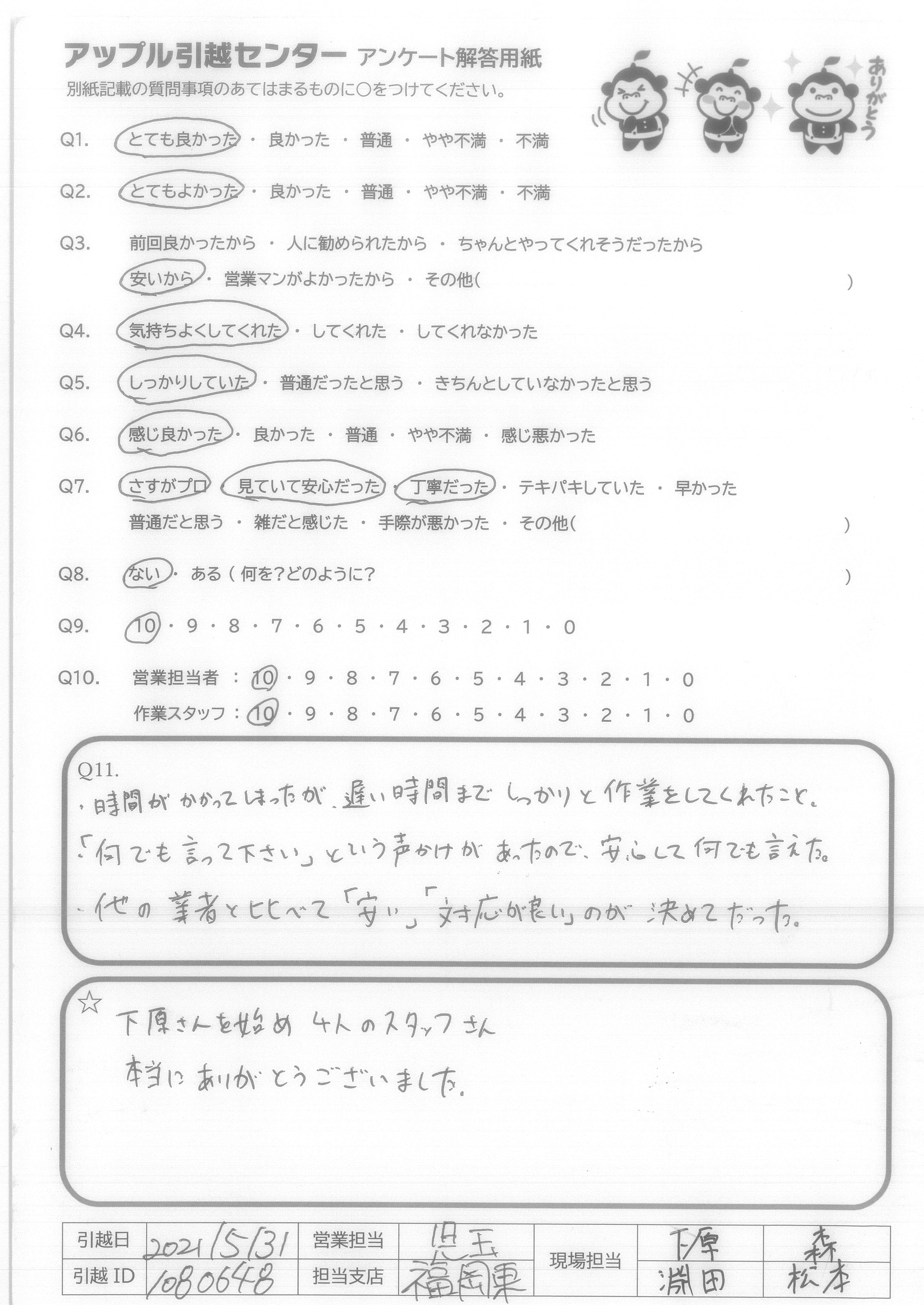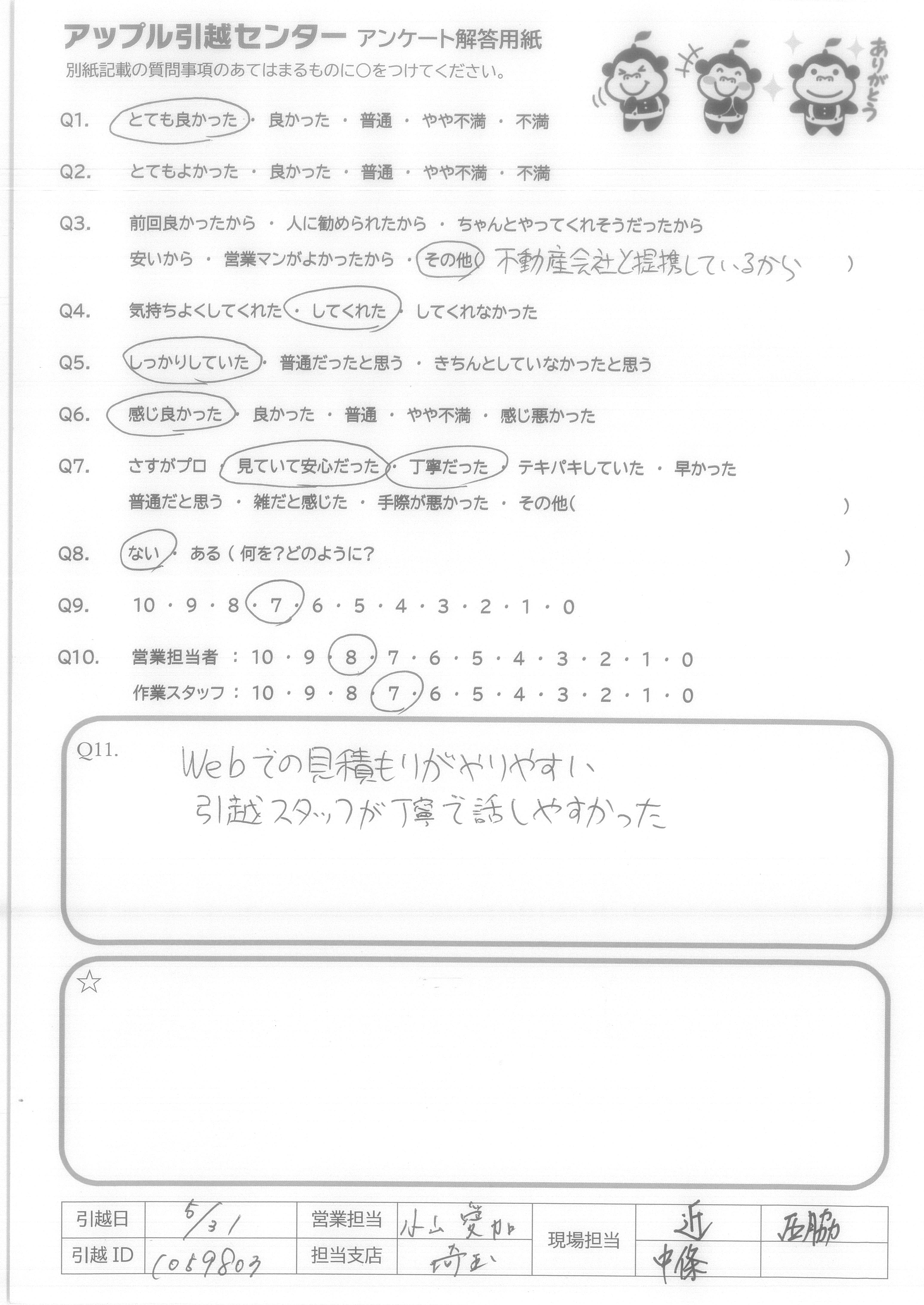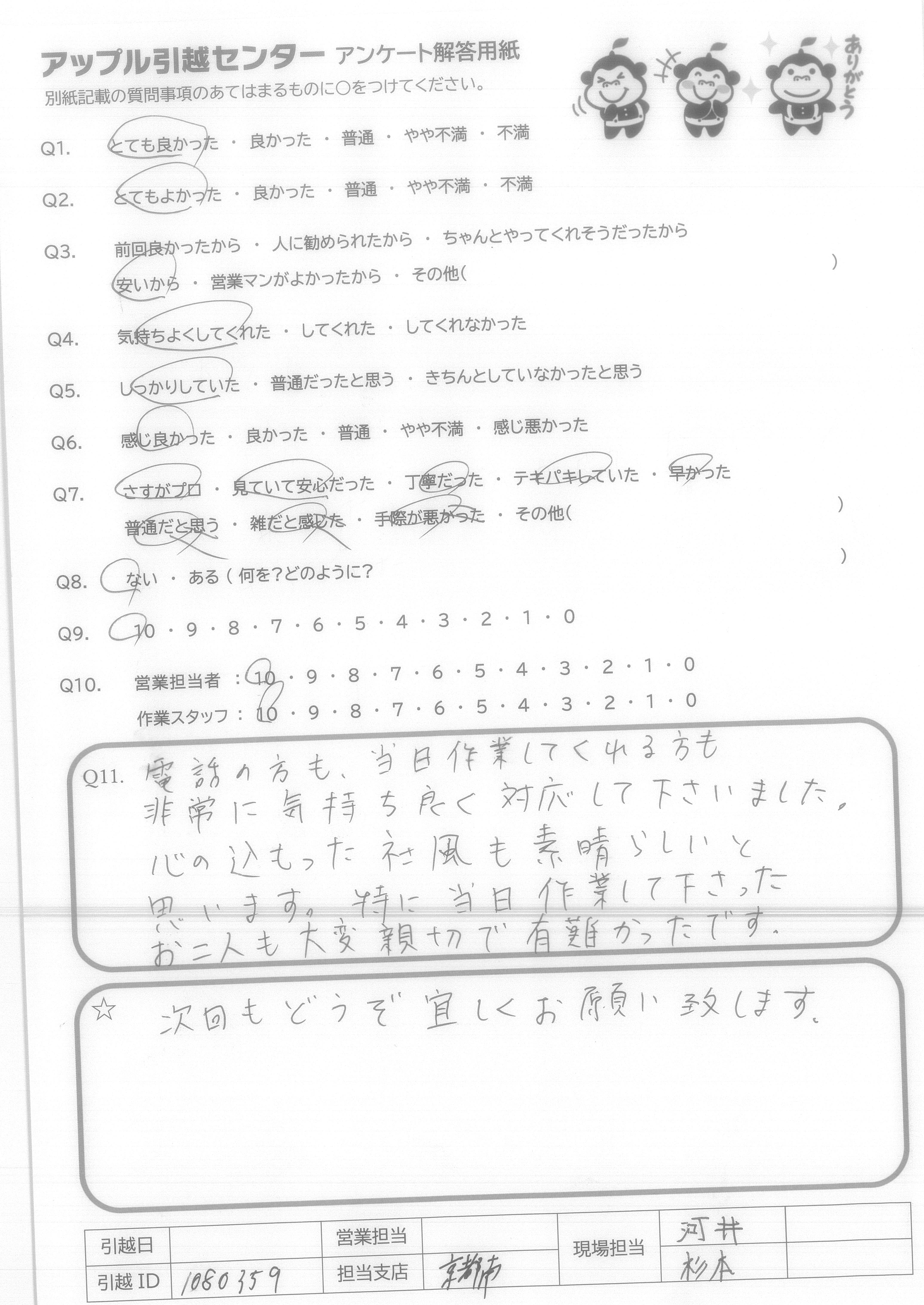 A.スムーズに引っ越しが出来てよかったです。 ありがとうございました。 また機会があればよろしくお願いします。