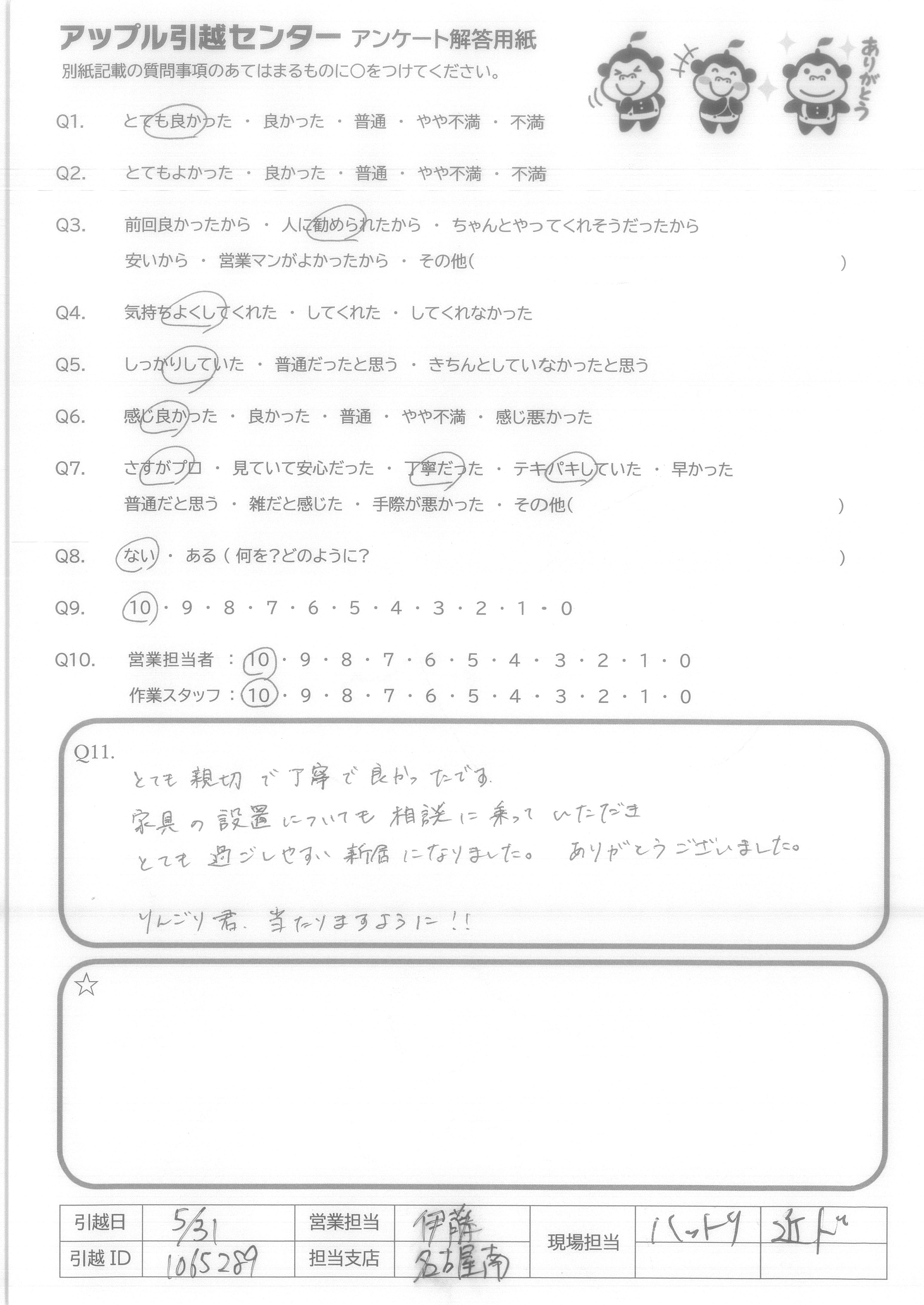 A.とても親切で丁寧で良かったです。 家具の設置についても相談に乗っていただき とても過ごしやすい新居になりました。ありがとうございました。 りんごり君、当たりますように!!!