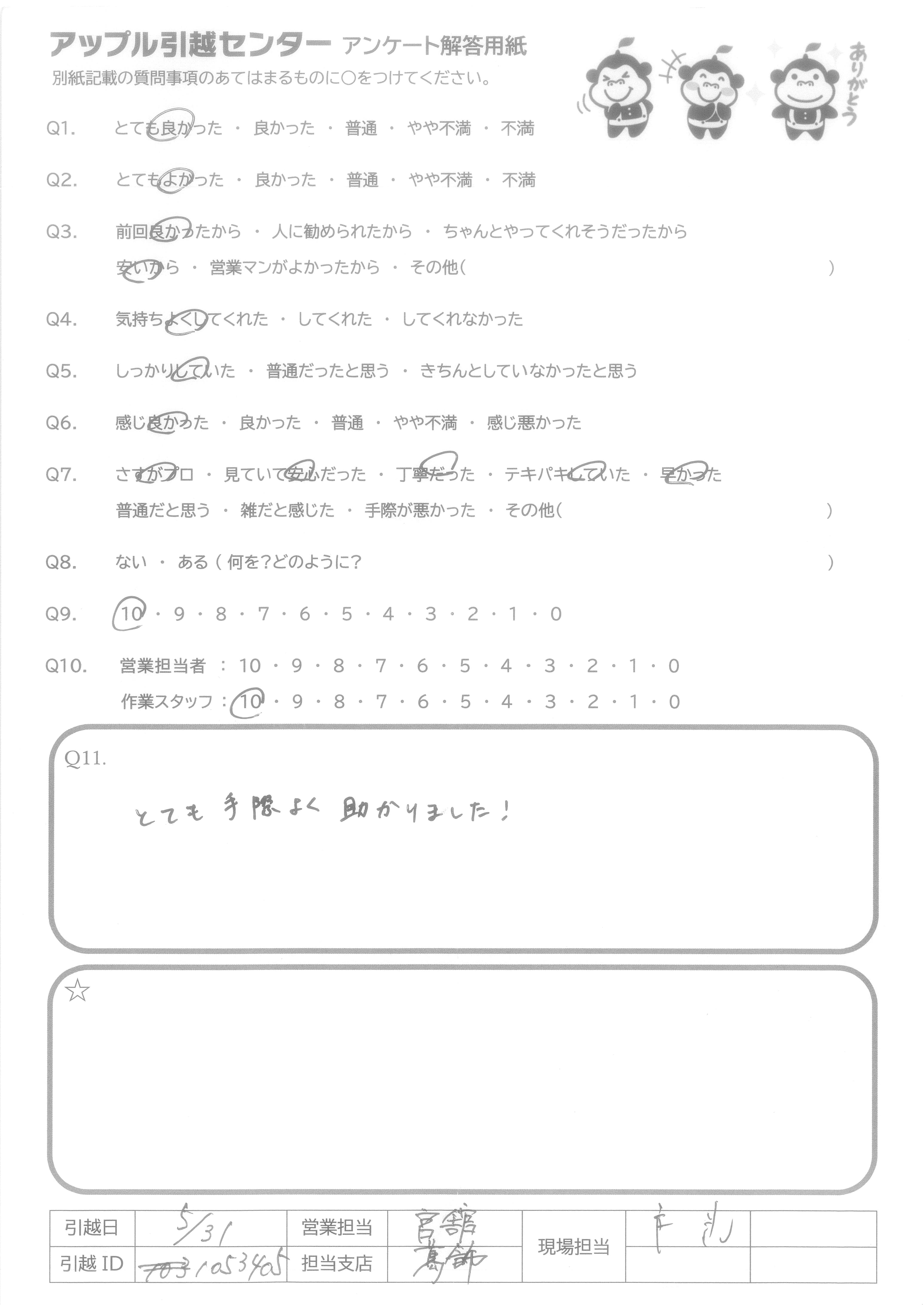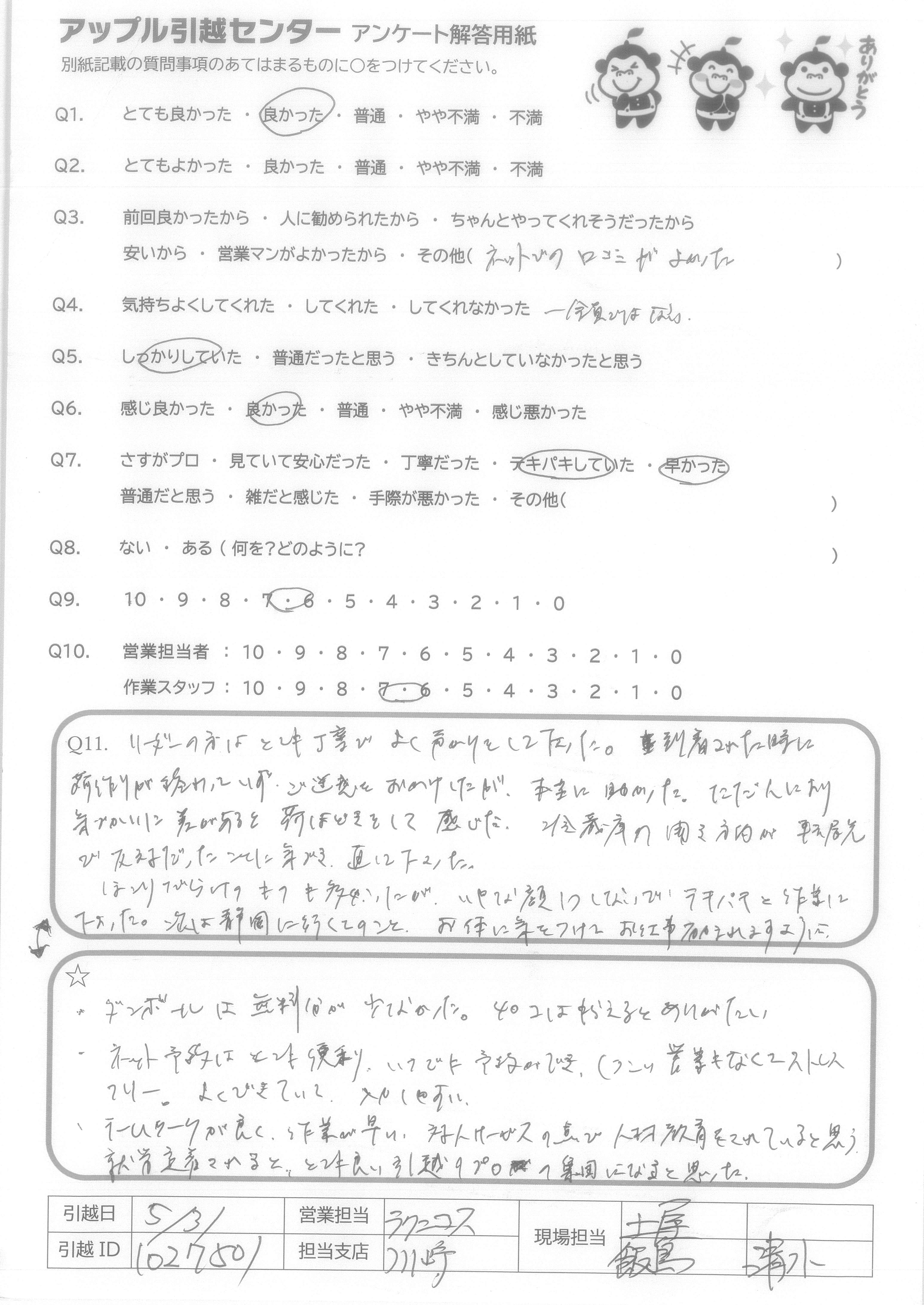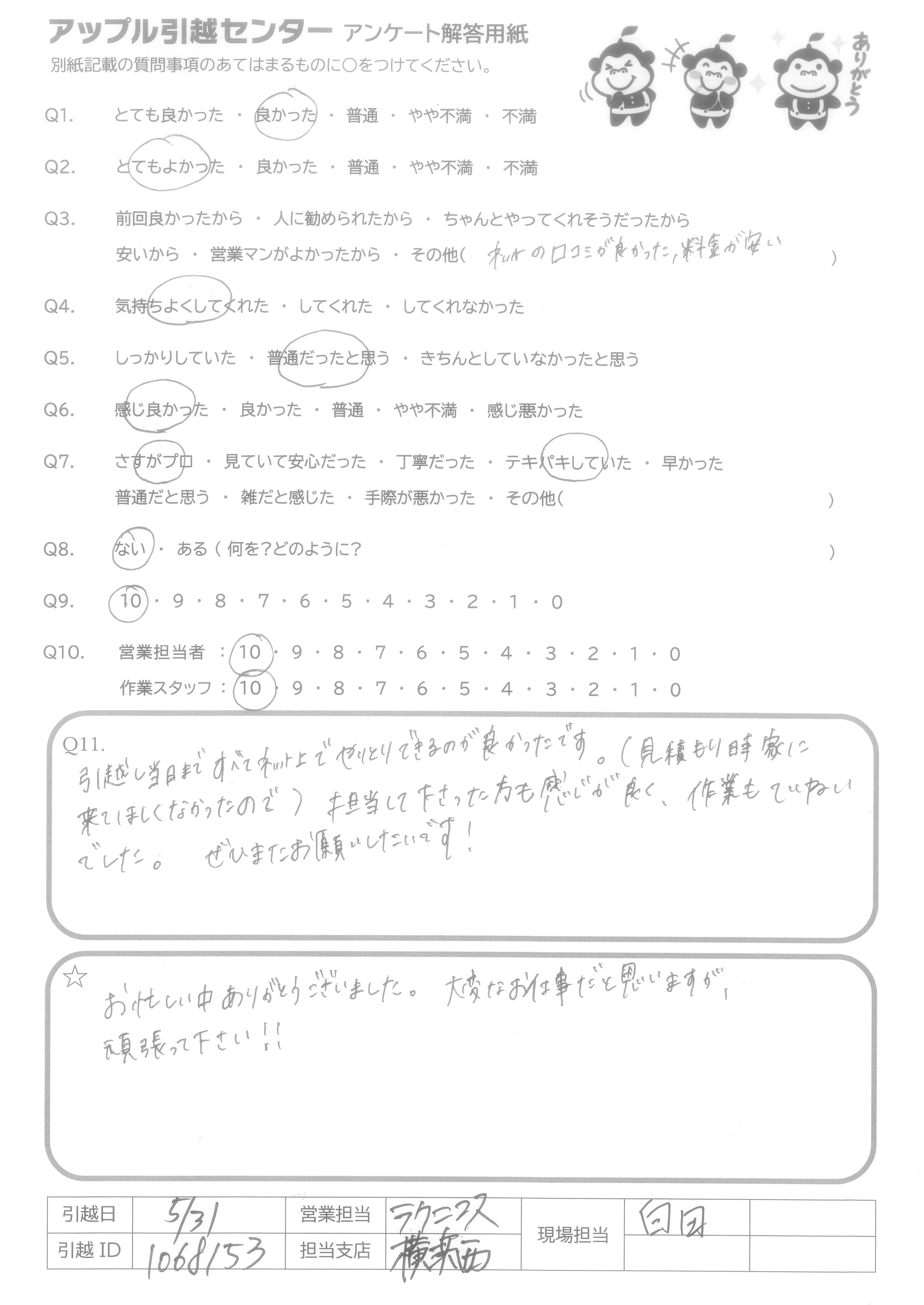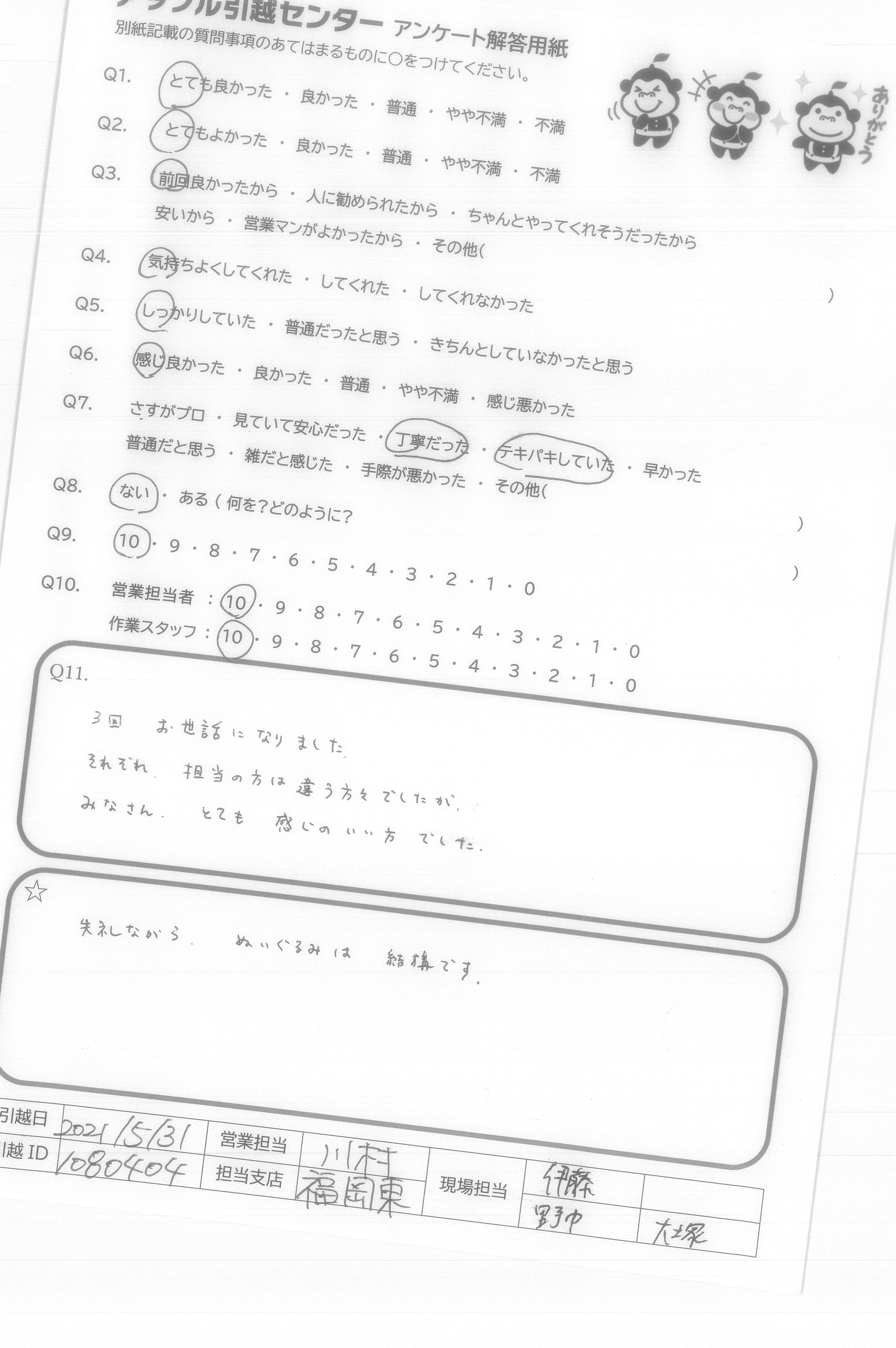 A.横浜店の西村さんがはいていたくつ下がとってもかわいかったです。ぬいぐるみよりくつ下がほしいです。 今回初めてアップルさんに引越依頼しましたが、こんなに晴れやかな気分で引越出来たのは初めてです。感謝いたします。 ありがとうございました!ダンボールもテンションあがりました。