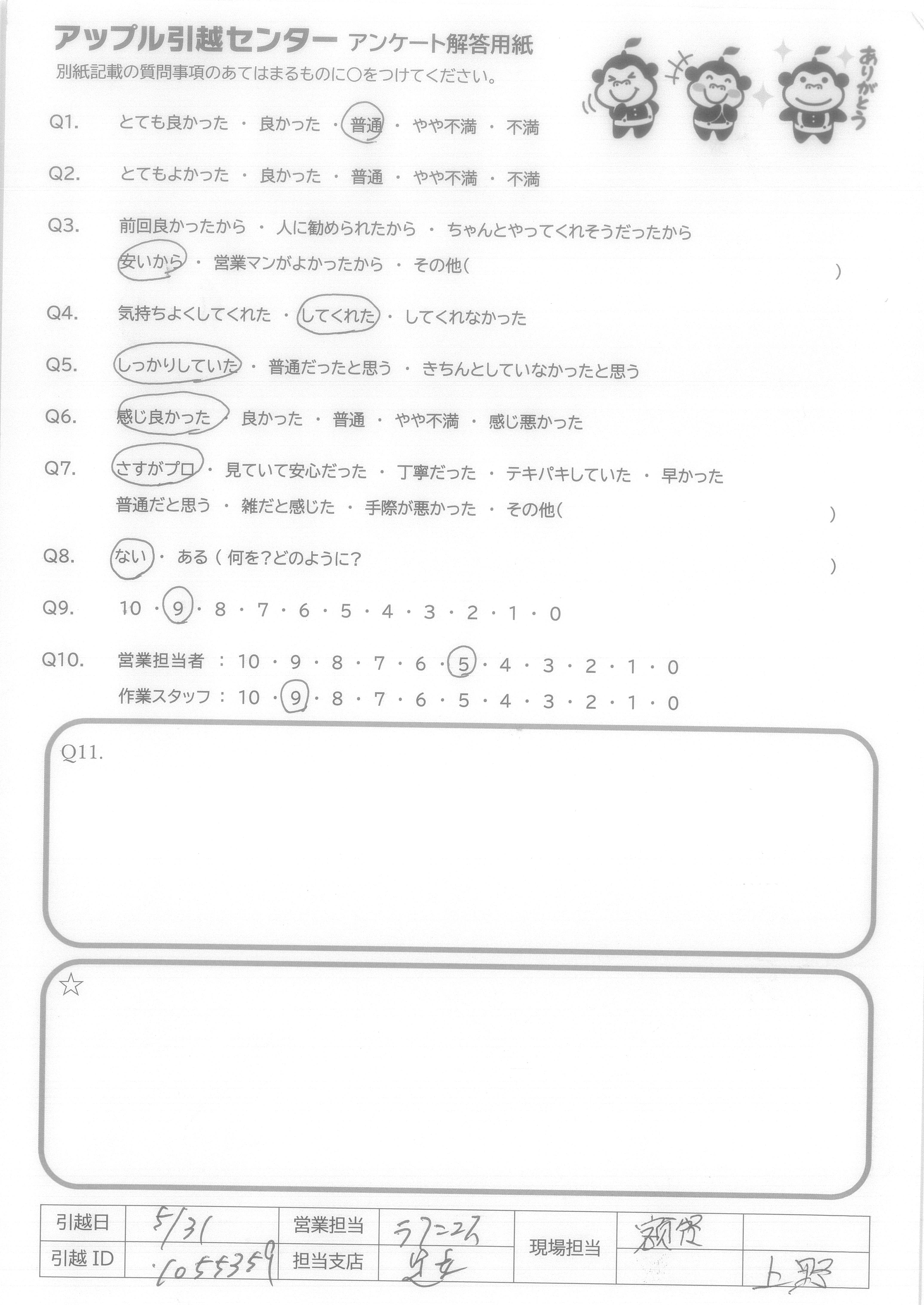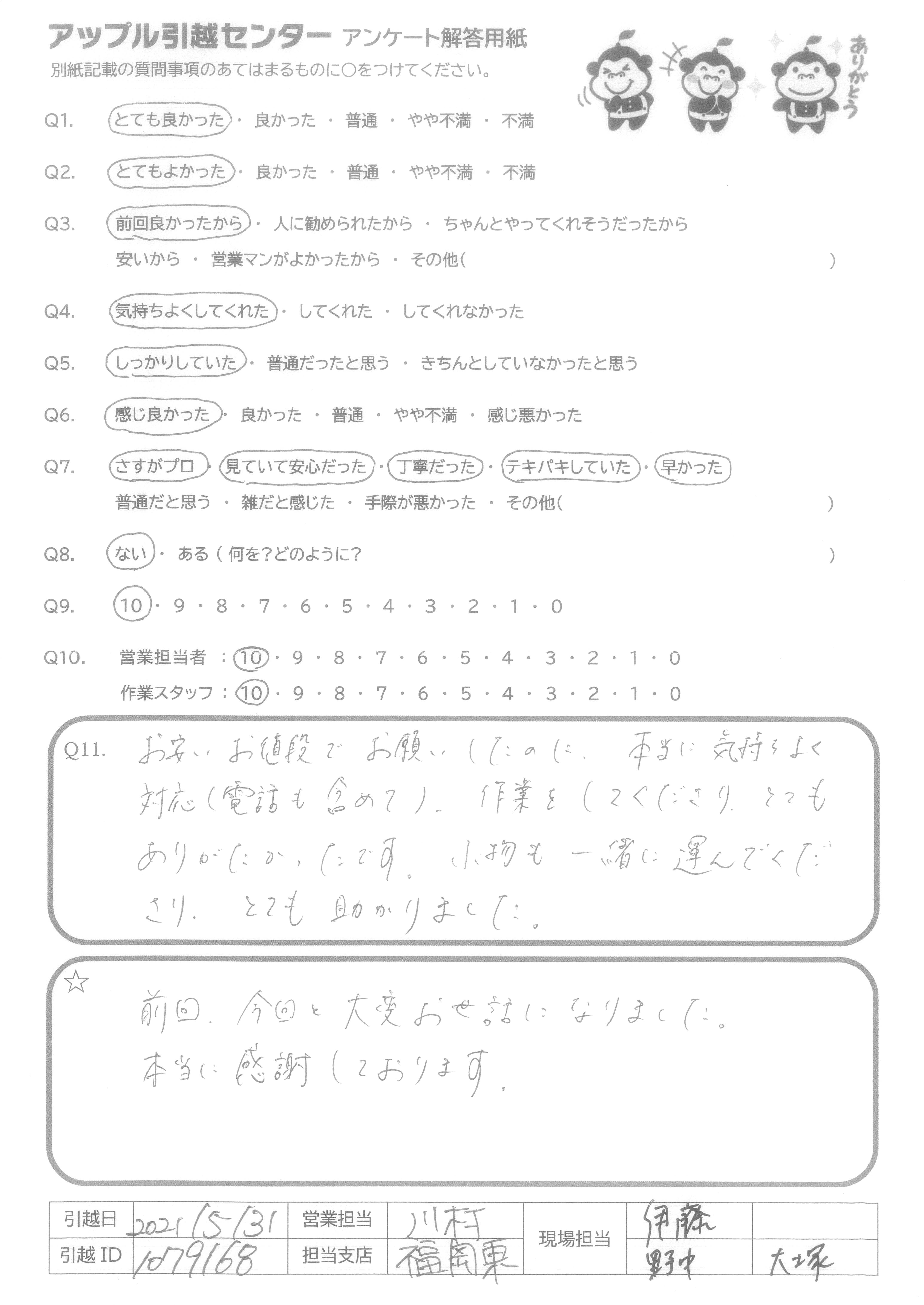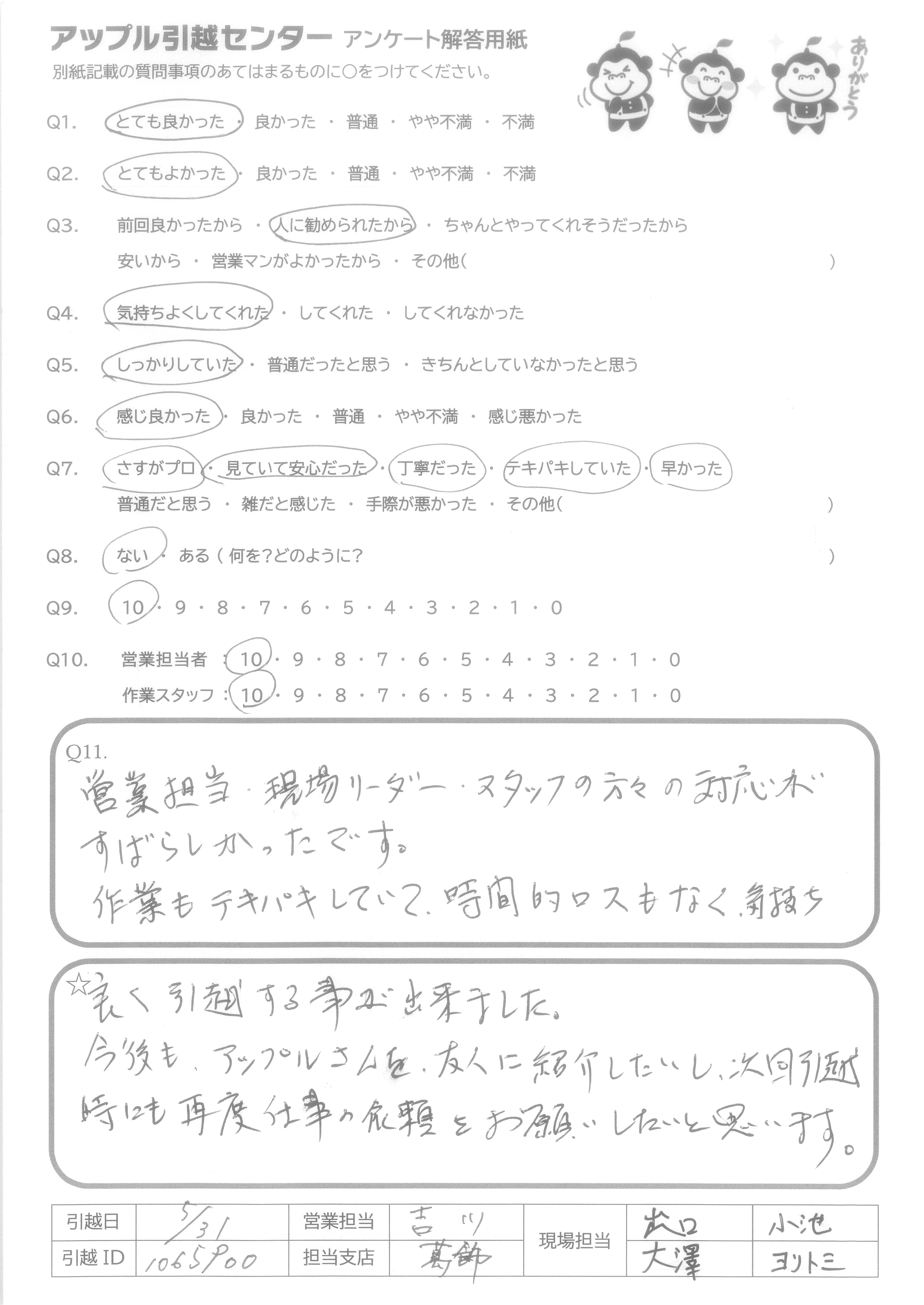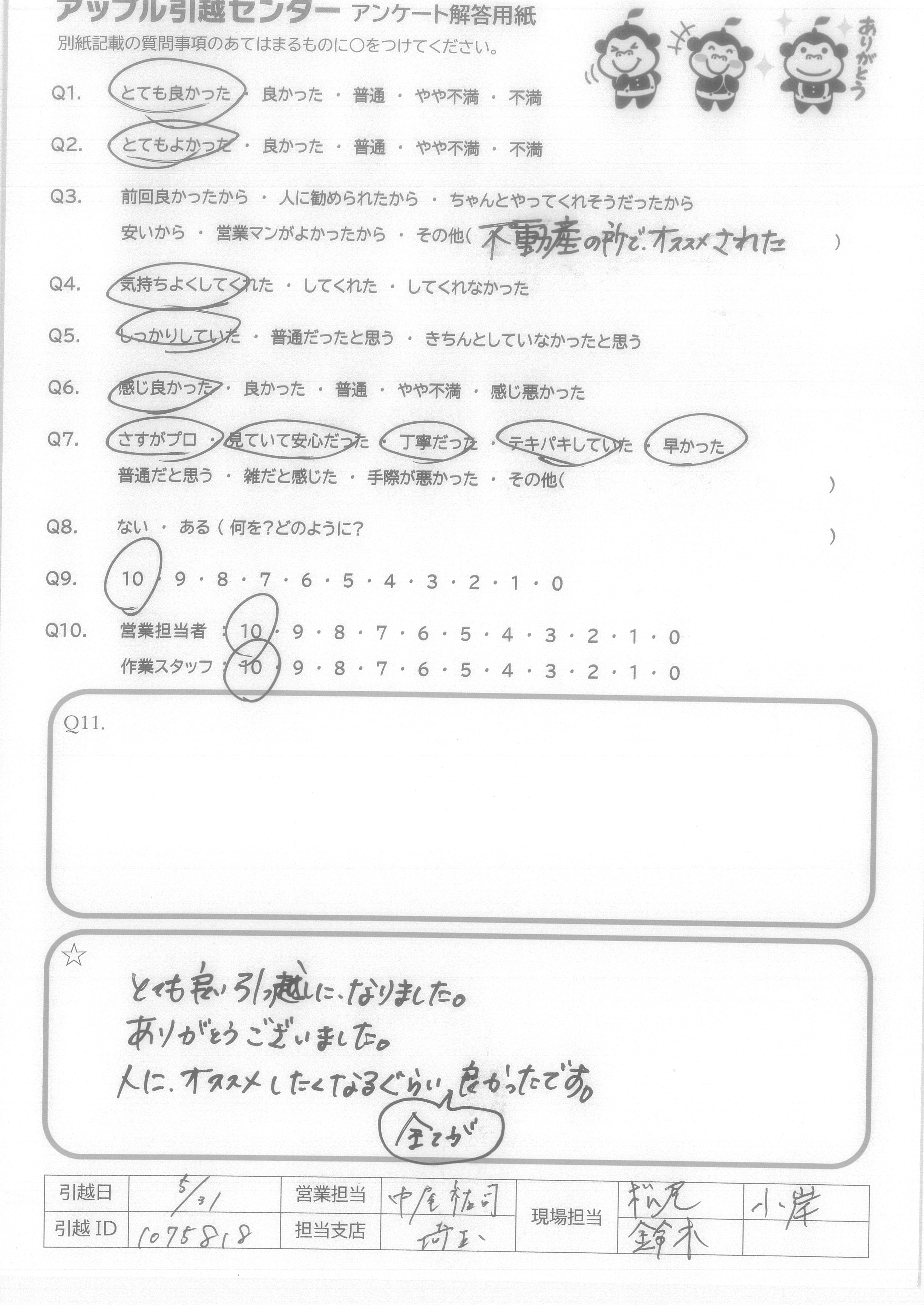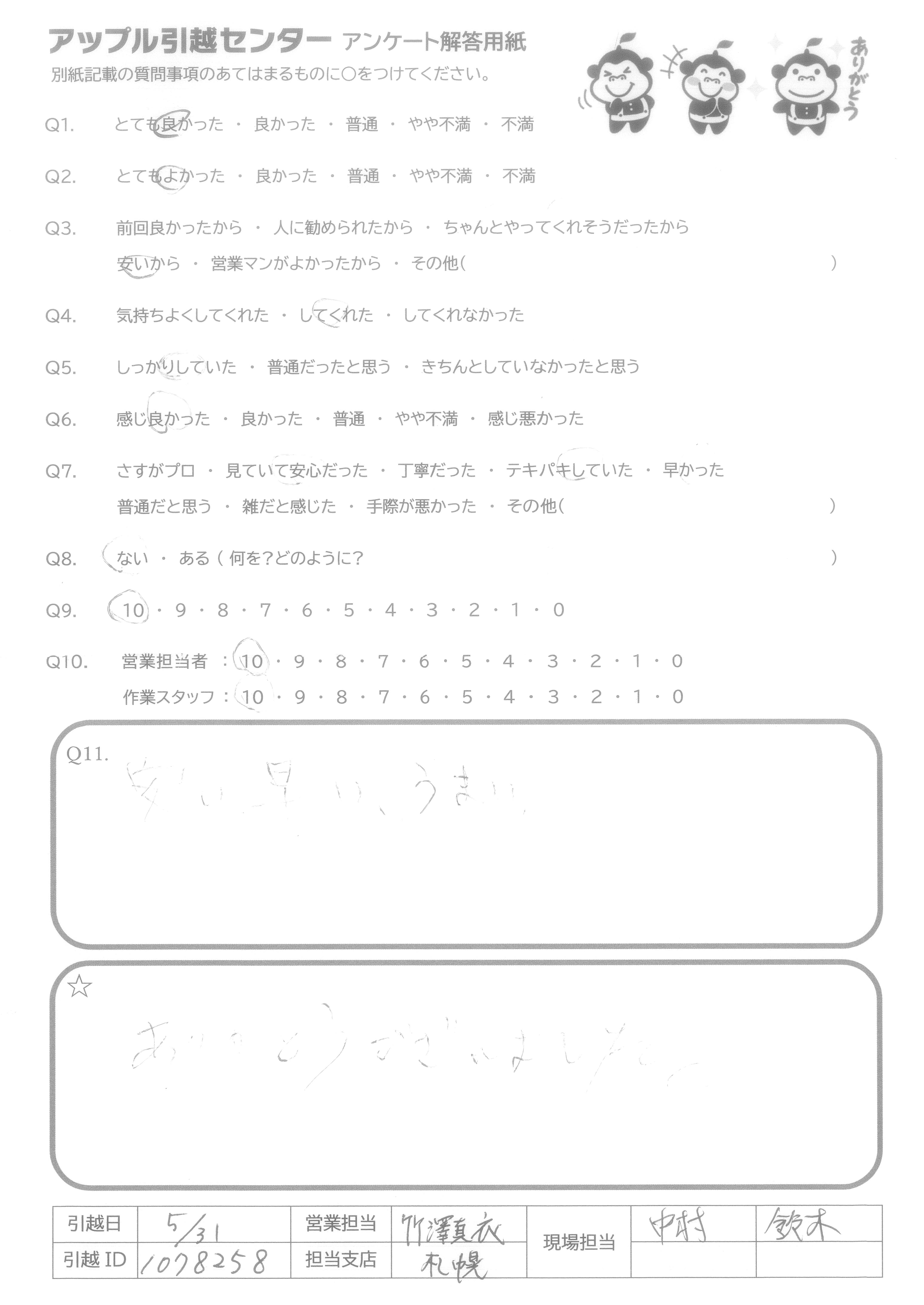 A.横浜店の西村さんがはいていたくつ下がとってもかわいかったです。ぬいぐるみよりくつ下がほしいです。 今回初めてアップルさんに引越依頼しましたが、こんなに晴れやかな気分で引越出来たのは初めてです。感謝いたします。 ありがとうございました!ダンボールもテンションあがりました。