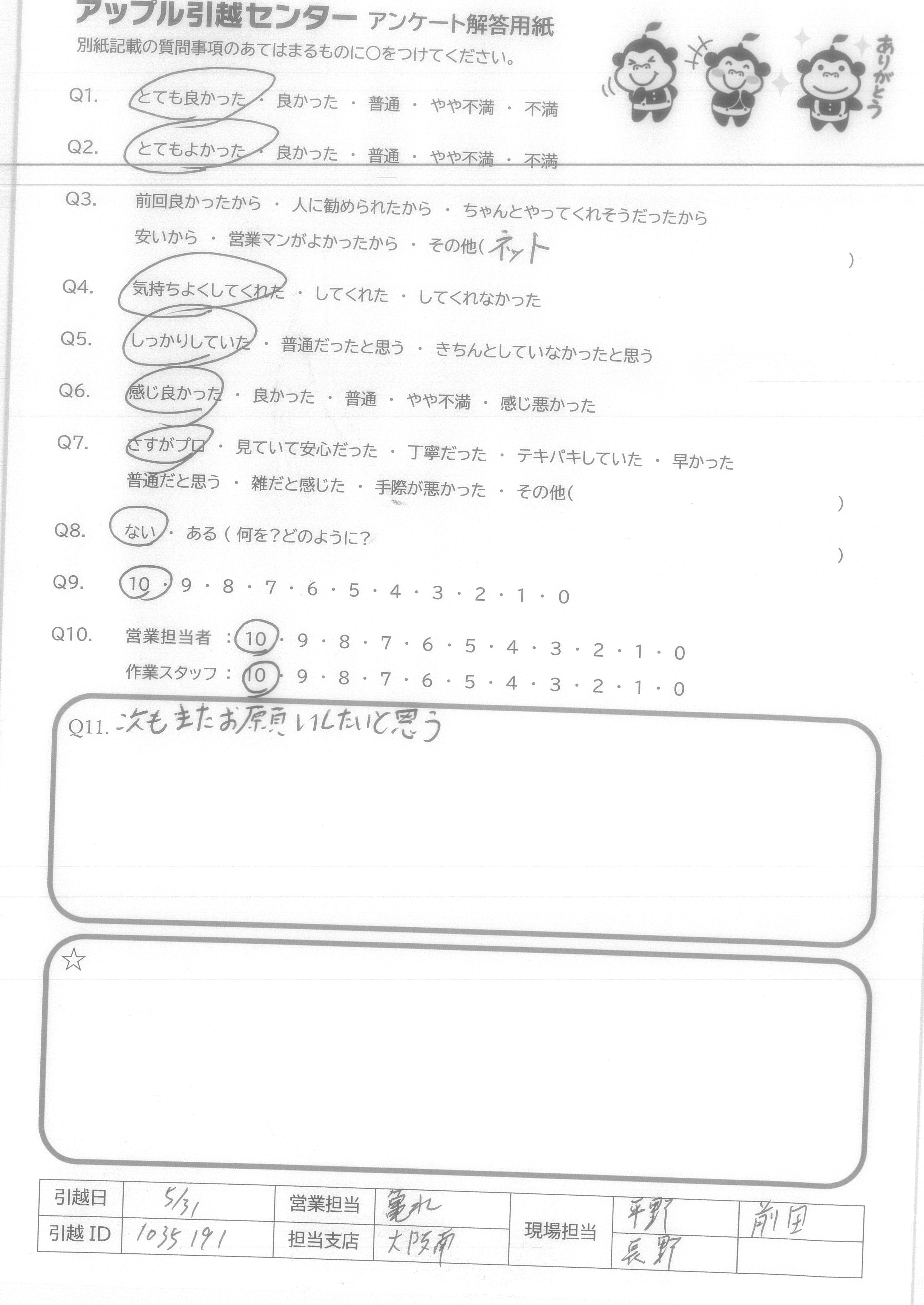 A.非常に気持ちの良い引越しでした。ありがとうございました。