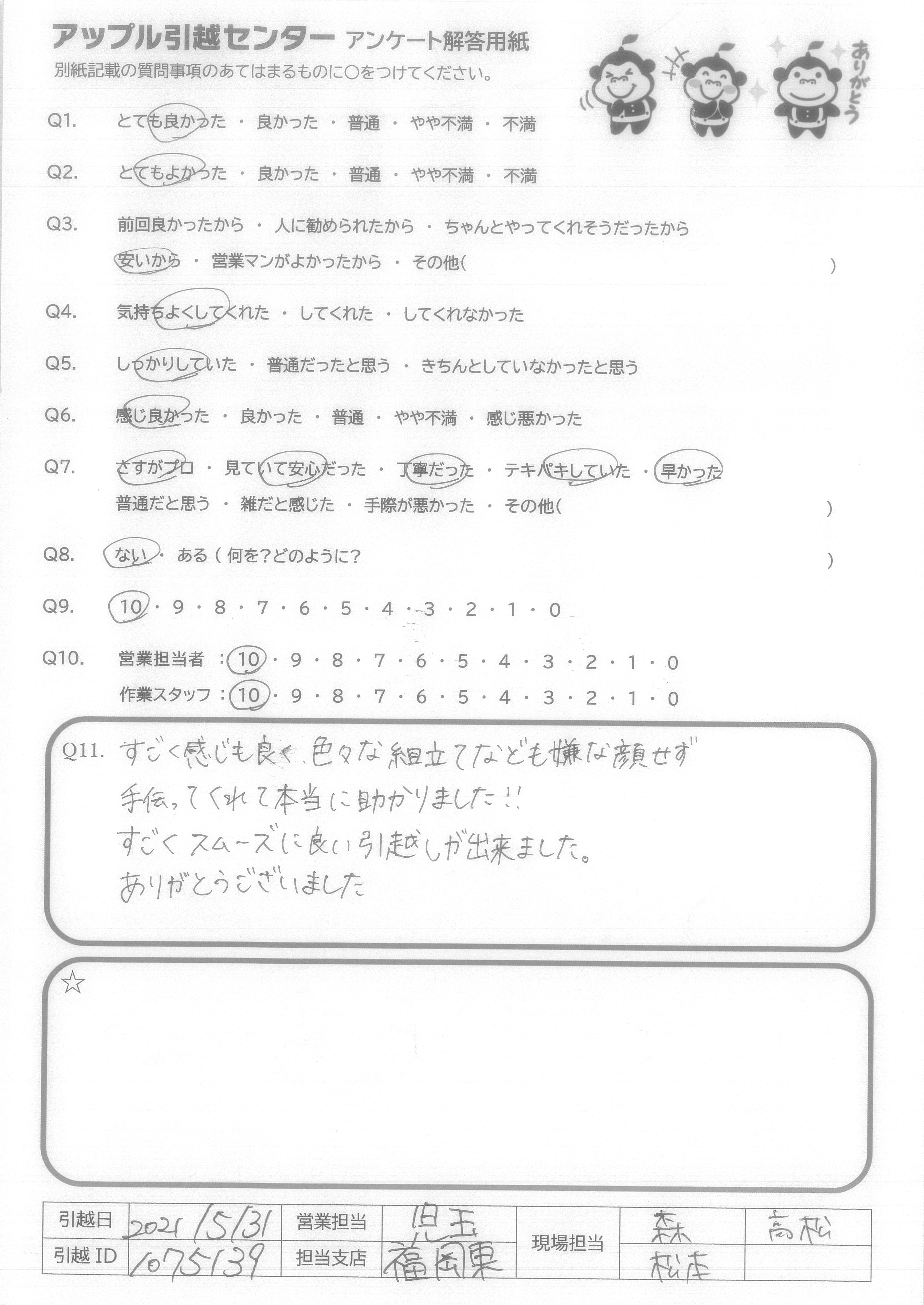 A.とても良い引っ越しになりました。 ありがとうございました。 人にオススメしたくなるぐらい全てが良かったです。