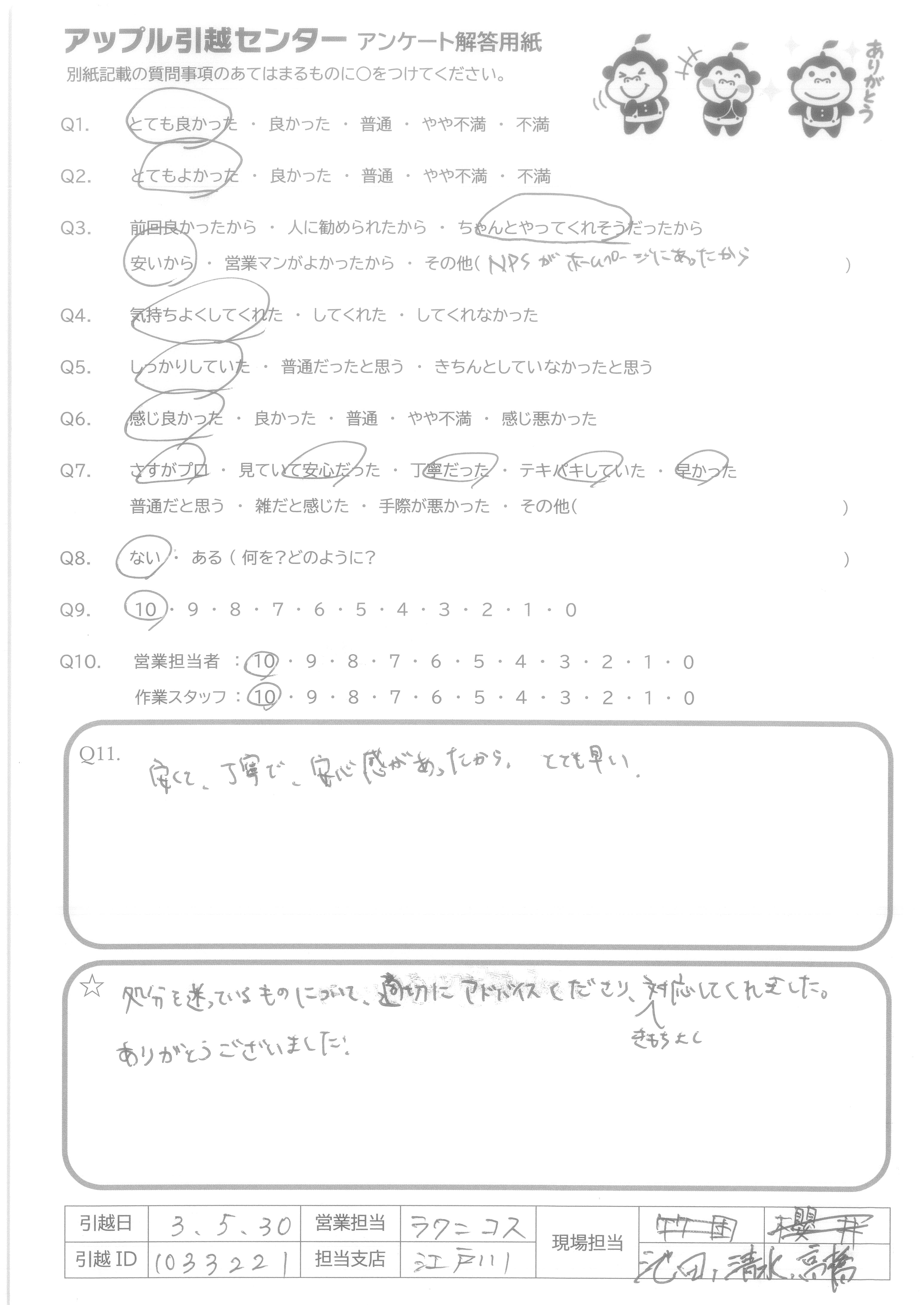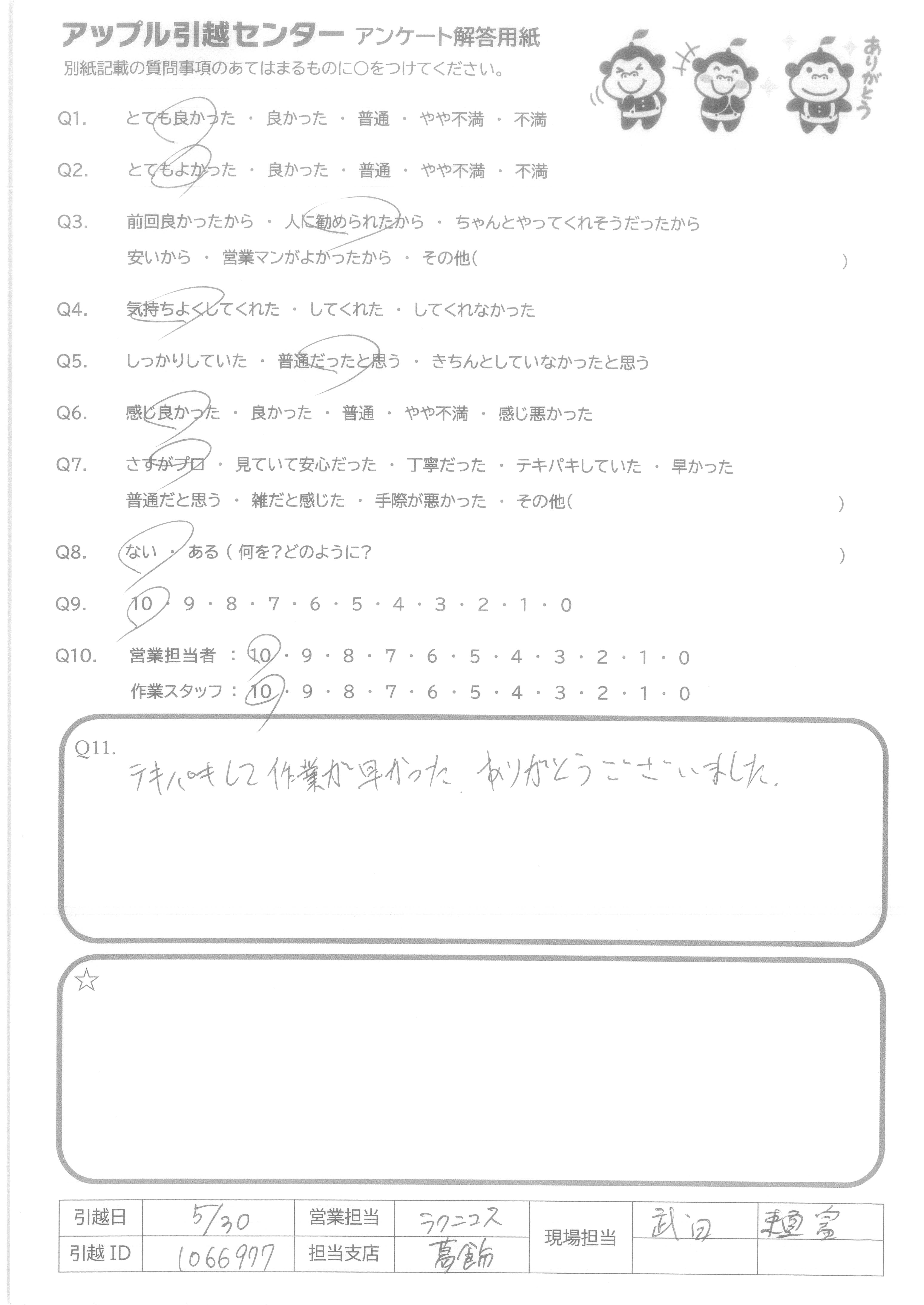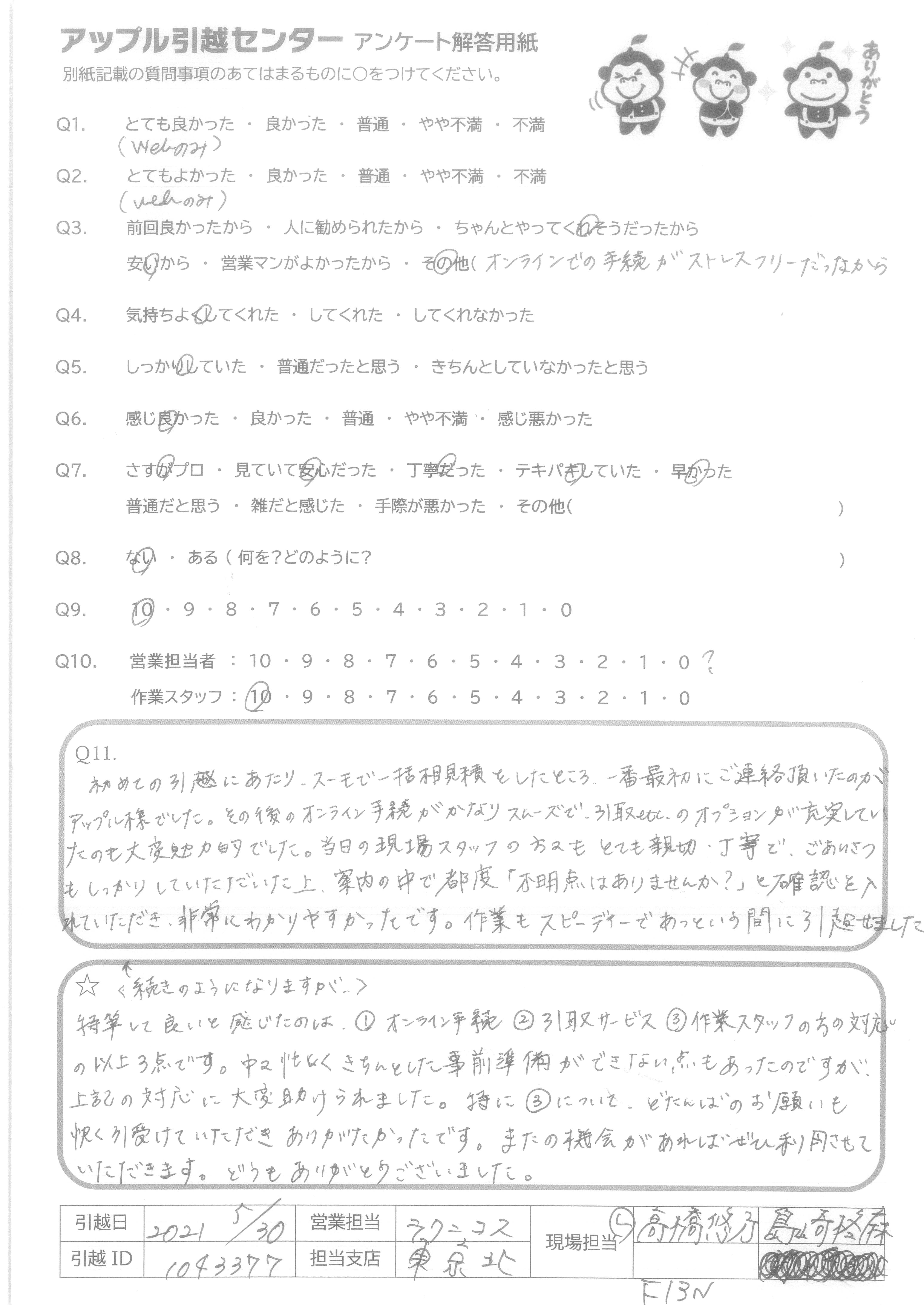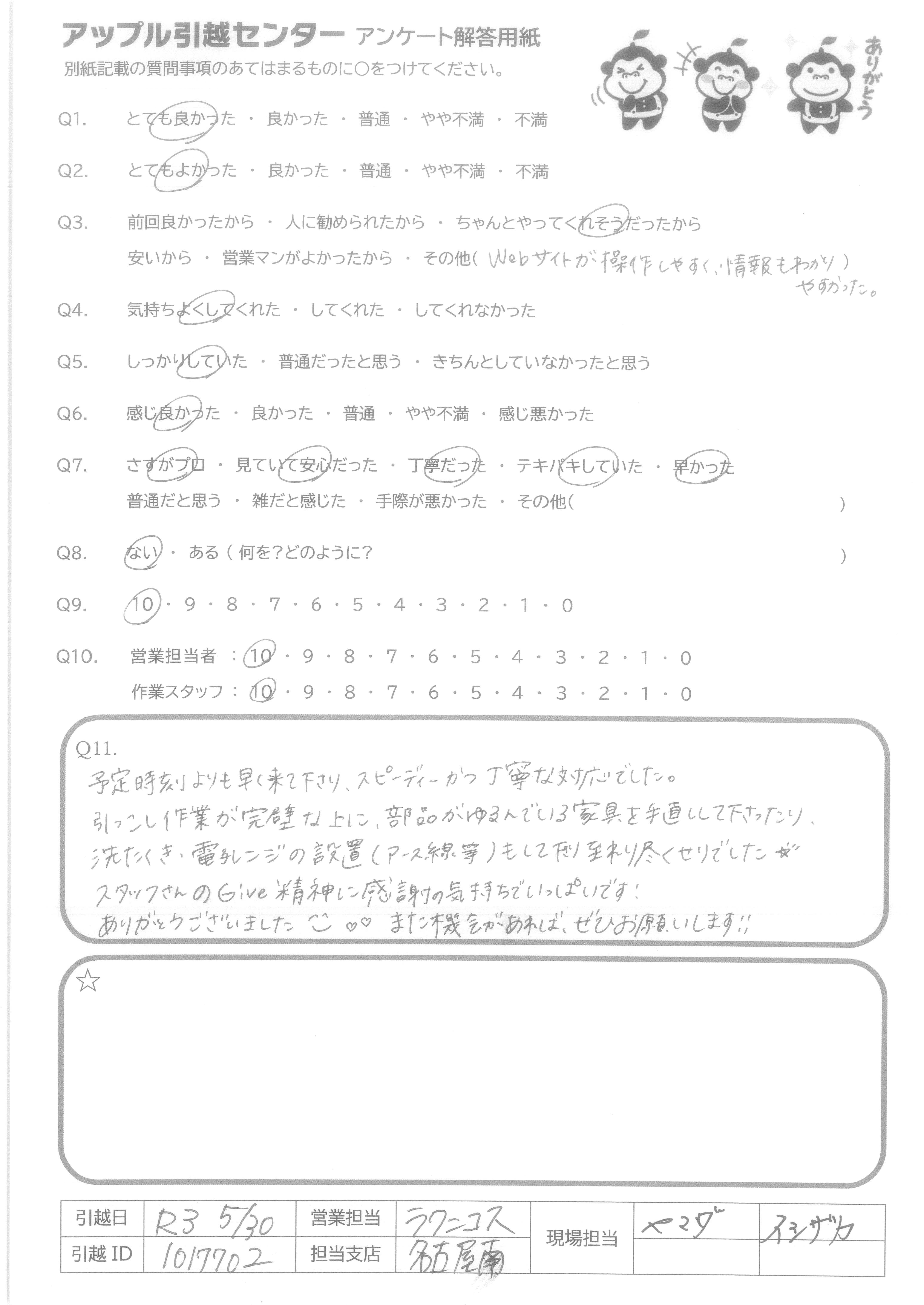 A.初めての引越にあたり、スーモで一括見積をしたところ、一番最初にご連絡頂いたのがアップル様でした。その後のオンライン手続きがかなりスムーズで、引取etcのオプションが充実していたのも大変魅力的でした。当日の現場スタッフの方々もとても親切・丁寧で、ごあいさつもしっかりしていただいた上、家内の中で都度「不明点はありませんか?」と確認を入れていただき、非常にわかりやすかったです。作業もスピーディーであっという間に引越せました。