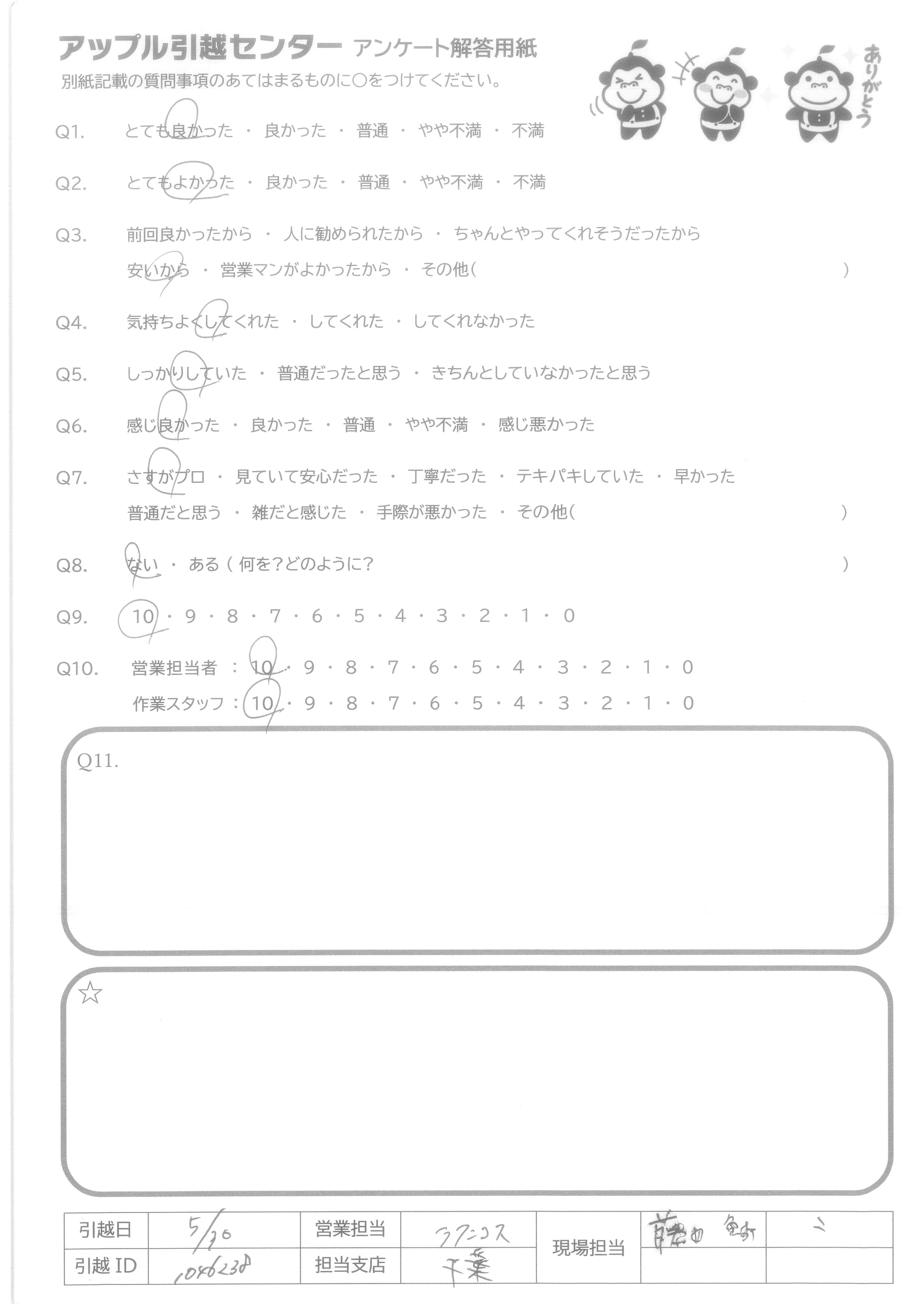 A.このたびは大変お世話になりました。 仕事も気配りも素晴らしいスタッフさんで無事に気持ち良く引越しがおわりました。 次に引越しの機会があればまたアップルさんにお願いしたいですし、同じ担当の方にお願いしたいです。ありがとうございました。