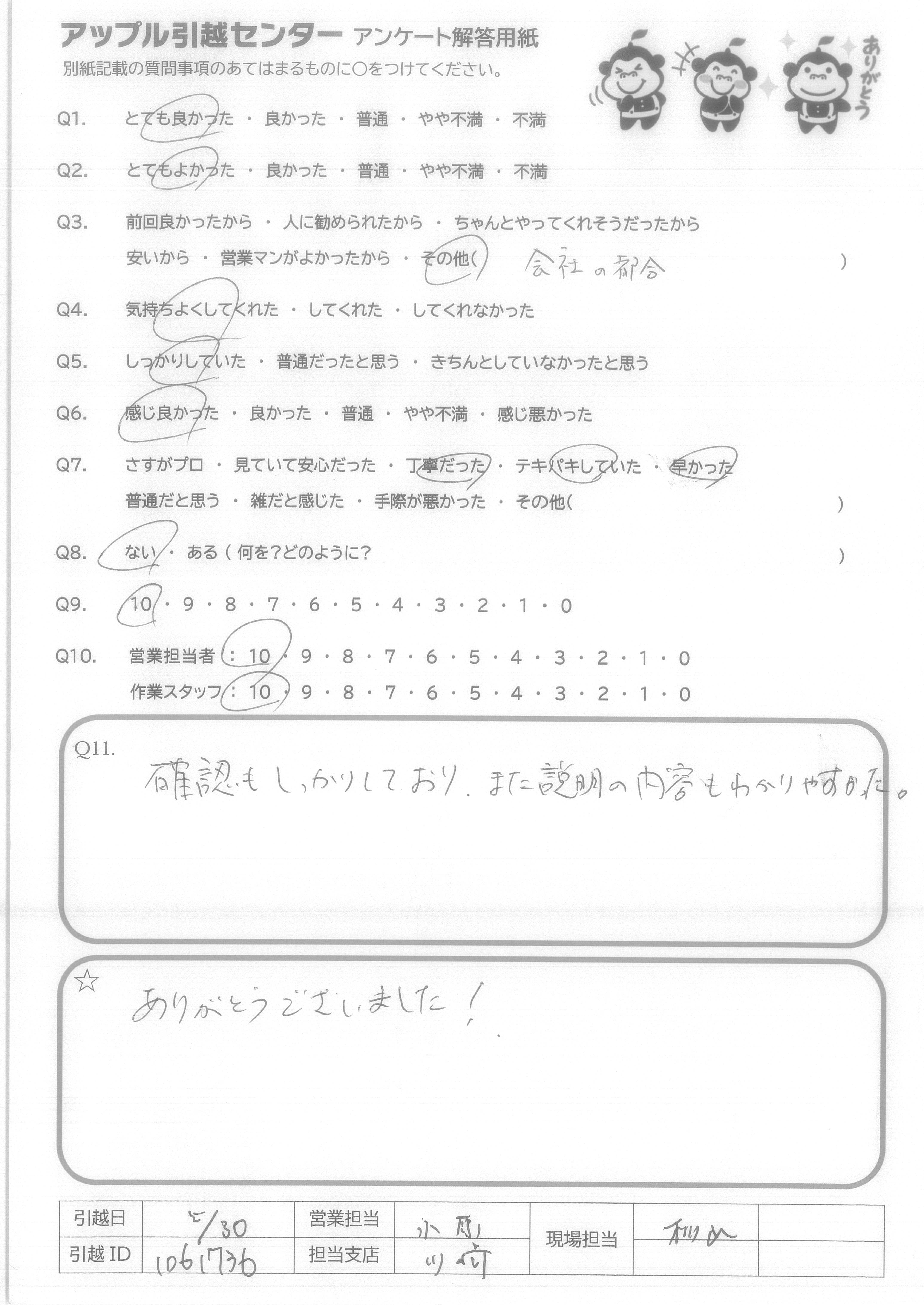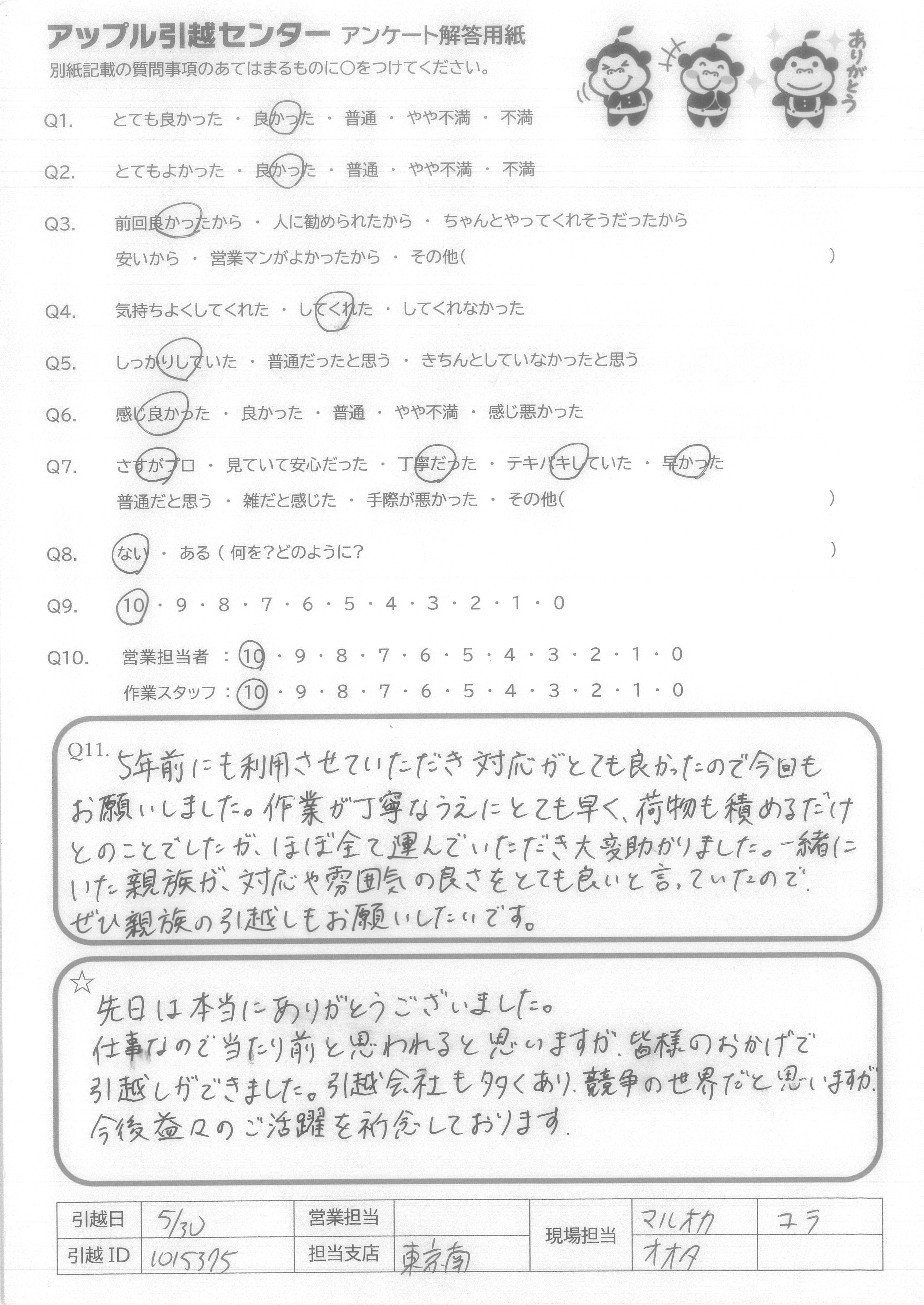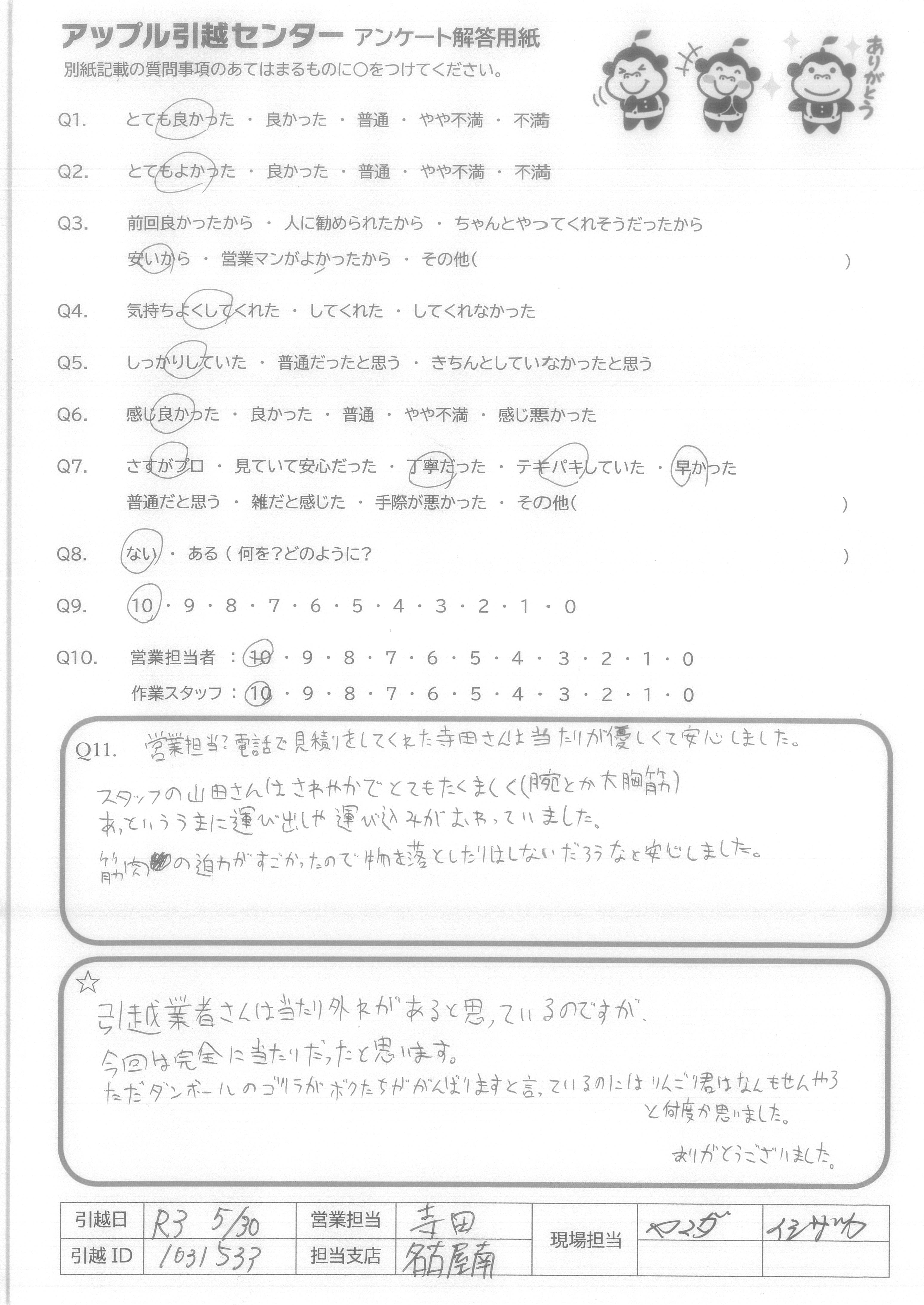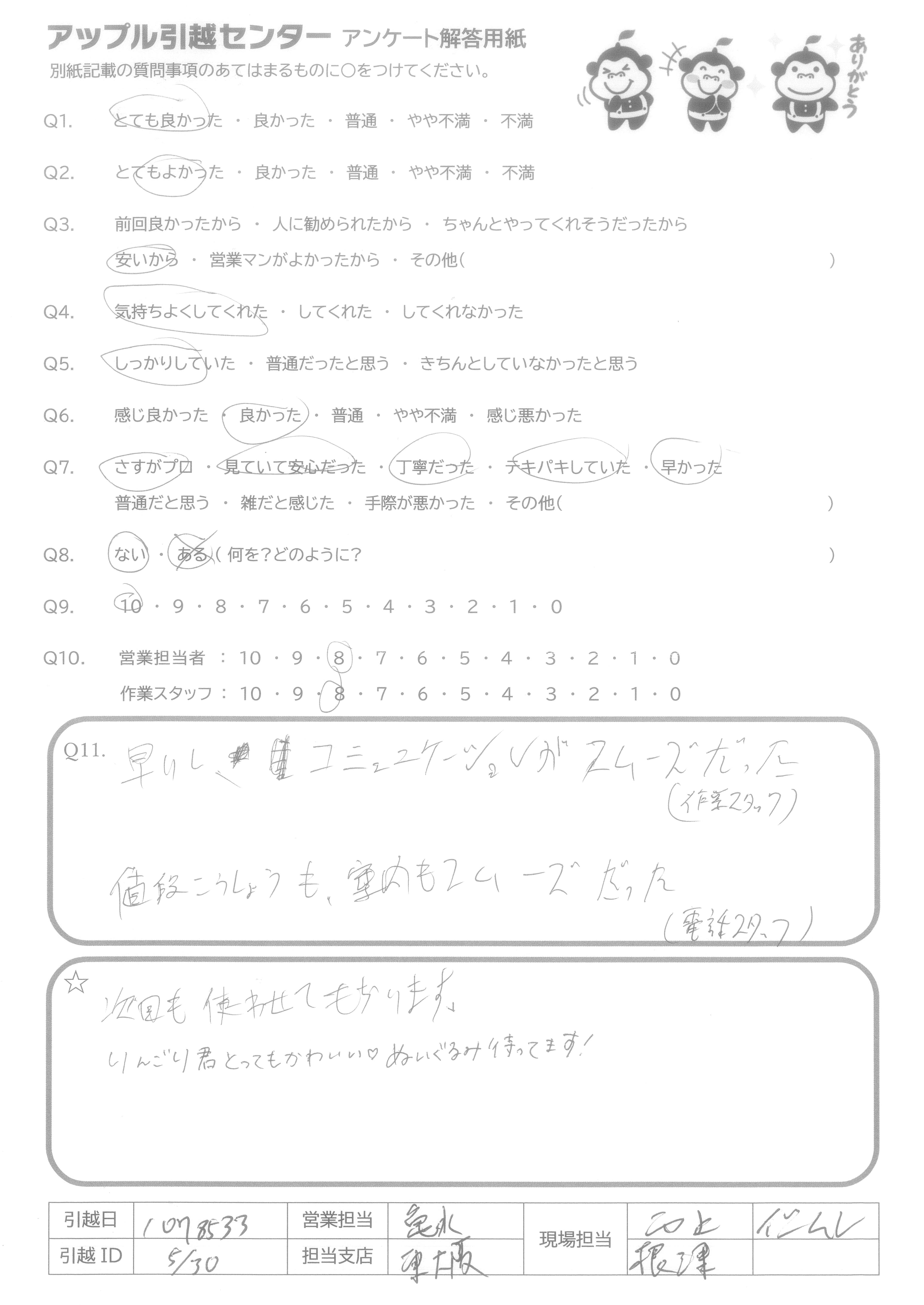 A.このたびは大変お世話になりました。 スタッフのみなさんが優しくてていねいで気持ちよく引越しすることができました!!りんごりくんのキャラクターもかわいくて、ダンボールを見て荷づくりがんばろう!と思いました。当日スタッフの方がはいていたくつ下カバーもかわいかったです また引越しするときがあればぜひアップルさんにお願いしたいですし、同じご担当の方がきて下さればうれしいです。このたびは本当にありがとうございました!!